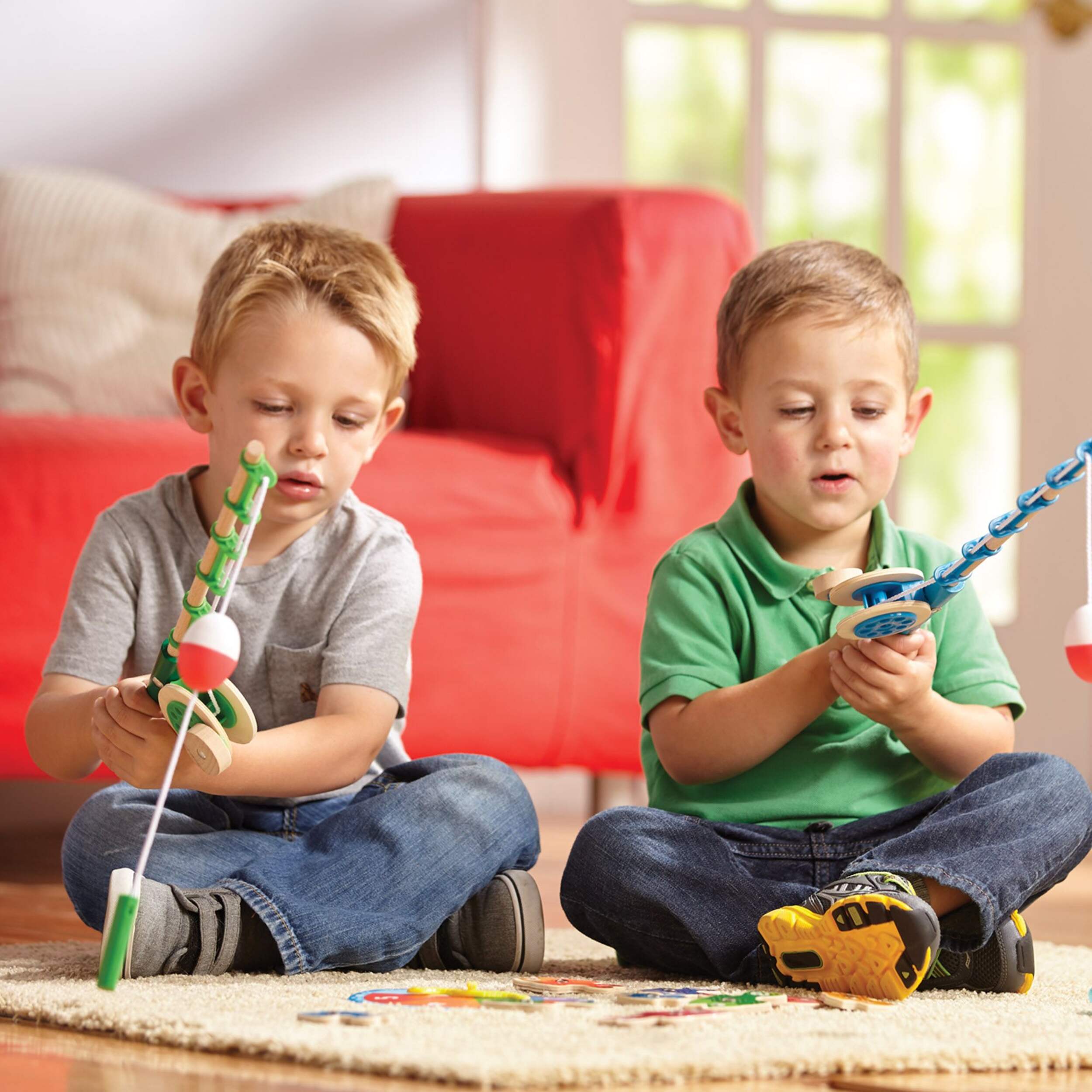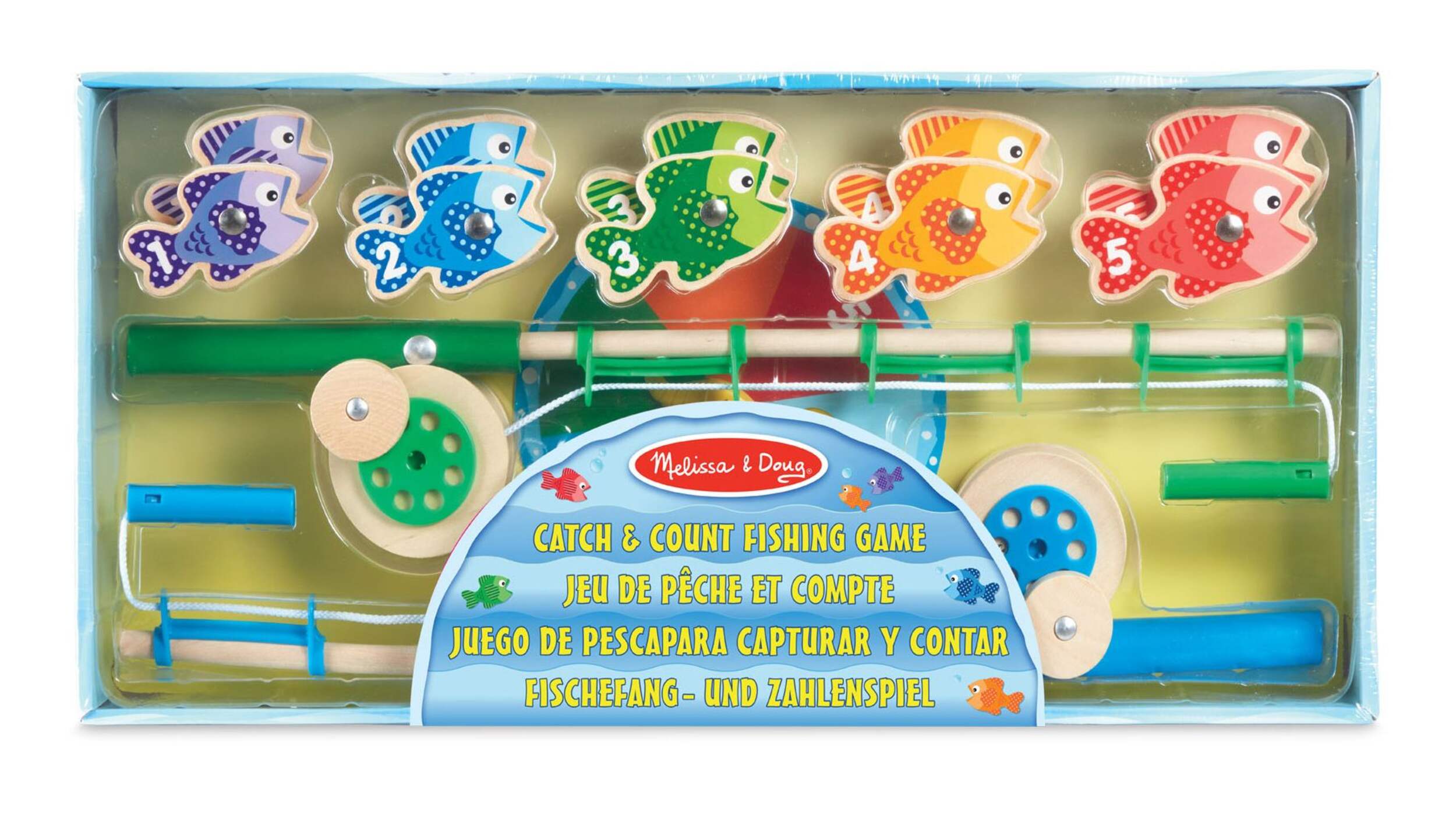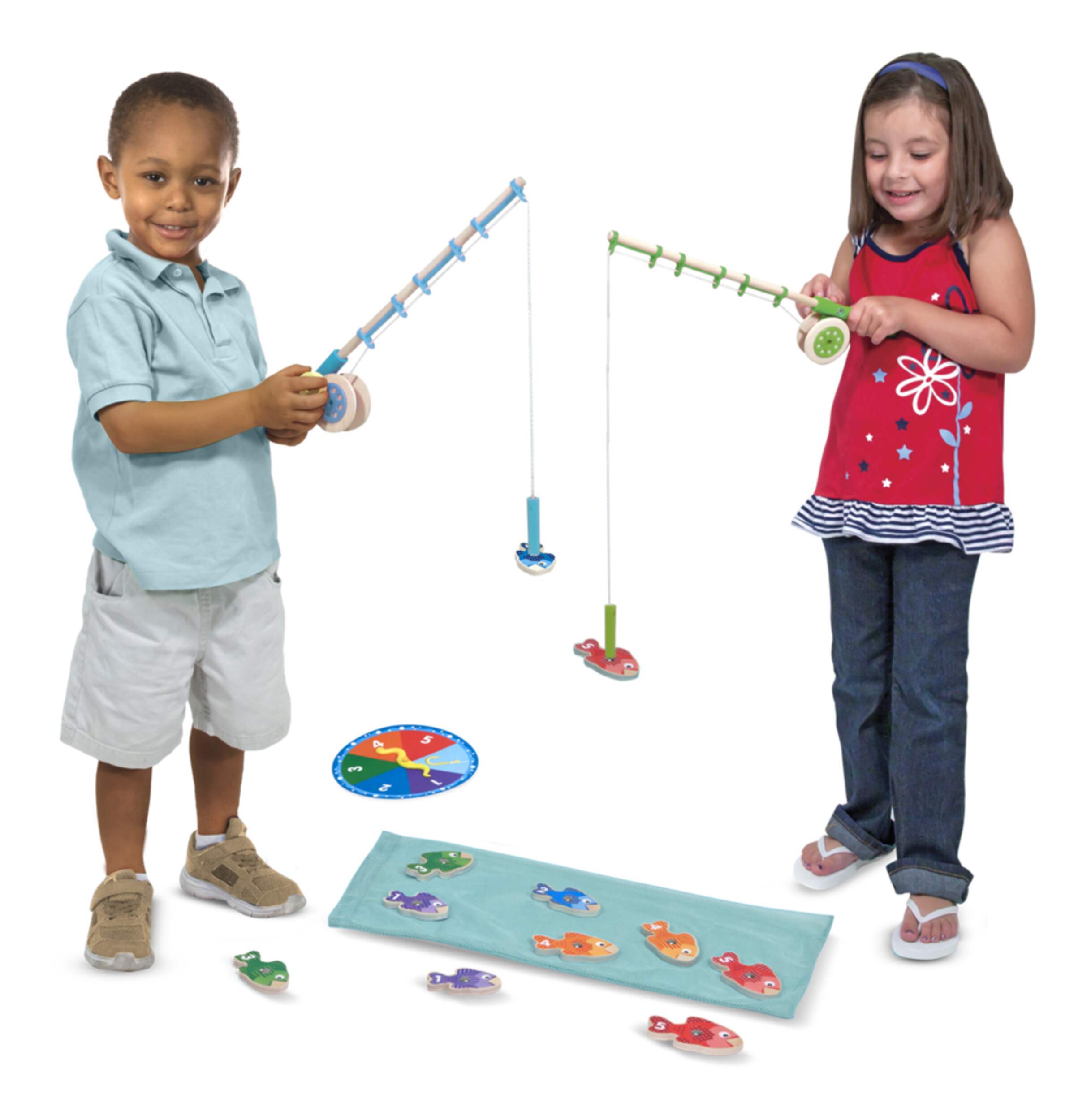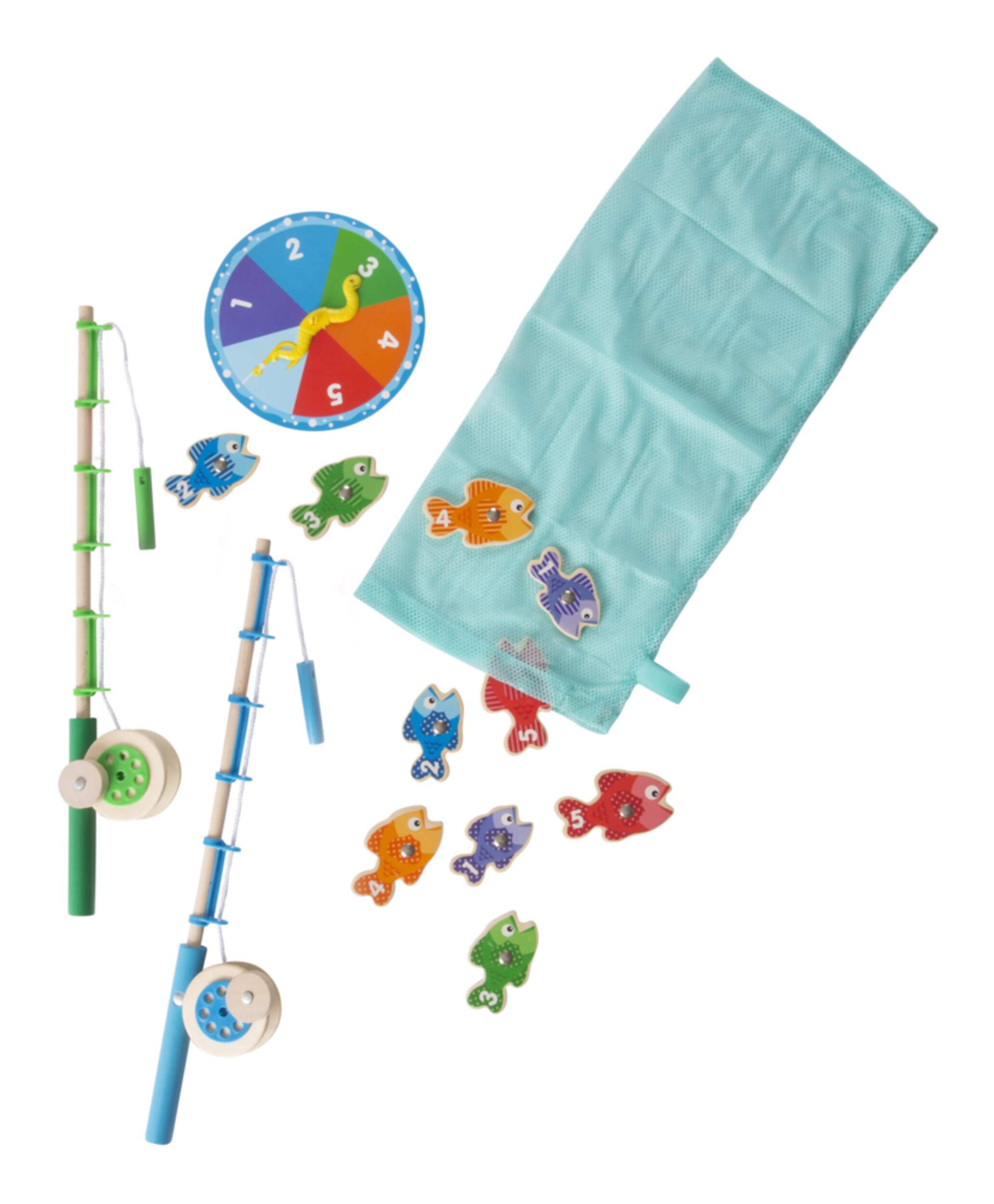 Catch some laughs and learning with this wooden magnetic play set--complete with working wind-up reel! The 10 magnetic fish are numbered and patterned to enrich matching, sorting, and counting activities, and two wooden rods make collecting them a blast! Kids can use the spinner to play as a game, or just have fun collecting the pieces over and over again. Either way, there's plenty of fun in this sea!