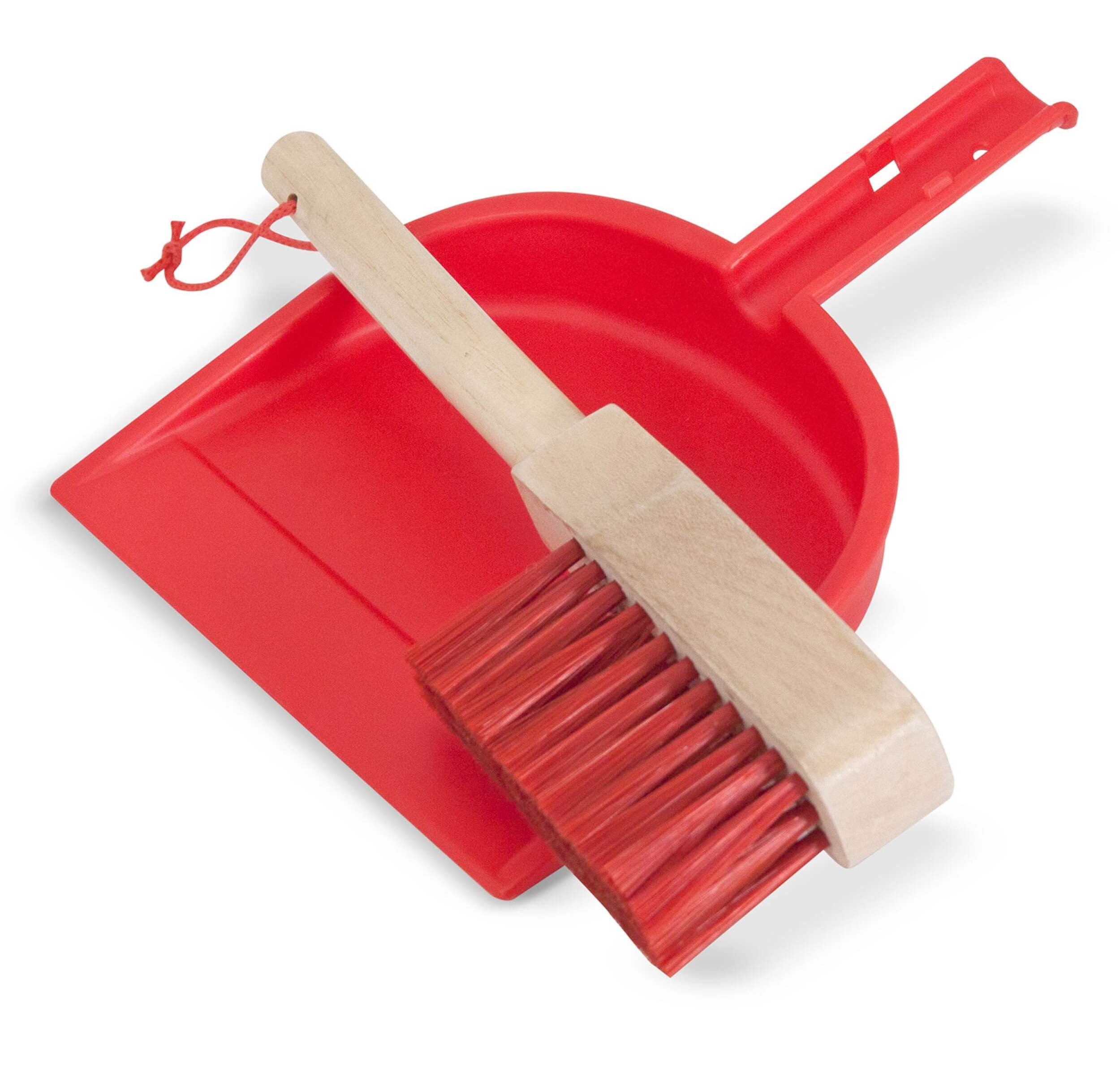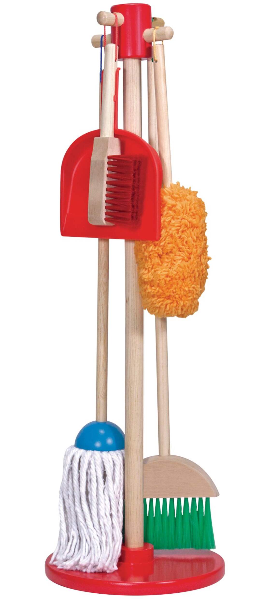 This six-piece play set gives kids all the housekeeping tools they need to keep it clean! Sized just for kids and built to last, the broom, mop, duster, dust pan, and hand brush are comfortable to use and easy to store--just hang them from the sturdy cords onto the included stand for neat, compact storage. (The dust pan can also snap onto any of the handles.) Natural-wood handles add durability and a classic look; bright pops of colour keeps lots of fun in the mix!