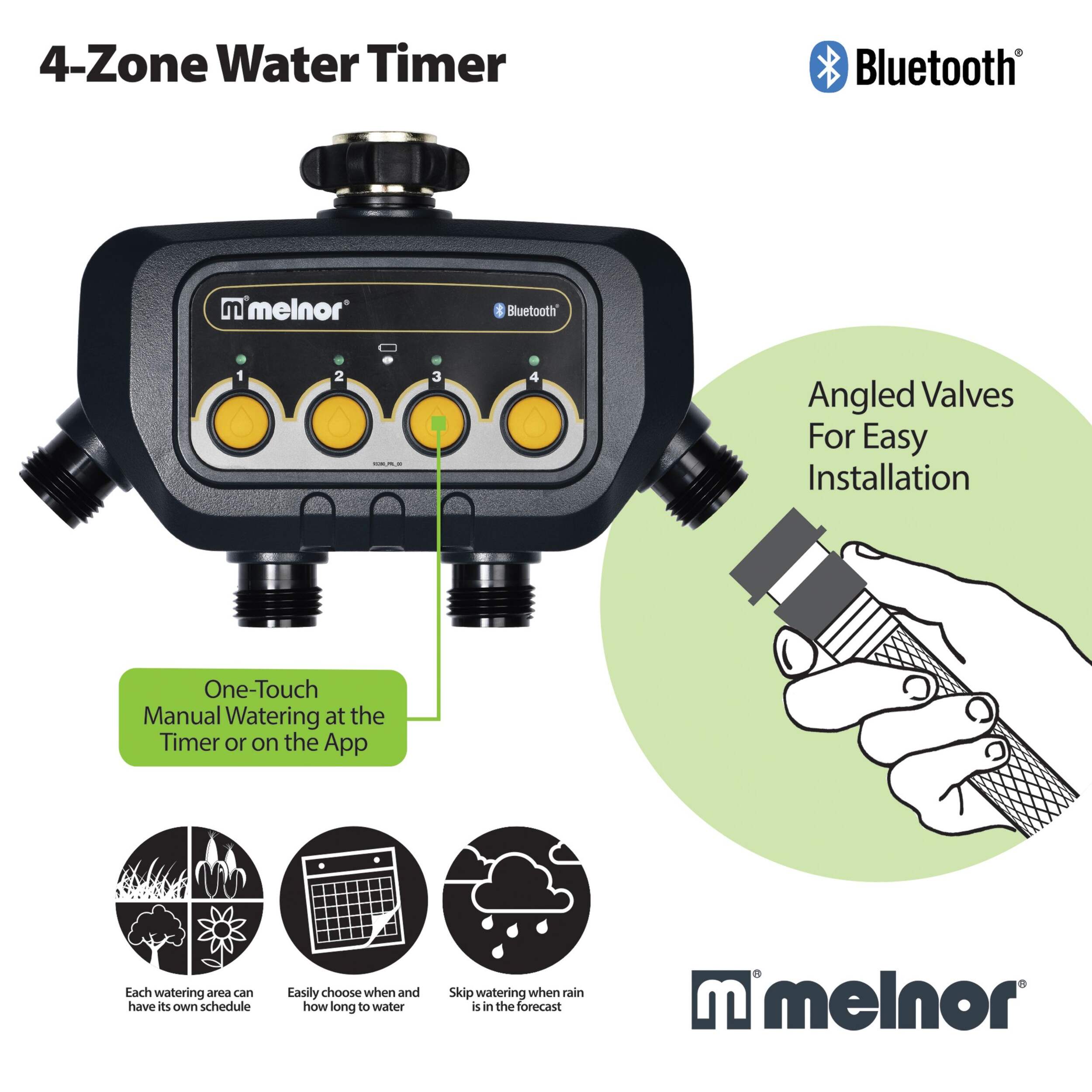 Garden care is simpler with the Melnor 4-Zone Bluetooth Watertimer. Control up to four zones independently using the Melnor BT App to set up to 12 watering schedules per zone. Skip watering during rain with the Watering Delay feature, or switch to Manual Mode for instant access. Whether it’s your lawn, garden, or flower beds, this timer helps ensure each area gets the perfect amount of water effortlessly.