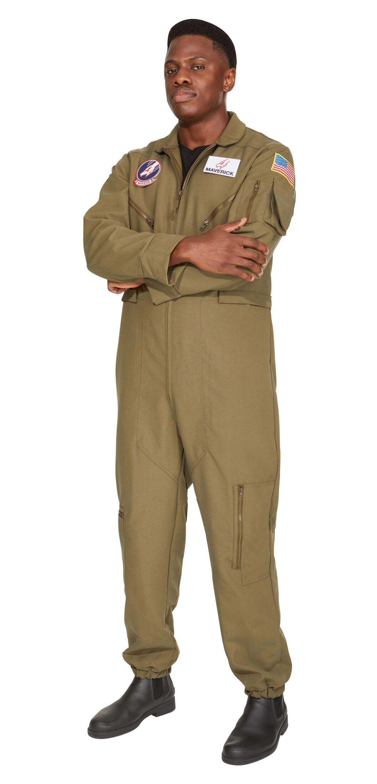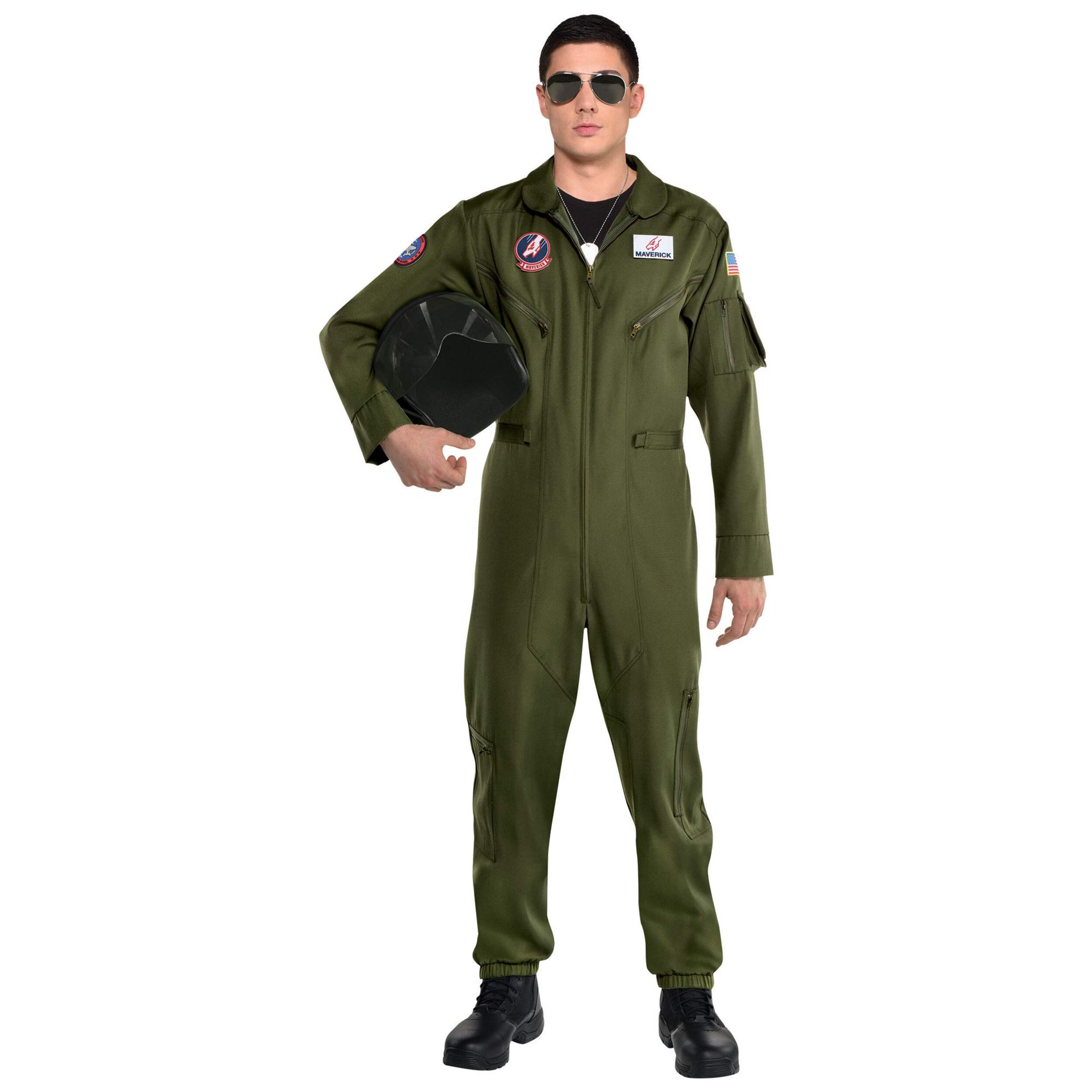 This officially licensed Men's Top Gun Green Flight Suit Costume features an authentic aviator jumpsuit with all the straps, patches, and cargo-style pockets you need to wow everyone this Halloween. The included name tags let you switch identities and log some flight hours alongside your fellow wingman. Whether attending a Halloween party, costume party, or cosplay event, this classic Top Gun outfit is perfect to represent the blockbuster film and franchise.