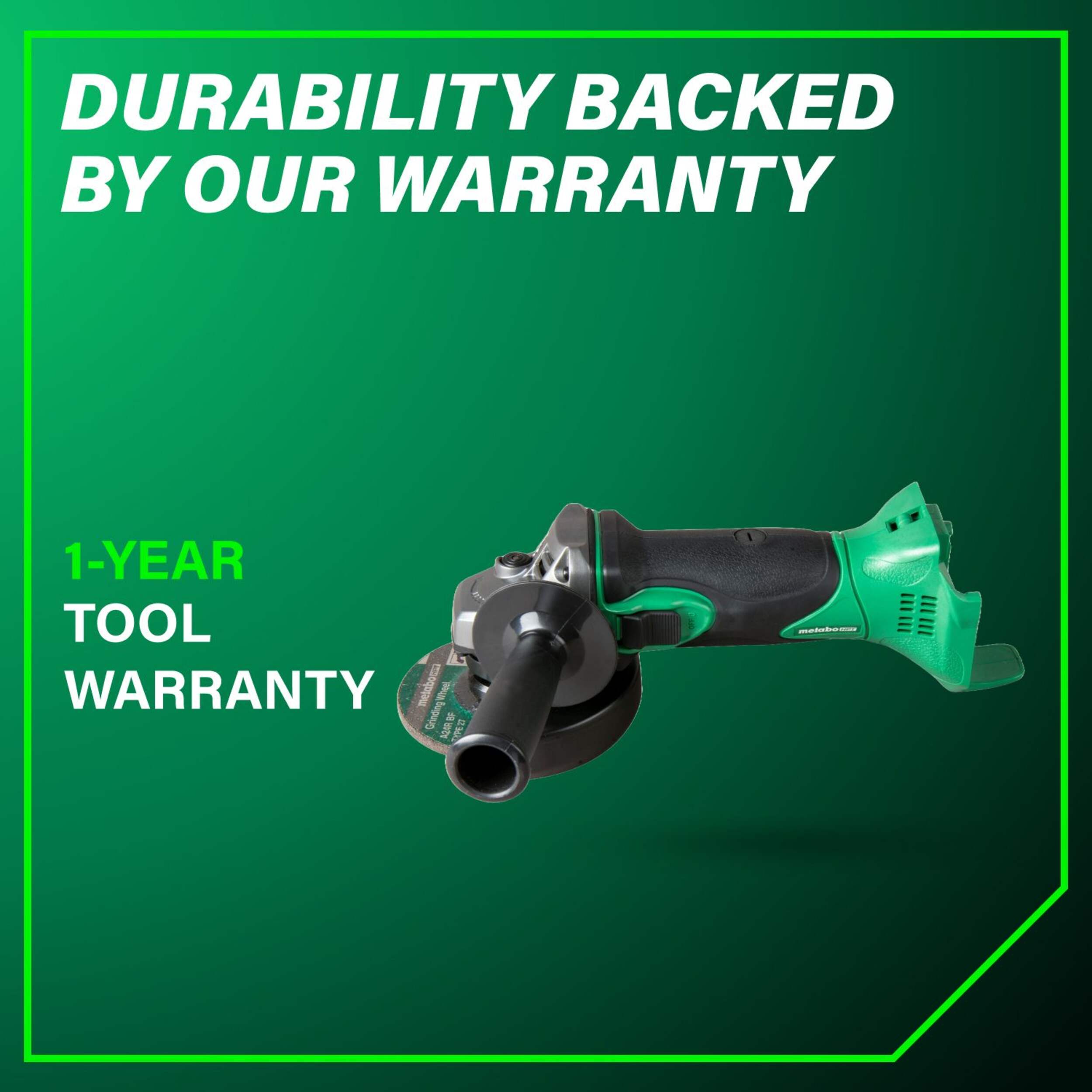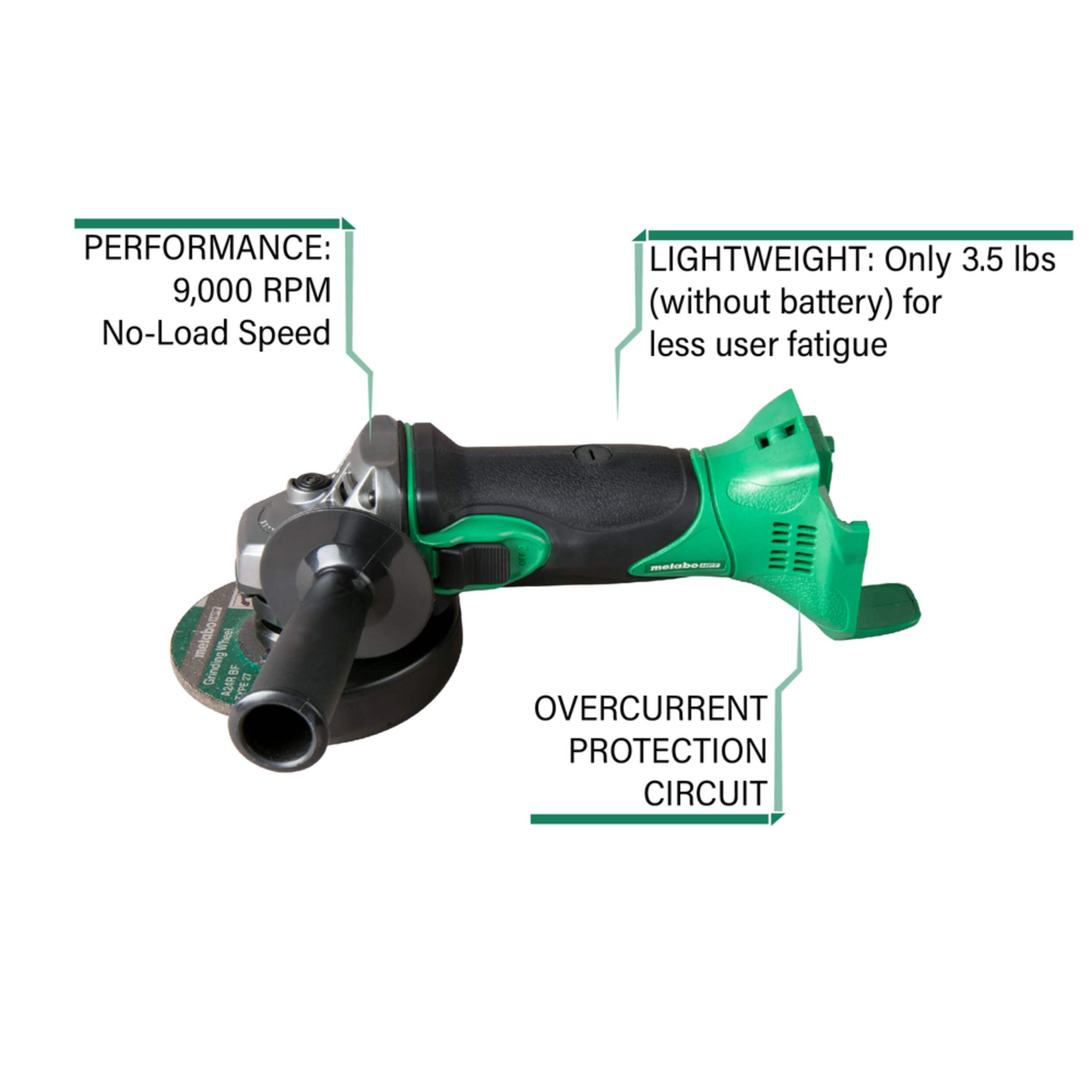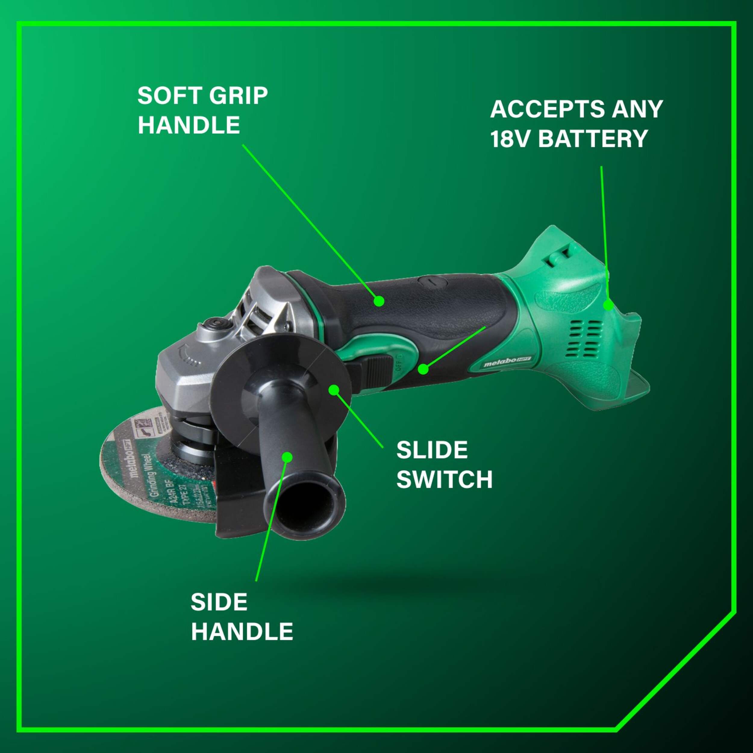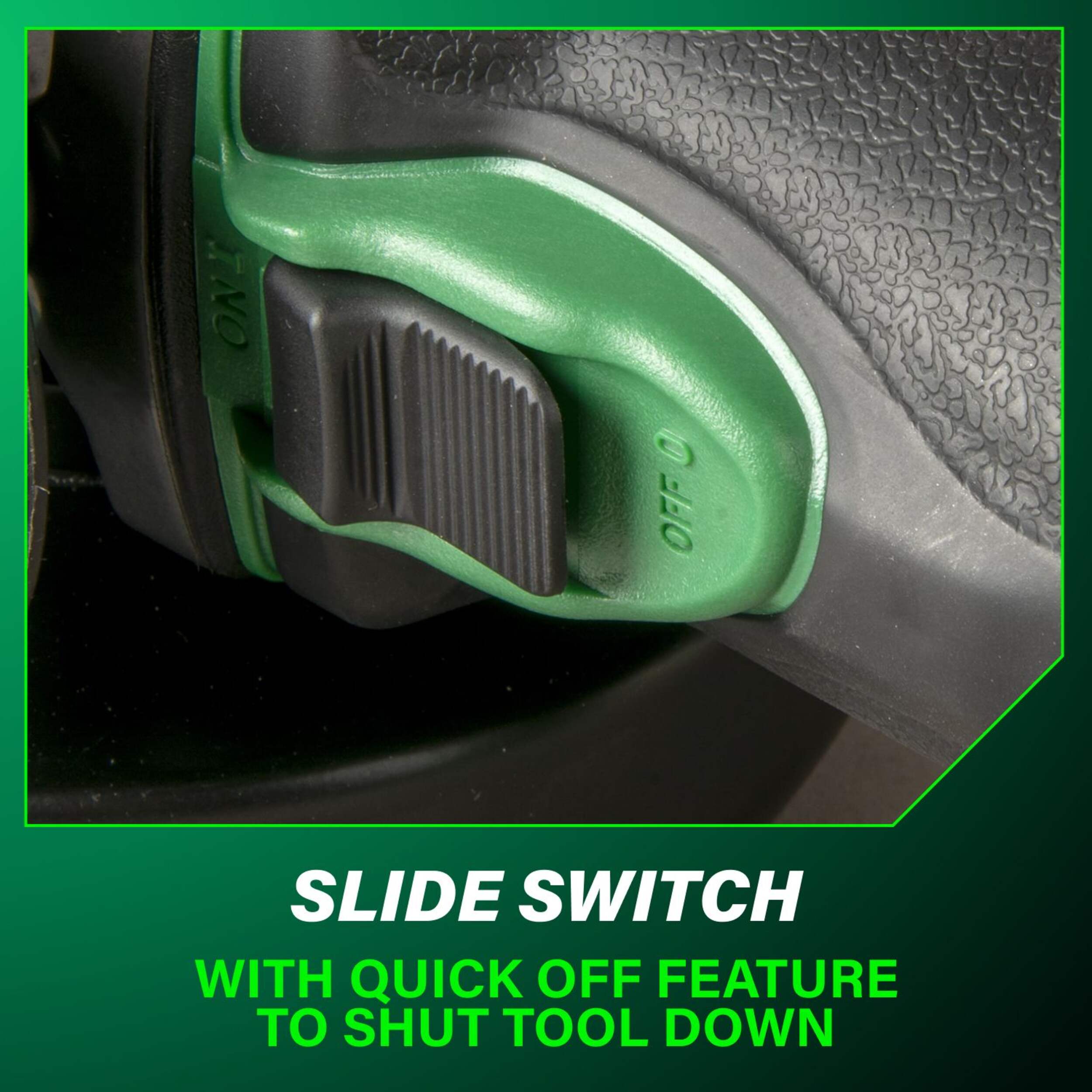 Metabo HPT 18V 4-1/2" HXP Pro Slide Grinder features Slide Switch with quick off feature to immediately shut tool down for added safety