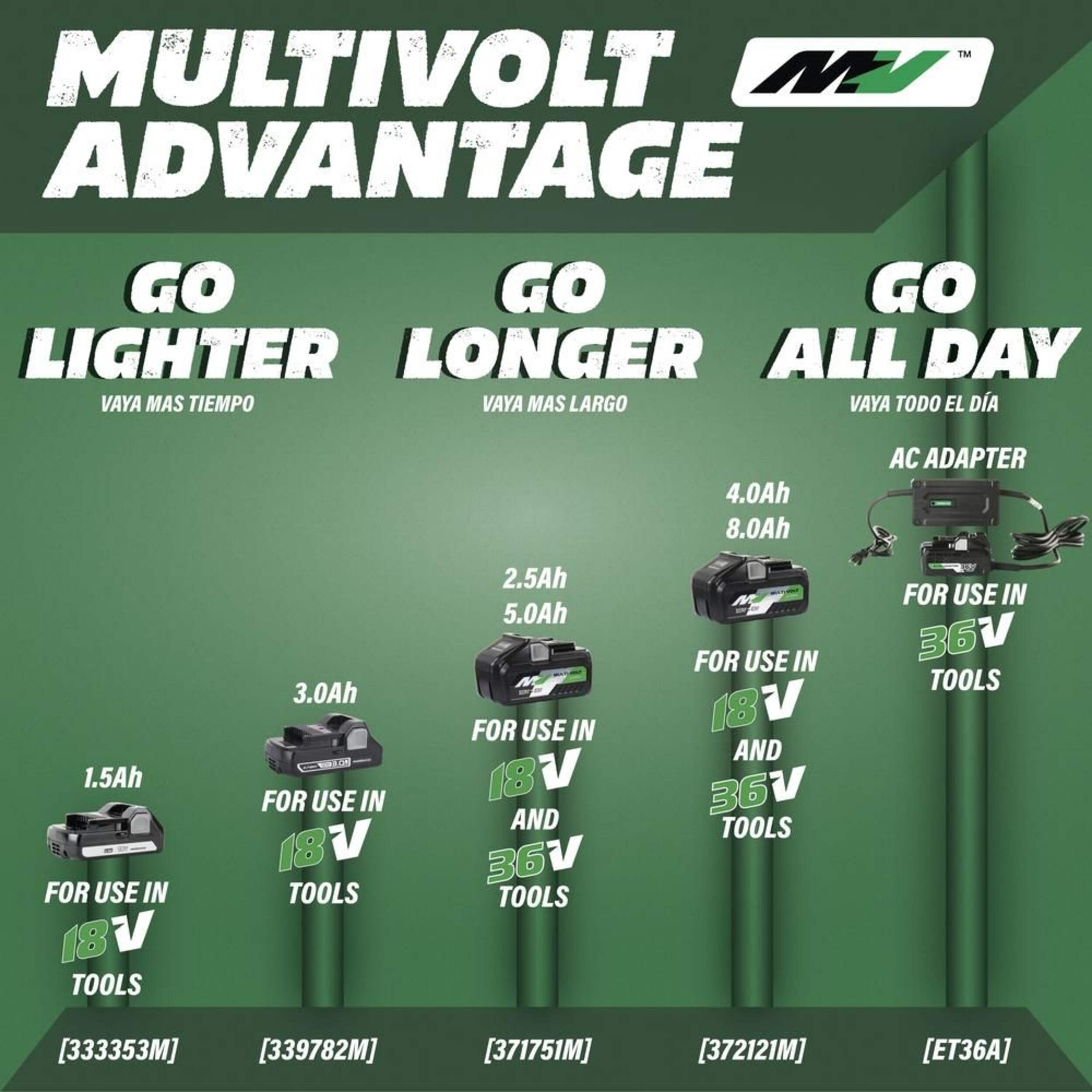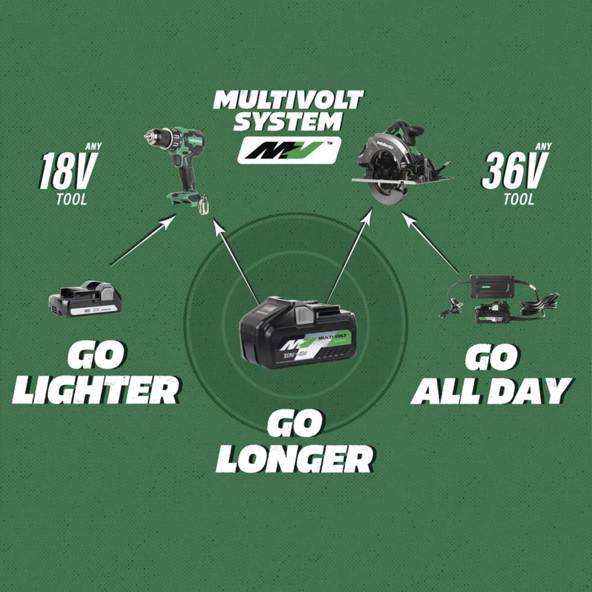 Multivolt Technology accepts both Metabo HPT 18V batteries and MultiVolt batteries for up to 8.0Ah of run time