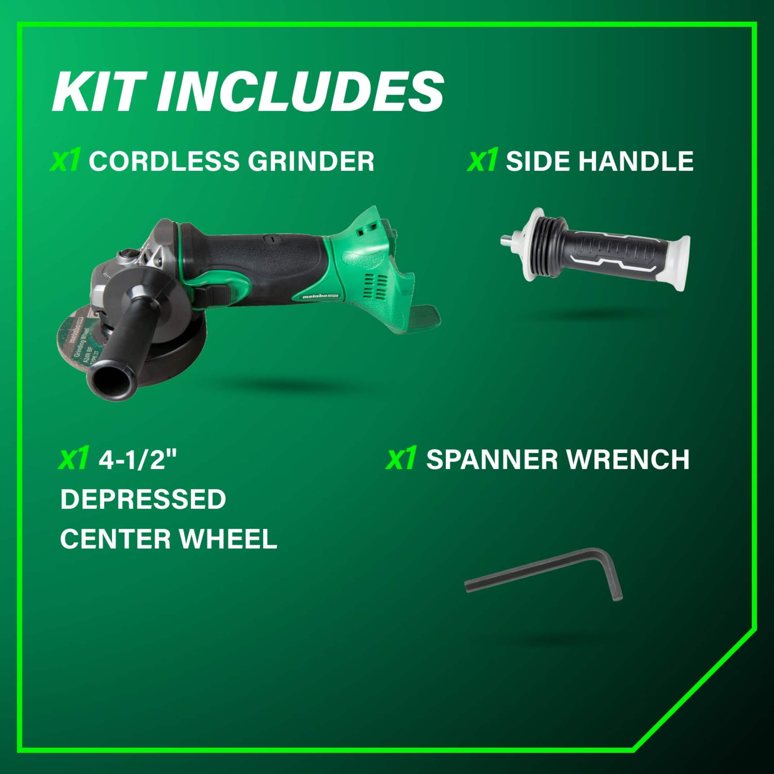 The Metabo HPT 18V 4-1/2-in HXP Pro Slide Grinder delivers superior cutting and grinding power with its high torque motor. This cordless grinder features a slide switch with quick-off for added safety. With anti-restart protection and 60% improved overload durability, this 18v grinder reduces the risk of motor damage. Accepting both 18V and MultiVolt batteries for extended runtime, it also has a battery charge indicator. The soft grip handle provides comfort and control while the included wheel, side handle and spanner wrench allow immediate use out of the box.