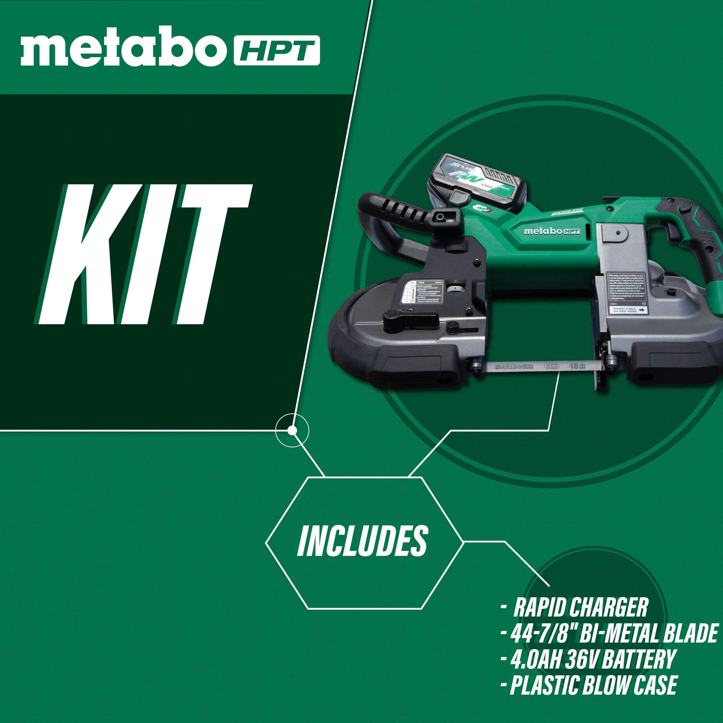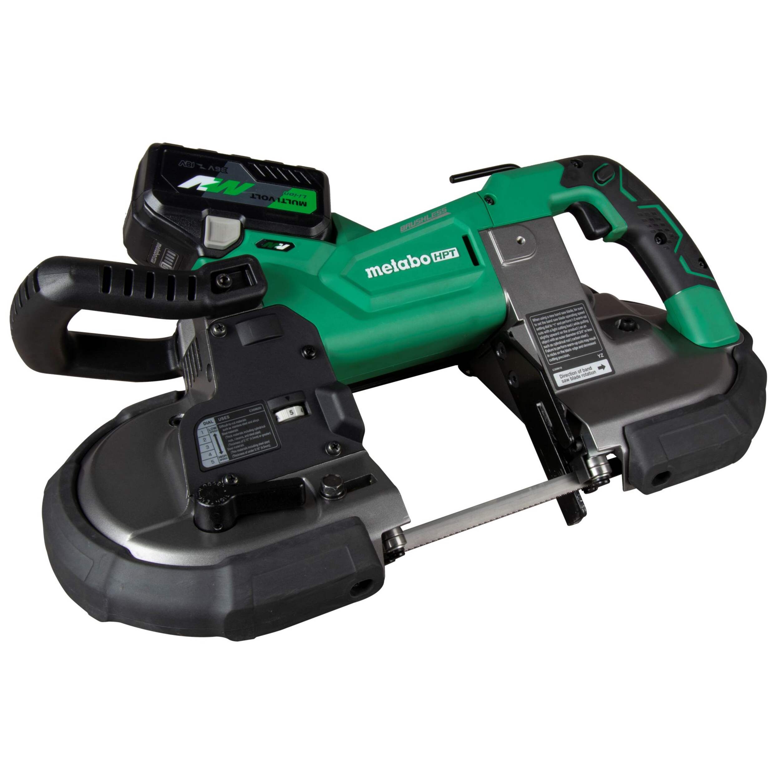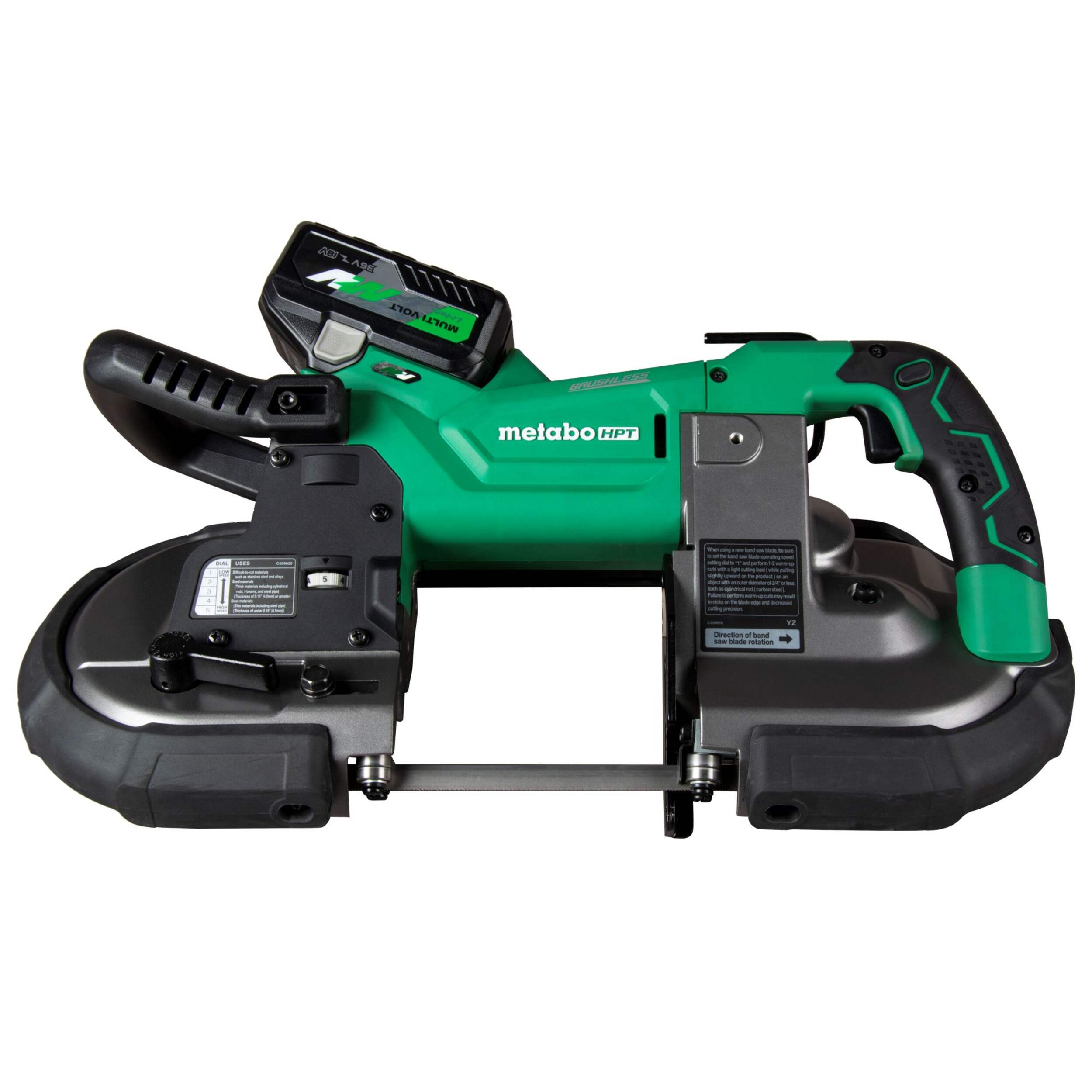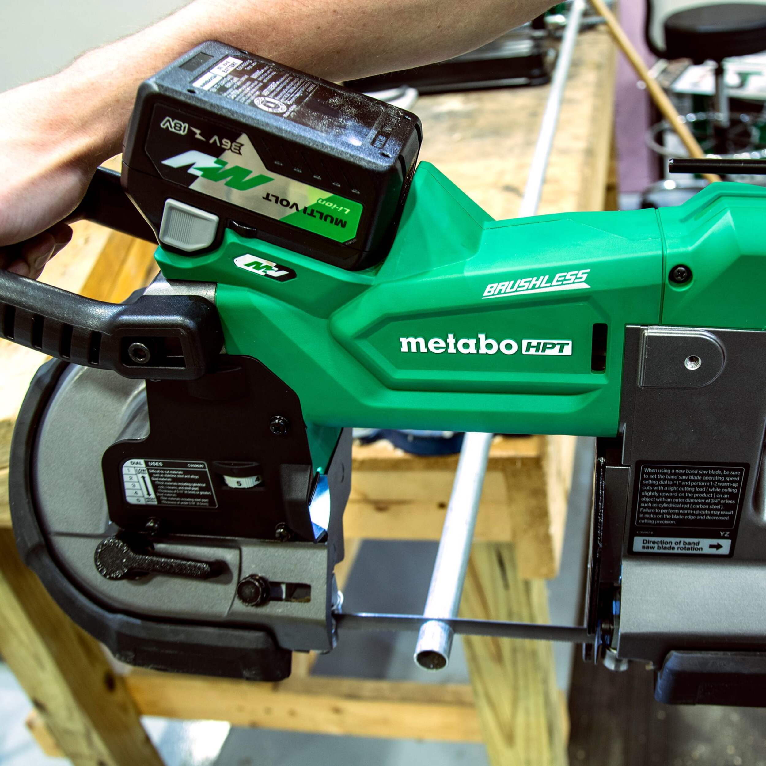 The 36V MultiVolt™ Deep Cut Band Saw (CB3612DA) is built for superior performance. The brushless motor produces a best-in-class cutting speed that is 16% faster than the closest competition at 640 surface feet per minute. Combined with the included 18 tooth per inch bi-metal band saw blade, this deep cut cordless band saw cuts through stainless steel pipe more than 4 times faster than the competition and cuts more than twice the number of stainless steel pipes per blade vs. the competition. The easy-to-clean band saw also features an integrated hook for easy storage, as well as an LED light for clear visibility of the cutting area. It accepts a 36V MultiVolt battery or the AC adapter with cord for ultimate flexibility. All of these incredible features combine to provide a reliable, durable, and efficient band saw option from Metabo HPT! The 36V cordless band saw is part of the expanding MultiVolt system of power tools from Metabo HPT. It accepts both 2.5 Ah and 4.0 Ah MultiVolt batteries for extreme power and runtime plus it also accepts the unique AC Adapter to GO all day. The MultiVolt system delivers ultimate power and versatility on the GO.