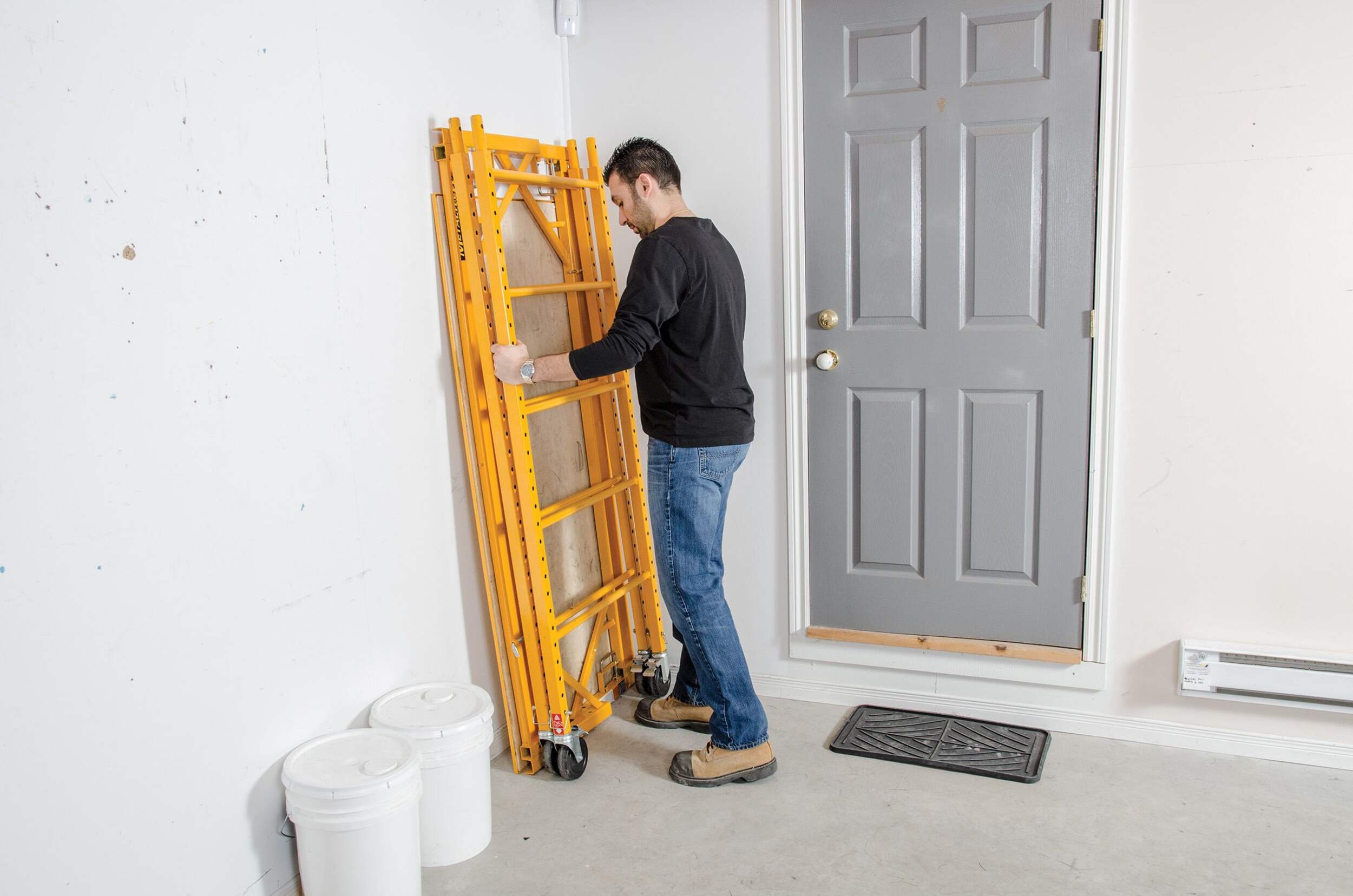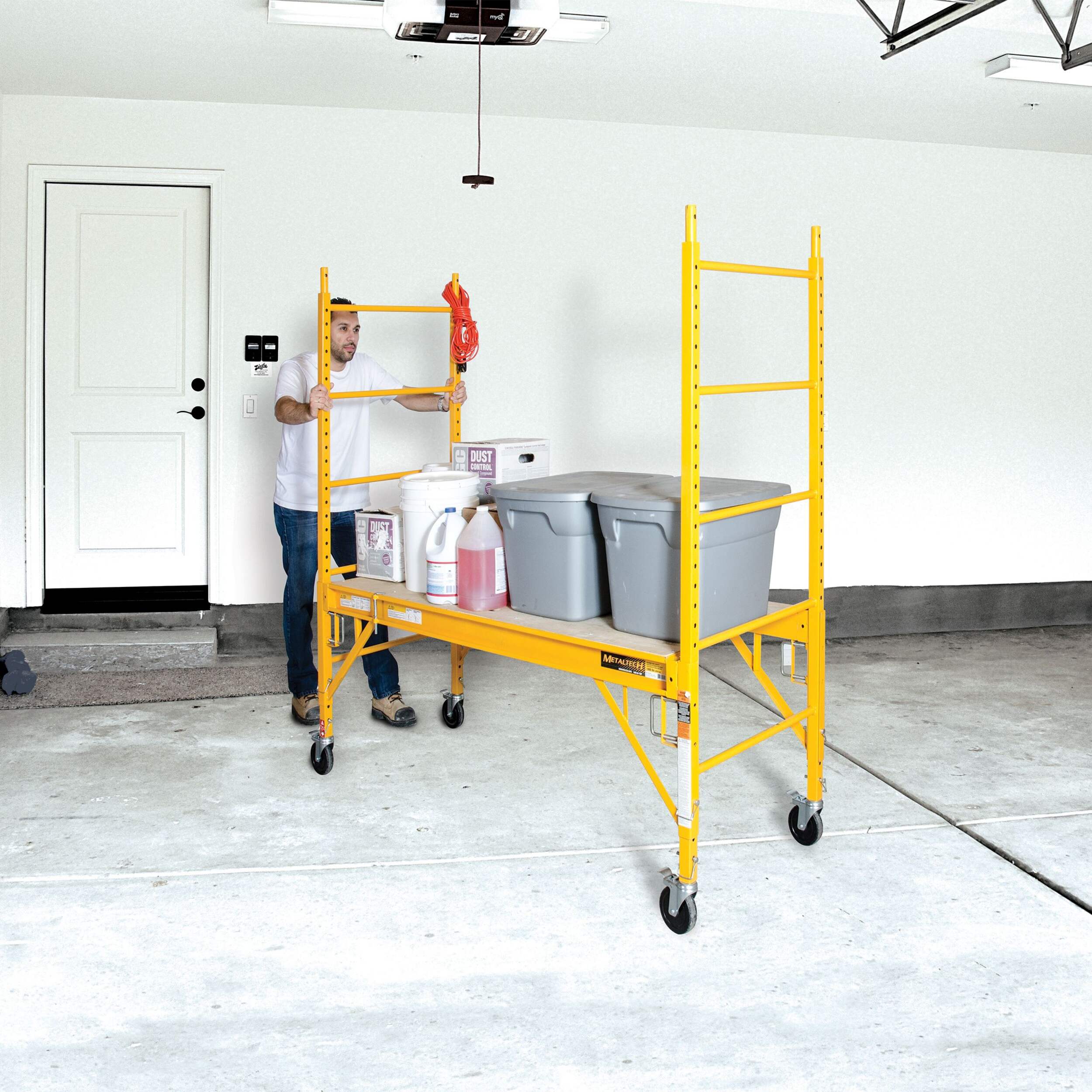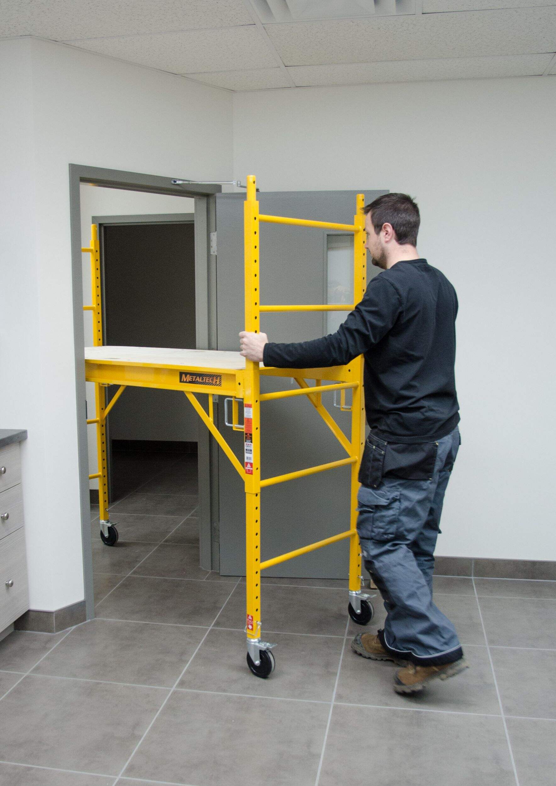 Work safely at heights with the MetalTech I-CISC Steel Multi-Use Baker Scaffold, a secure and sturdy platform that's ideal for larger interior painting jobs or contractor tasks. With a durable steel construction, the scaffold features a reinforced steel plank and lockable caster wheels for easy maneuvering through doorways. The safety yellow finish, sturdy construction and ability to support up to 1,000 lbs (454 kilograms) make this scaffold a more stable and secure workspace than a ladder for tasks at heights. Accessory trays and guard rails are available separately to customize the scaffold for your specific needs.