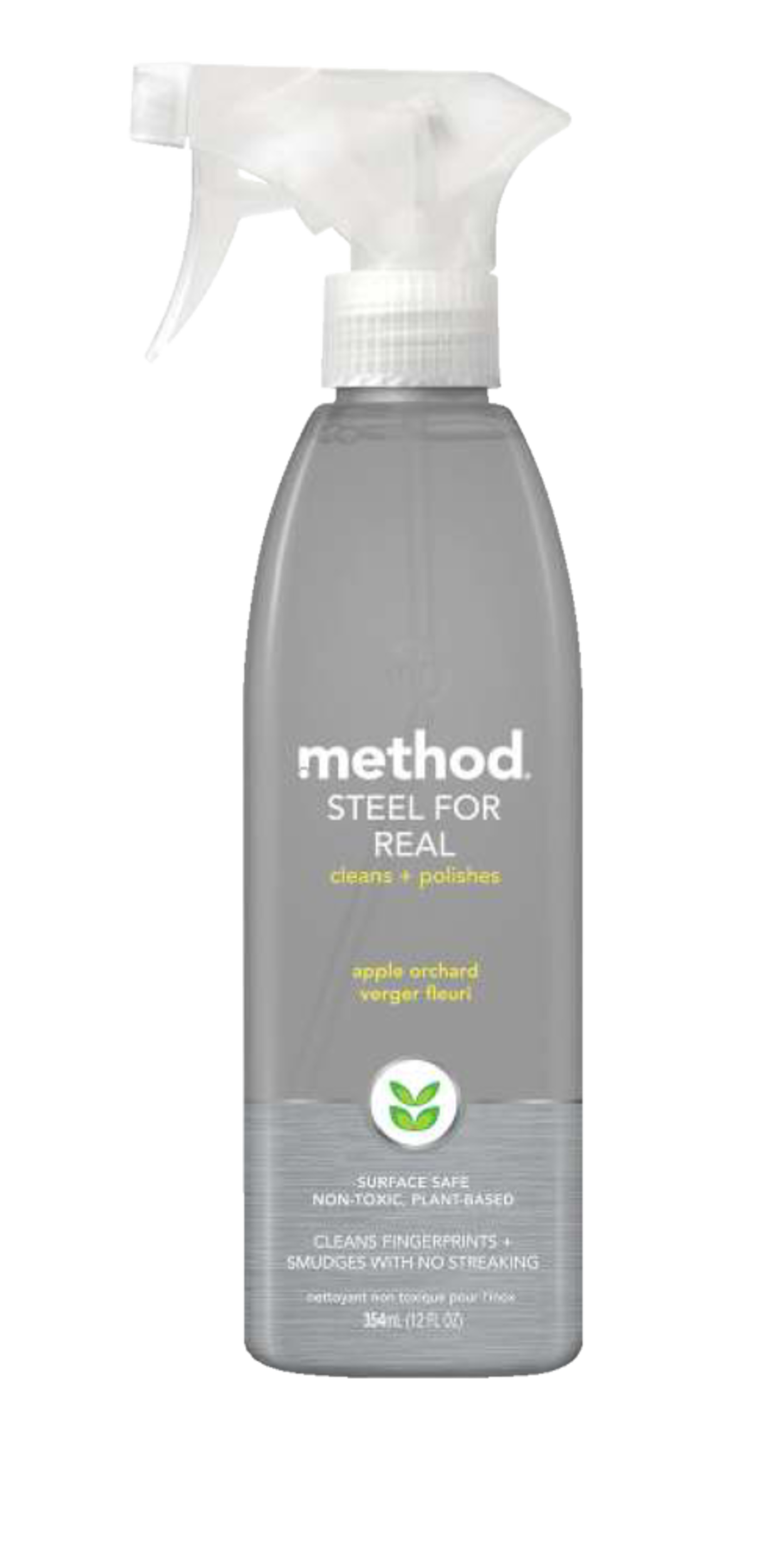 Stainless steel looks good, unless it's covered with fingerprints and grime. Non-abrasive Method Steel for Real cleans and polishes stainless steel appliances and surfaces without streaking and leaves a protective layer behind. It has a fresh apple orchard scent.