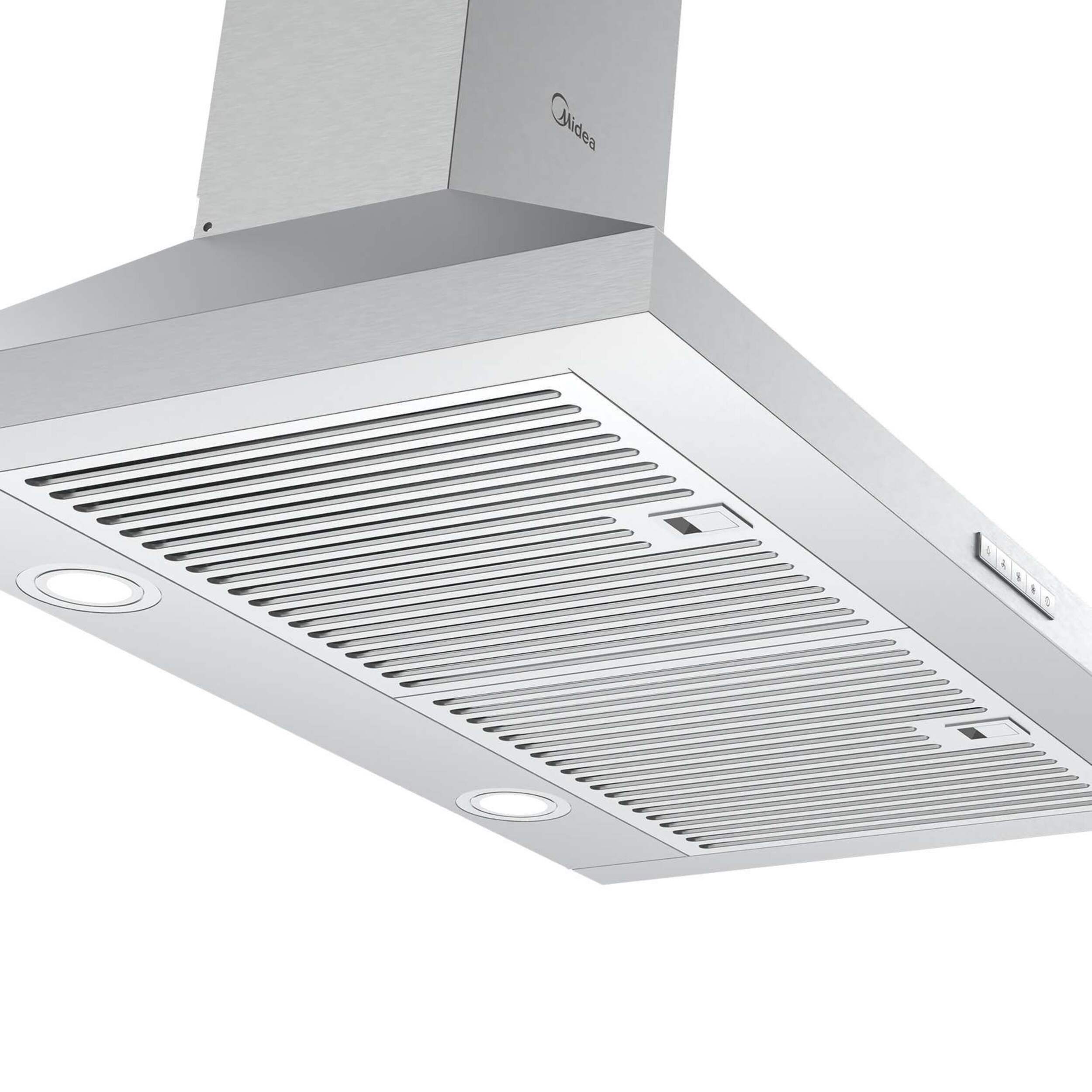 The Midea Pyramid 450CFM Push Button Wall Mount Kitchen Exhaust Fan Range Hood comes equipped with a 3-speed 450 CFM exhaust fan to keep your cooking space clear of fumes. It can be installed in either recirculating mode or exhausting mode to suit your kitchen layout. The included baffle filter is easy to remove, wash and reattach.