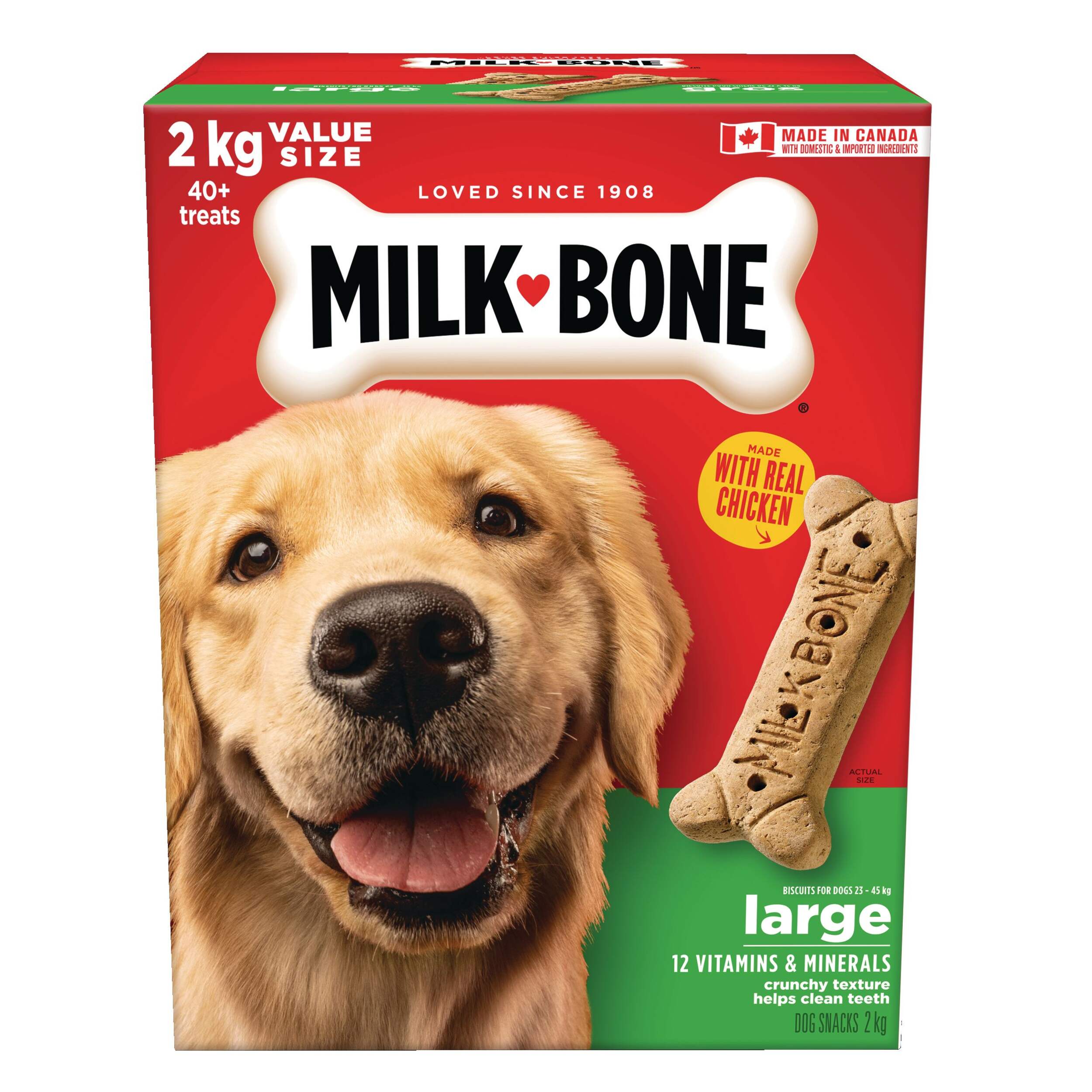 Milk-Bone Large Biscuits Dog Treats, assorted sizes, are a tasty, nutritious treat for your pet. These biscuits are not just delicious, they are also fortified with essential vitamins and minerals that contribute to your pet's overall health. An added benefit is their ability to help clean your pet's teeth as they chew, promoting good oral hygiene. Please note that these treats are not a substitute for a balanced diet. The Milk-Bone Large Biscuits Dog Treats are made with your pet's enjoyment and well-being in mind.
