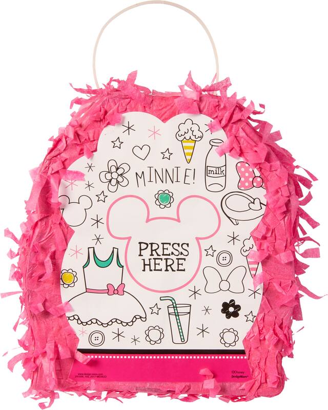 Miniature pink pinata has Minnie wearing a pretty pink bow printed on the front and "Press Here" written on the back so little ones know where to open it