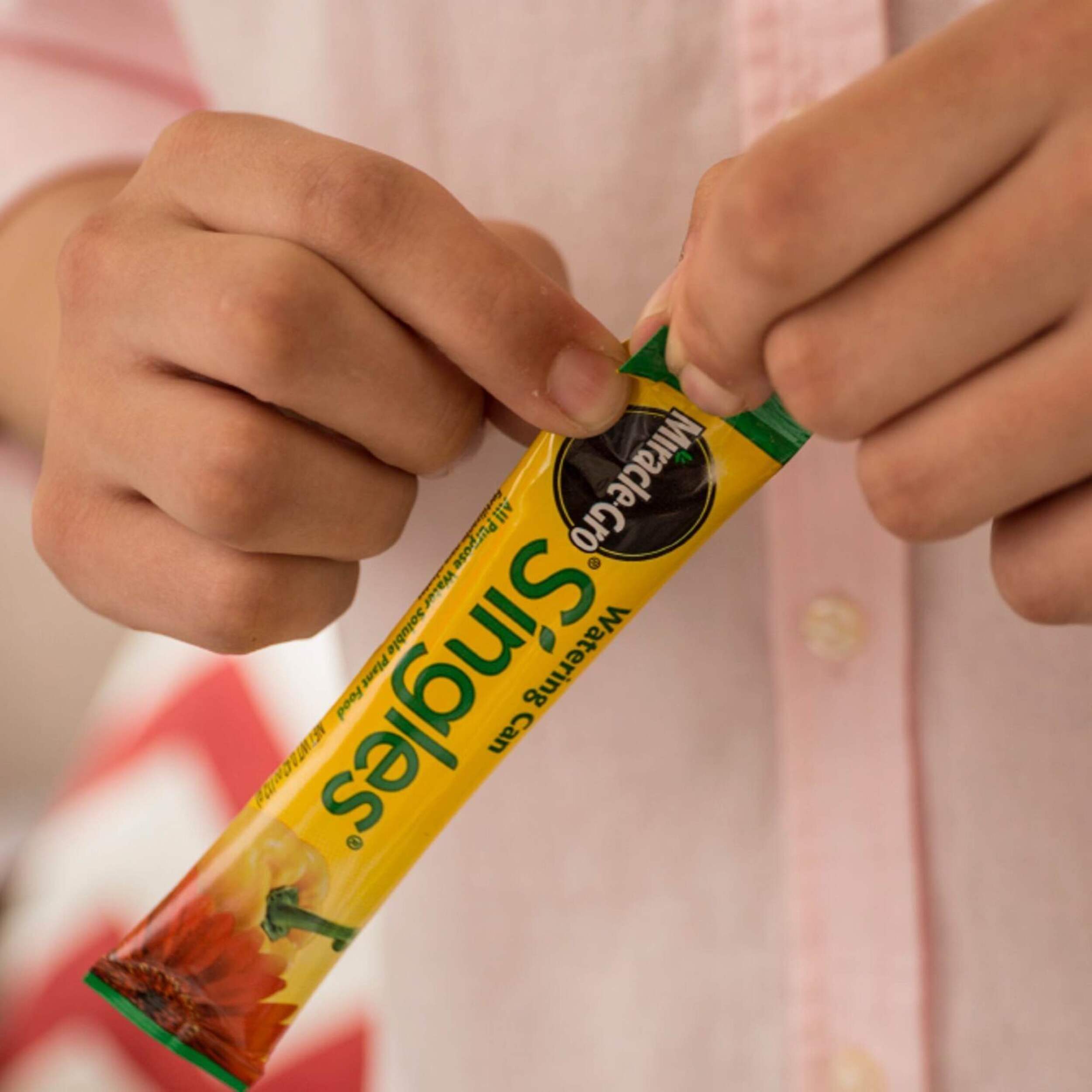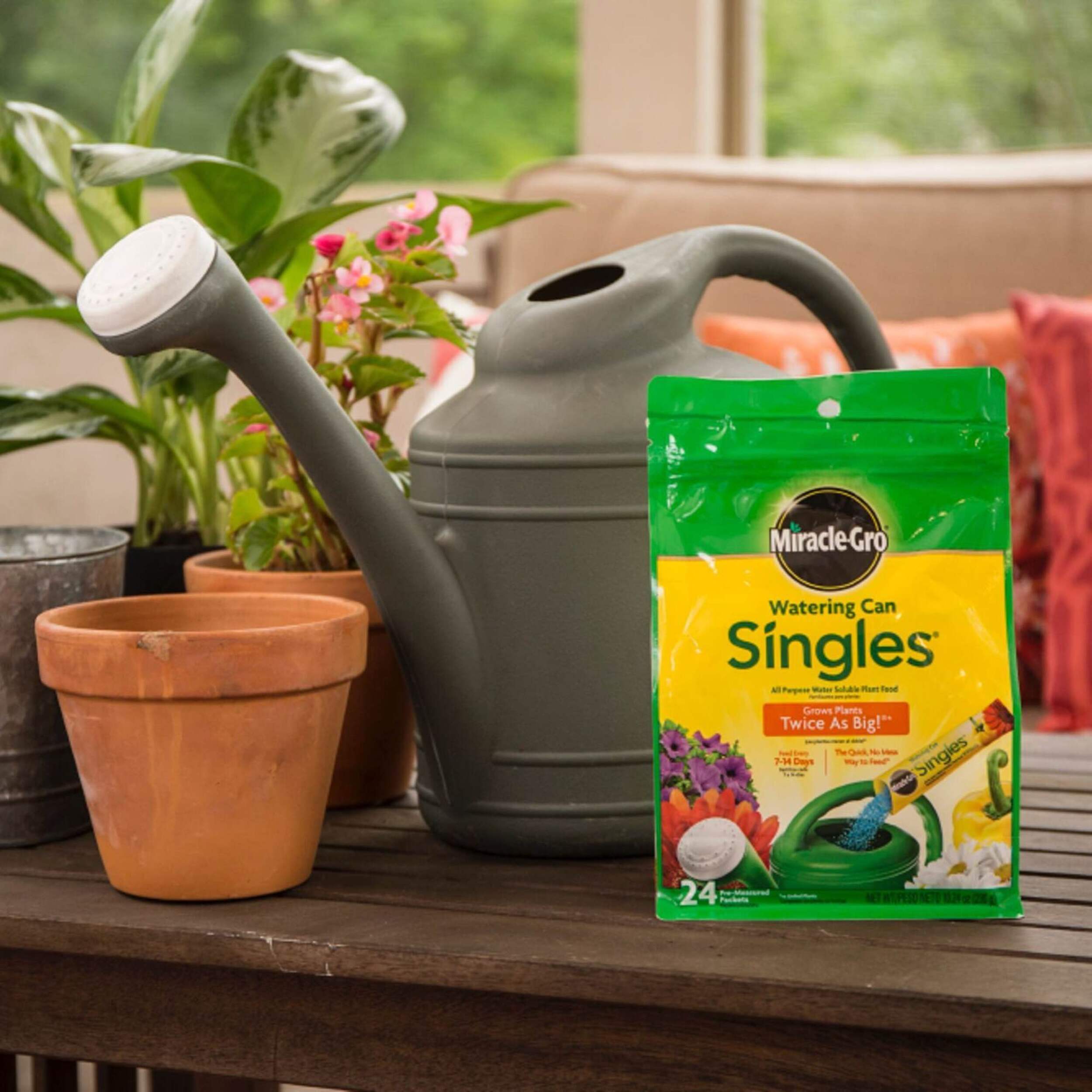 Feeding your plants is now mess-free and hassle-free with Miracle-Gro® Watering Can Singles® All Purpose Water Soluble Plant Food 24-8-16. These convenient, pre-measured packets make it simple (and easy!) to feed your in-ground or container plants. Just tear open and pour into a water can, add the correct amount of water, then water and feed. These little packets pack a big punch. Grows Plants Twice as Big®*. That’s quick, no-mess feeding the Miracle-Gro® way.*vs Unfed Plants
