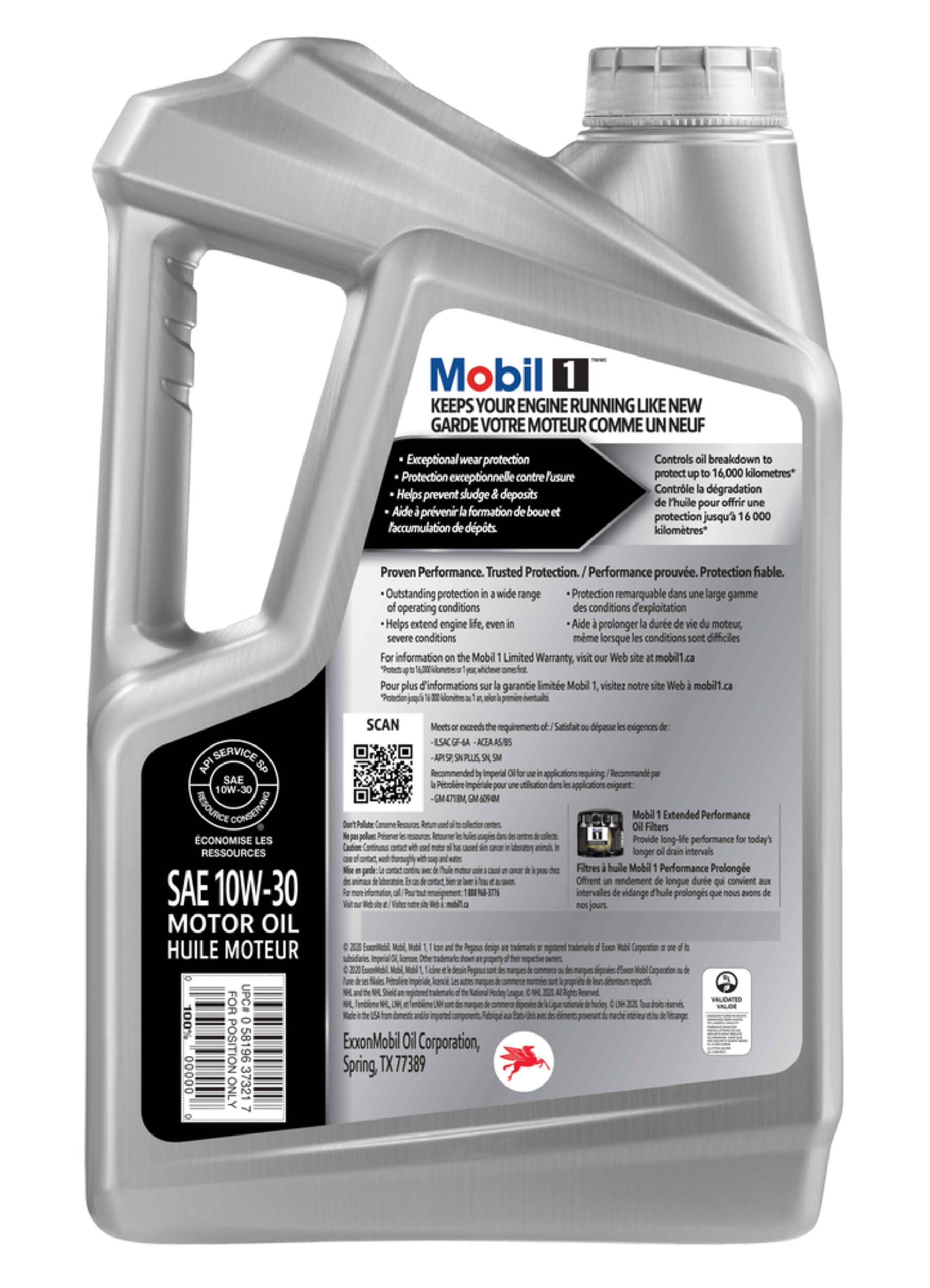 Mobil 1™ 10W-30 is an advanced full synthetic motor oil formulated to keep engines running like new, ensuring your engine remains in peak condition for up to 16,000 kilometers between oil changes*. This premium oil meets or exceeds the industry's highest standards. Its synthetic technology is trusted as standard equipment in a variety of vehicles, including select high-performance models.