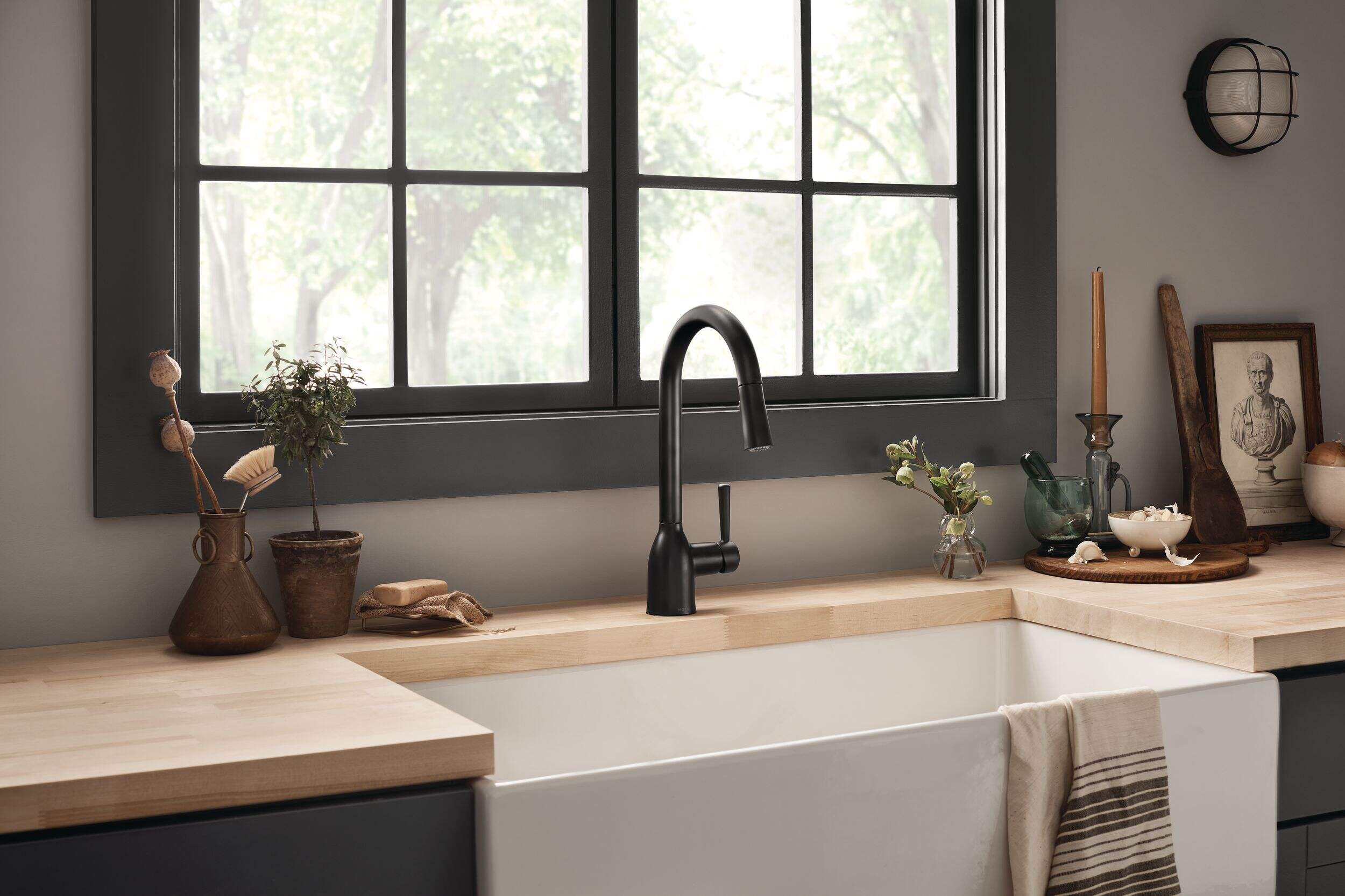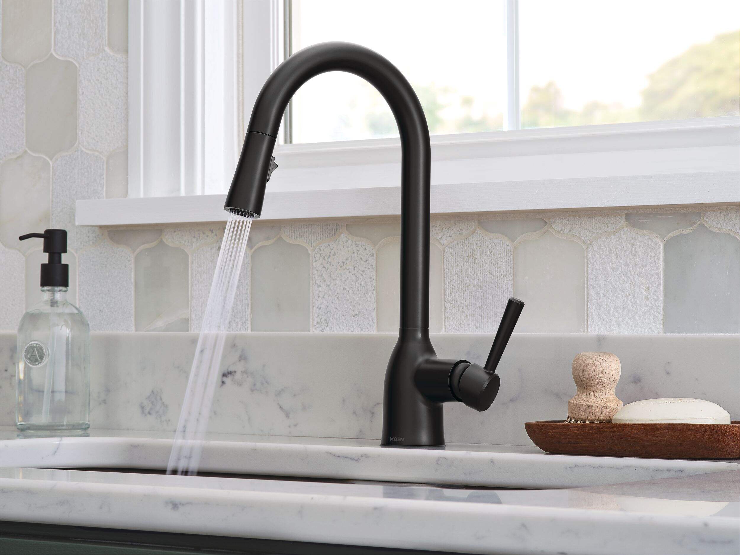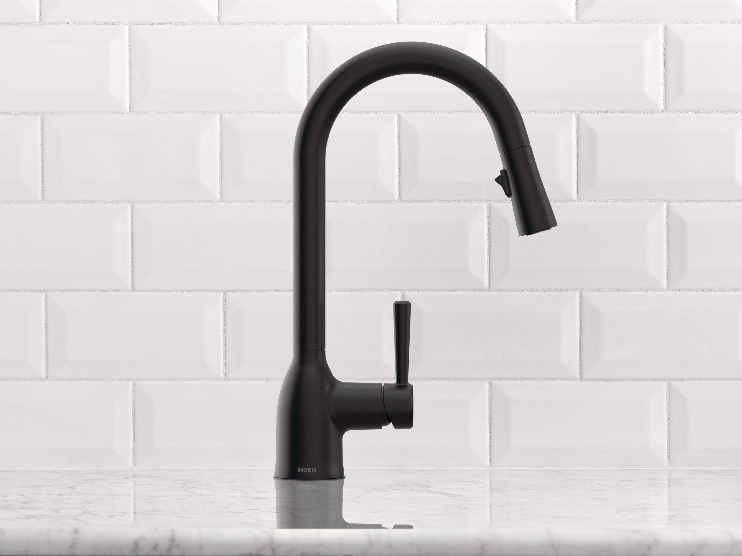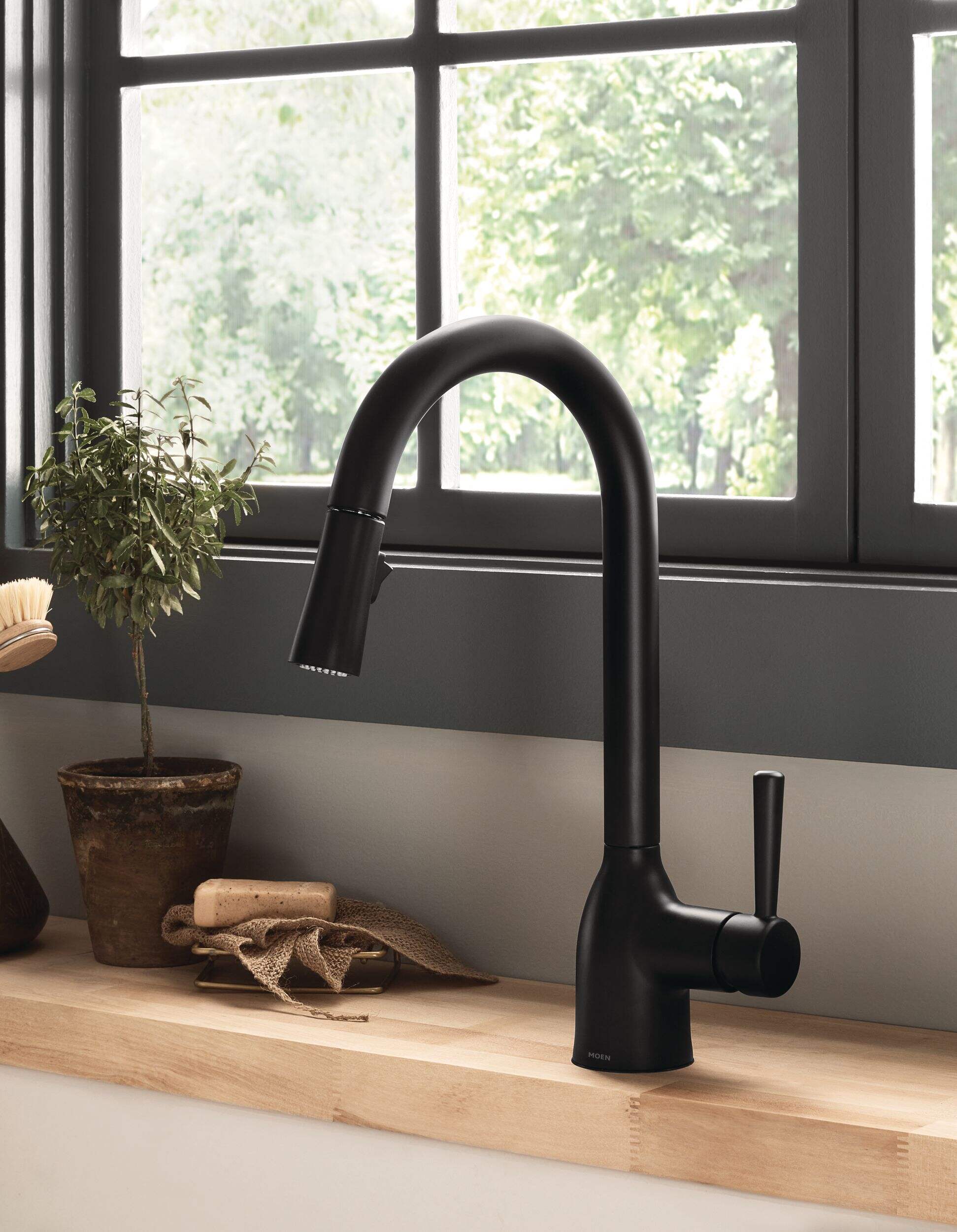 The Moen Adler Single-Handle Pull-Down Kitchen Faucet in Matte Black brings sleek, contemporary style and versatile functionality to any kitchen. Featuring a high-arc spout with a flexible pull-down spray head, this faucet offers extended reach and precision for washing, rinsing, and filling large pots. The single-handle design provides smooth water flow and temperature control, while the matte black finish resists fingerprints and water spots, keeping it looking clean and polished.