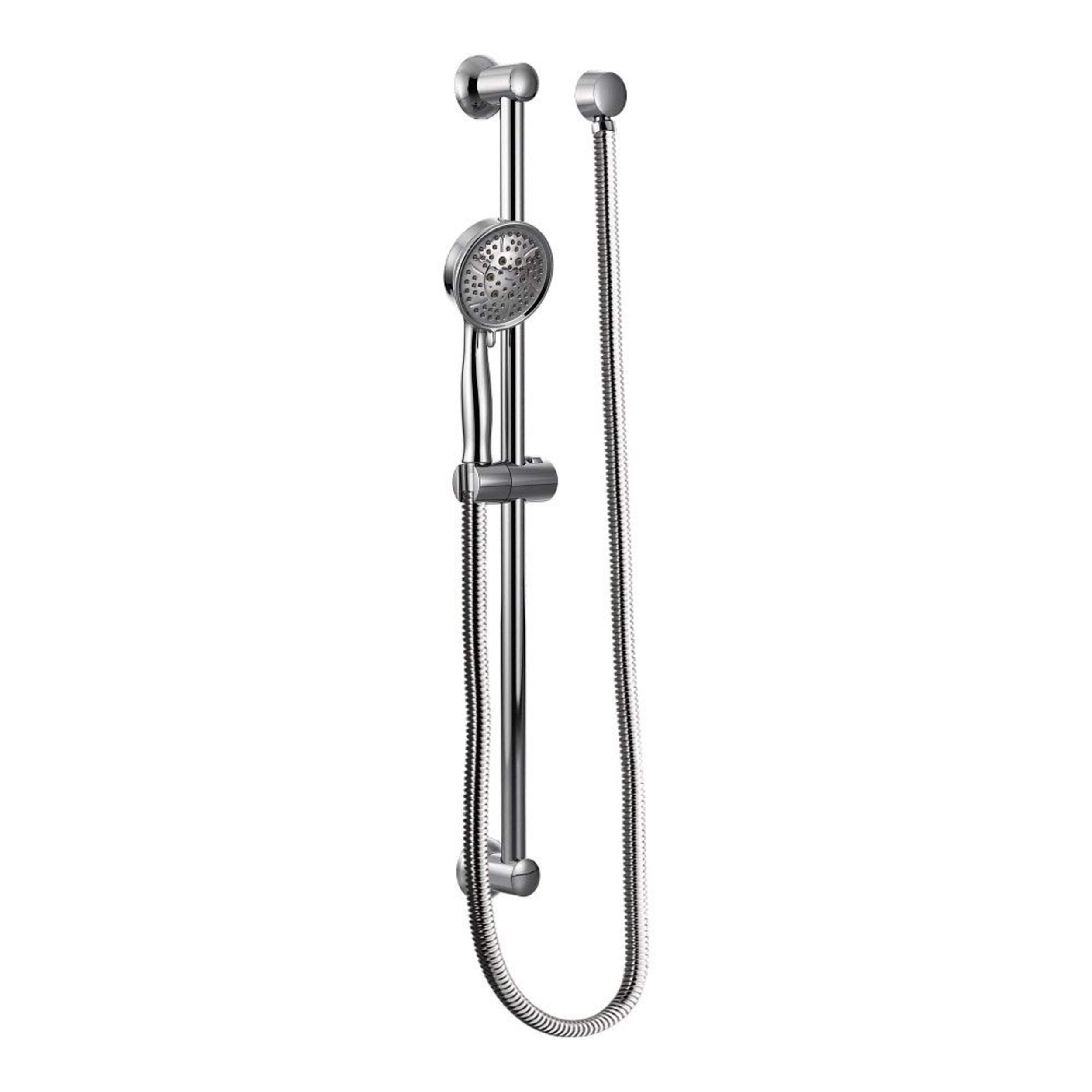 Moen Eco Handheld Shower Head with 30" Slide Bar features a chrome finish that is highly reflective for a mirror-like look that works with any decorating style