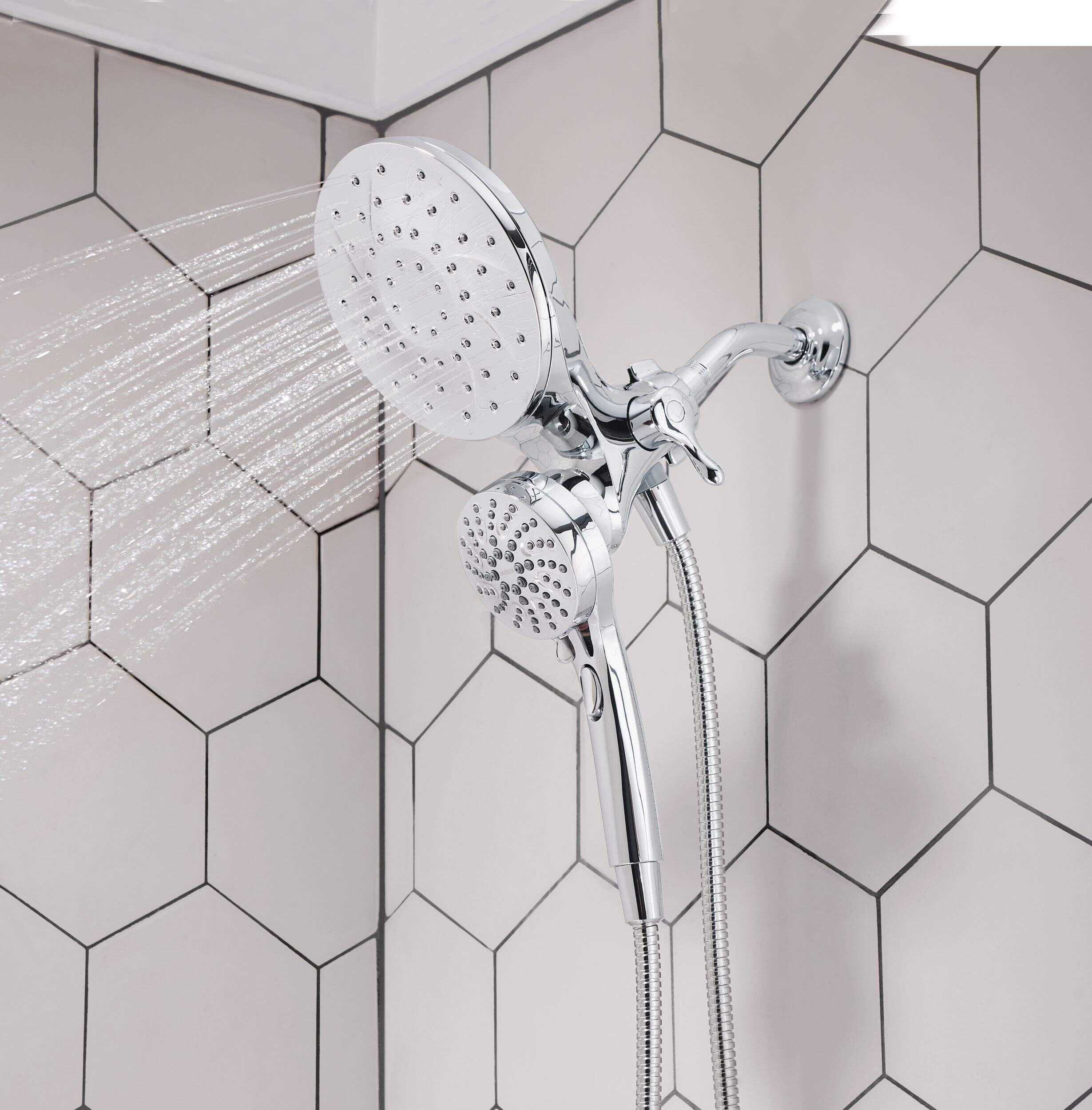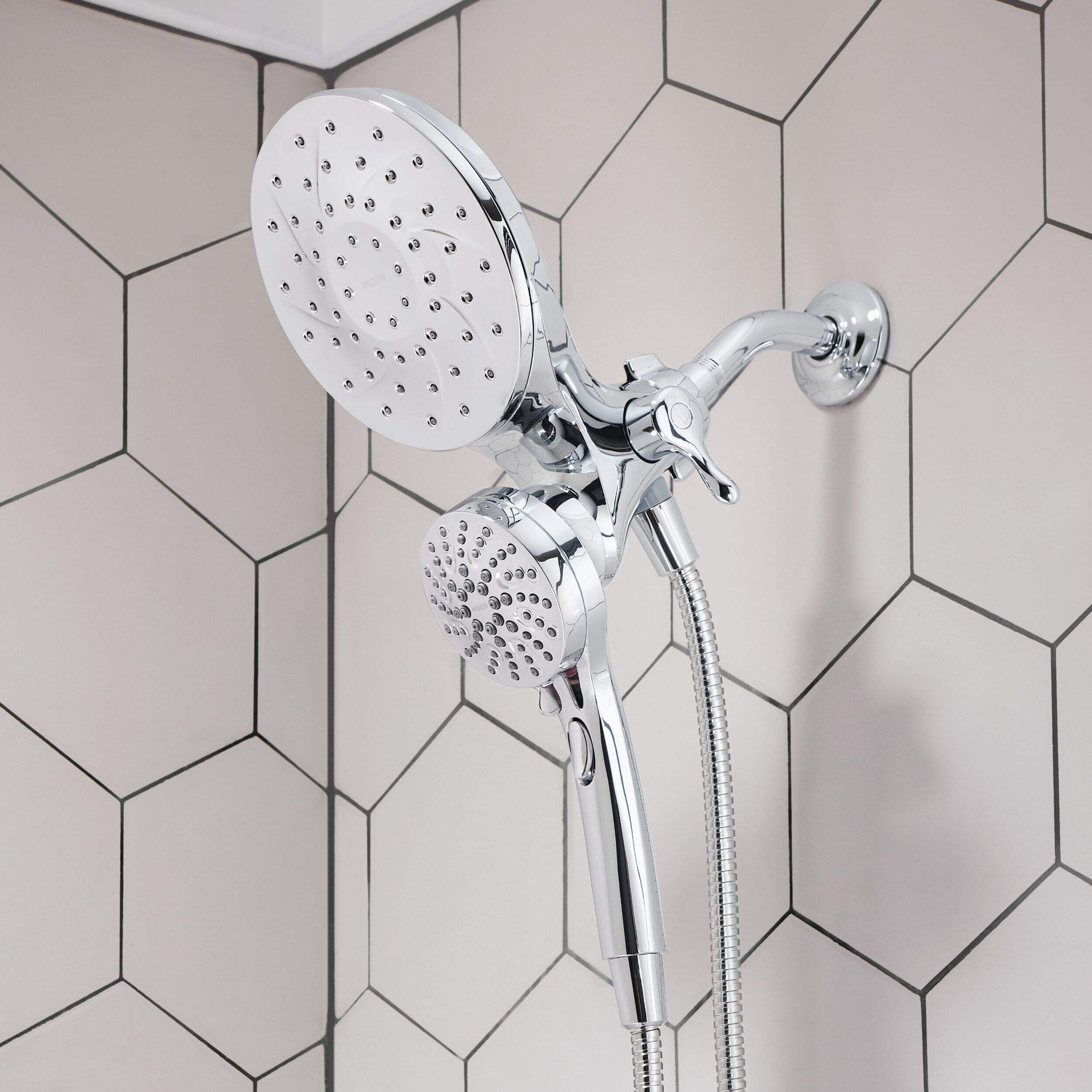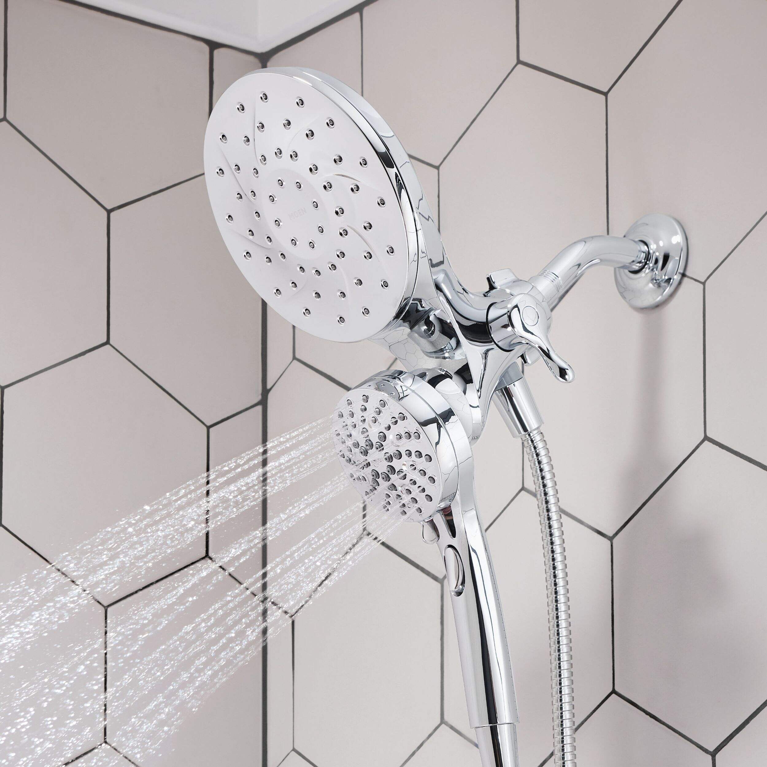 The Moen Engage Handheld and Rainshower Magnetix Combo combines versatility and comfort with its convenient features. Offering multiple spray settings, including pause, wide-coverage, downpour, and various massage options, it delivers a customized shower experience. Inspired by nature's patterns, the distinctive design of the Engage collection blends seamlessly with transitional décor, offering both timeless style and modern functionality. Its chrome finish and thoughtful design balance elegance and everyday practicality, perfect for today’s lifestyles.