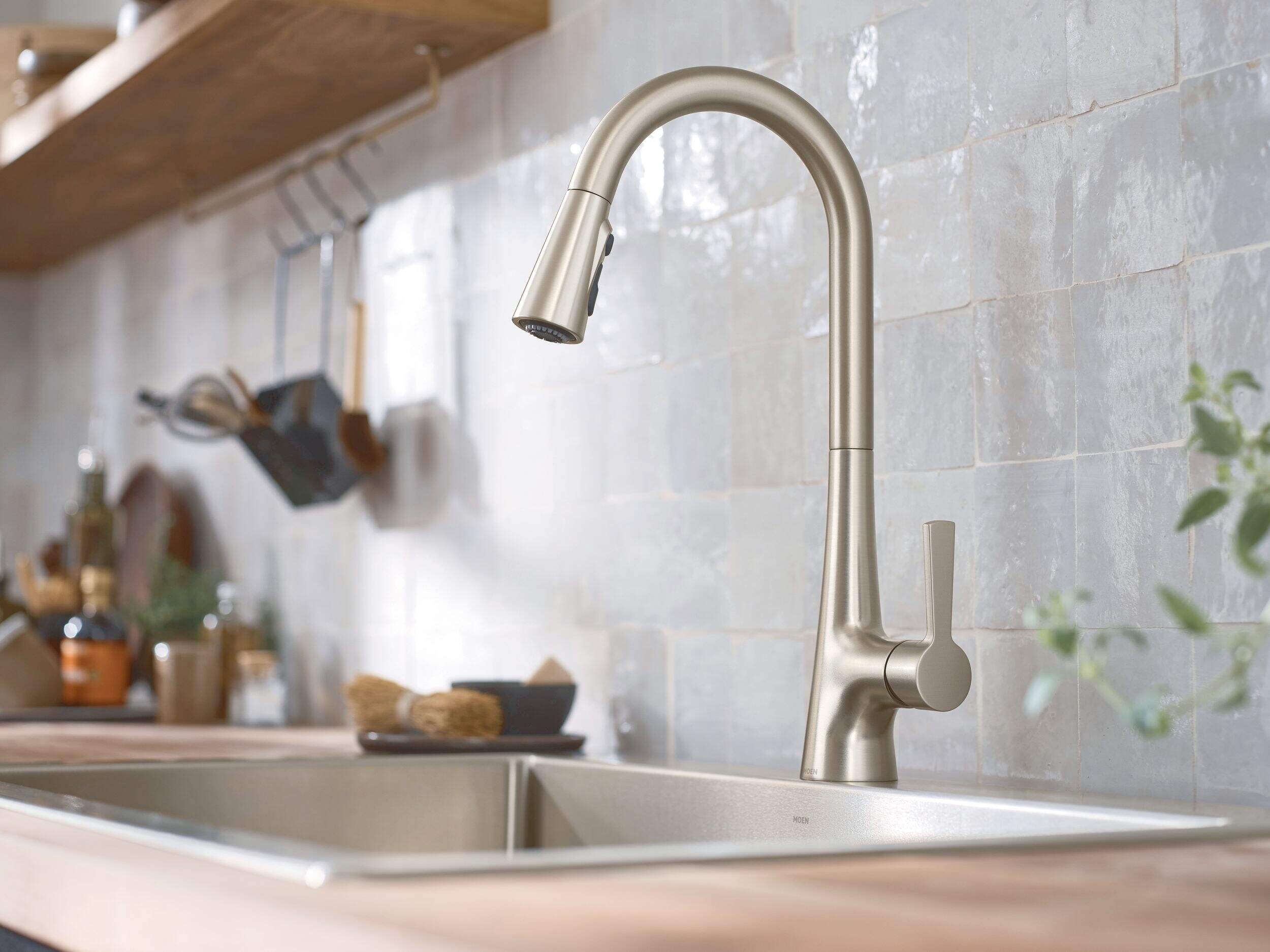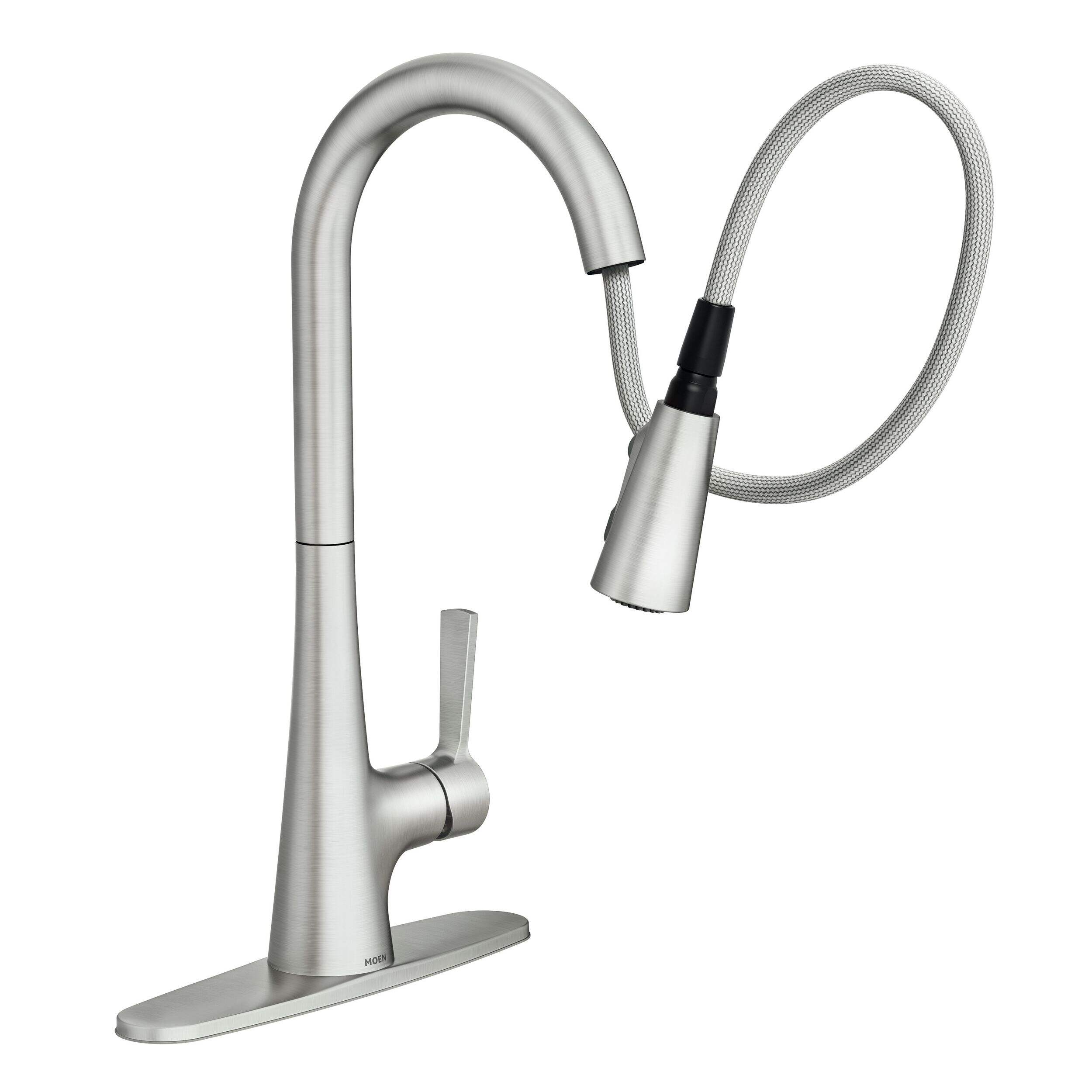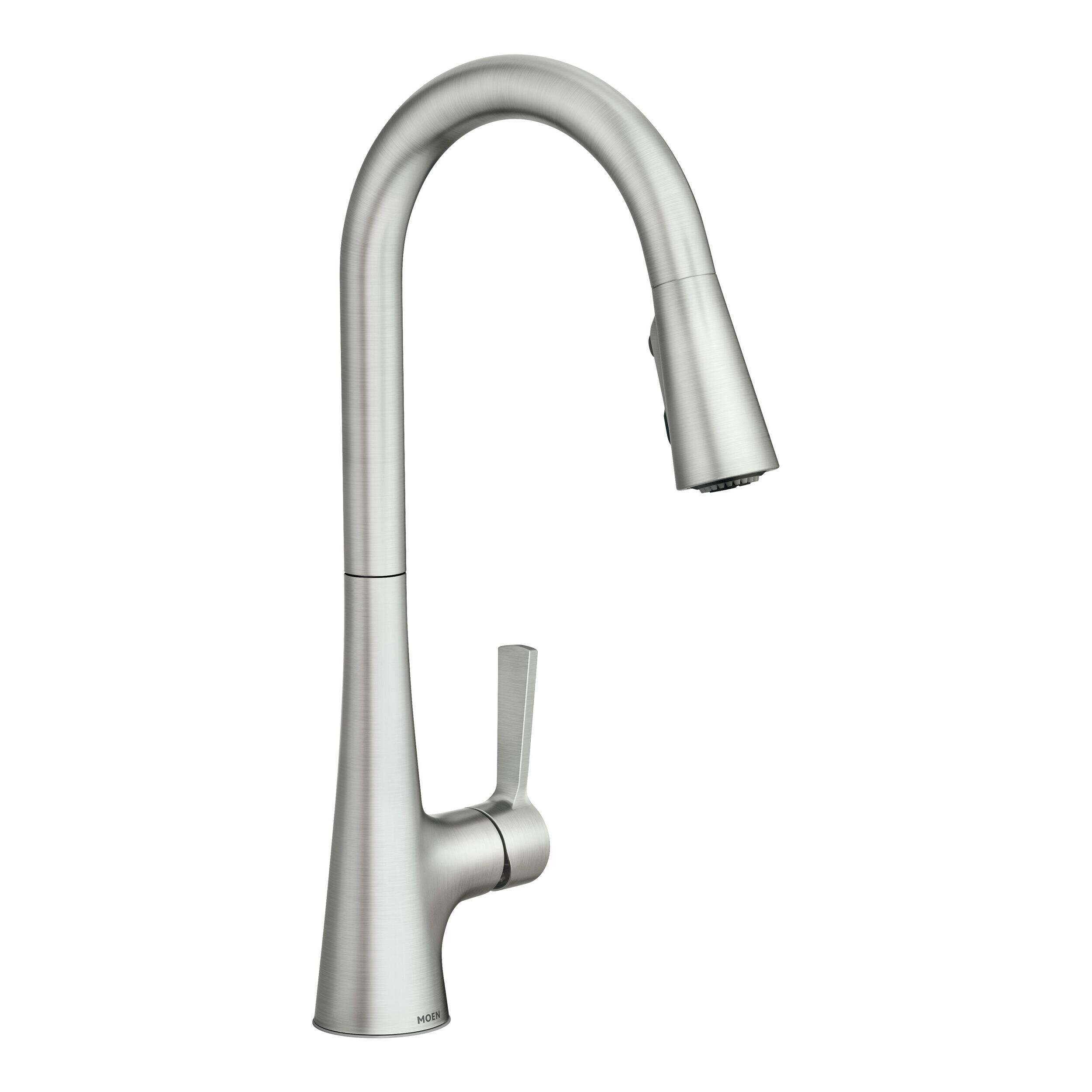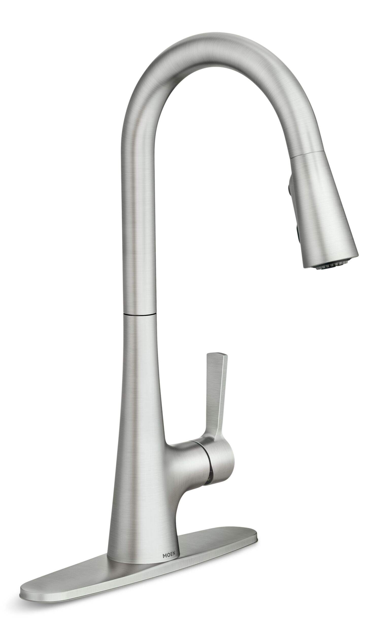 The Moen Mikah 1-Handle Pull-Down Kitchen Faucet combines a stylish look with practical features to enhance any kitchen. Designed with Moen's Spot Resist finish, this faucet resists fingerprints and water spots, keeping it looking clean and polished. The pull-down spray head offers flexible reach, while the single-handle design allows for smooth temperature and flow control.