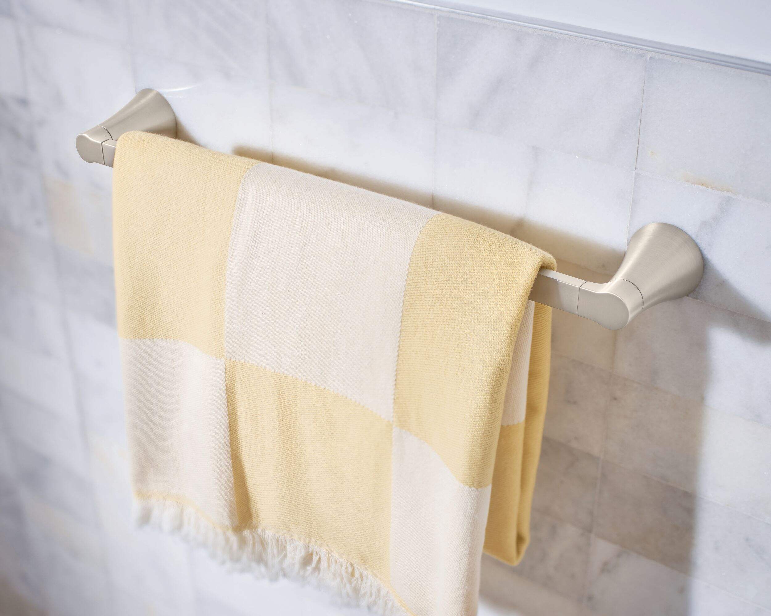 Made up of smooth, fluid curves, the Moen Mikah Brushed Nickel Towel Bar offers a soft, modern style that can add a touch of warmth to the bathroom. The towel bar helps complete the design of the space for a cohesive look. With an exclusive, stylish Spot Resist™ Brushed Nickel exterior, this handy bathroom towel bar resists fingerprints and water spots, making it easy to clean and easy on the eyes.