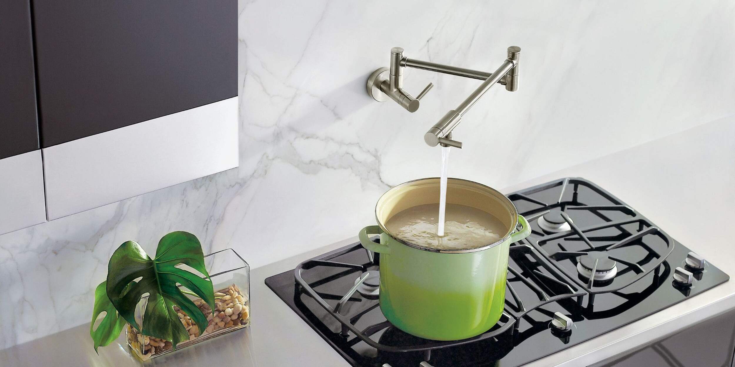 WATER WHERE YOU NEED IT: Convenient pot filler kitchen faucet offers water access directly over your cooktop