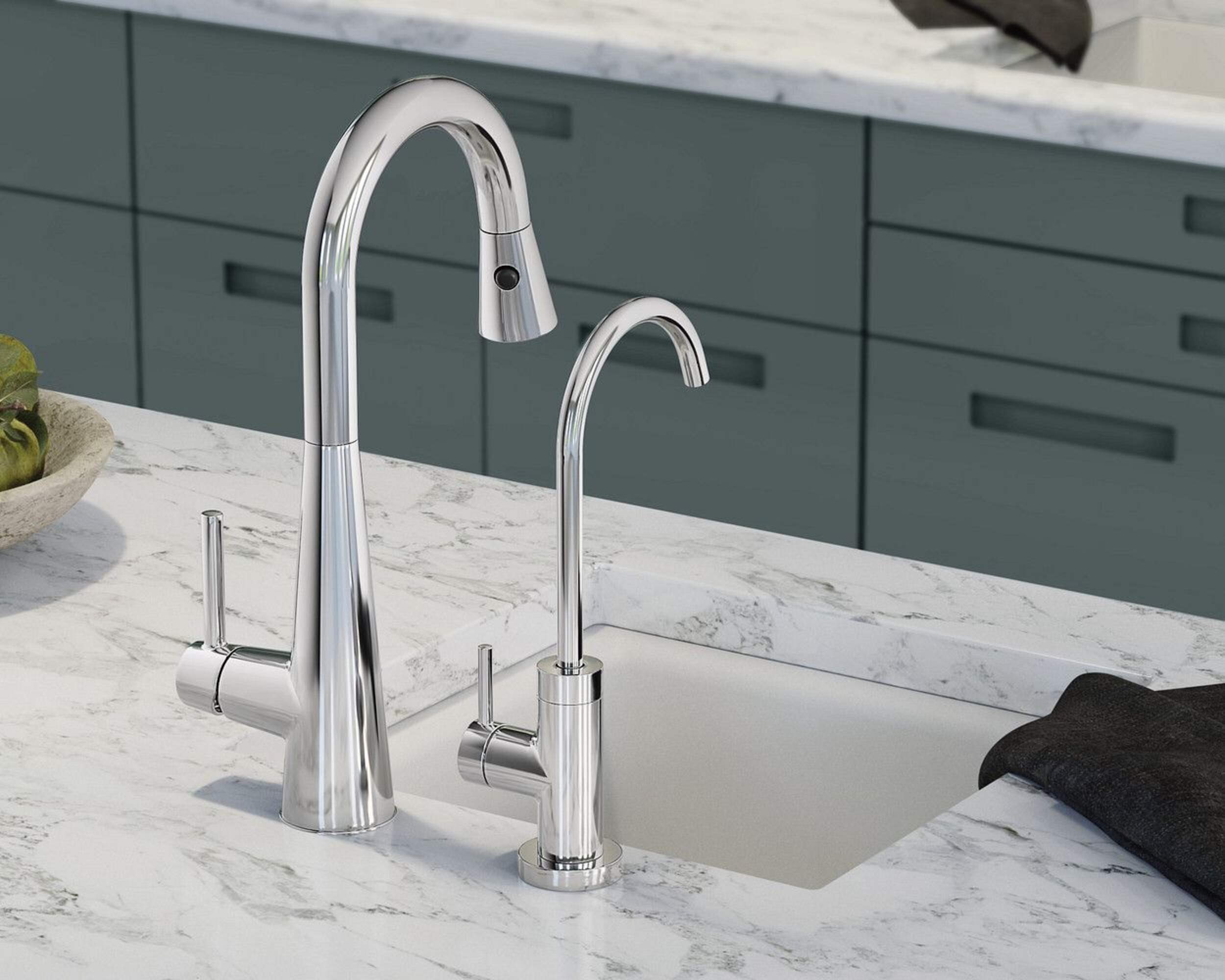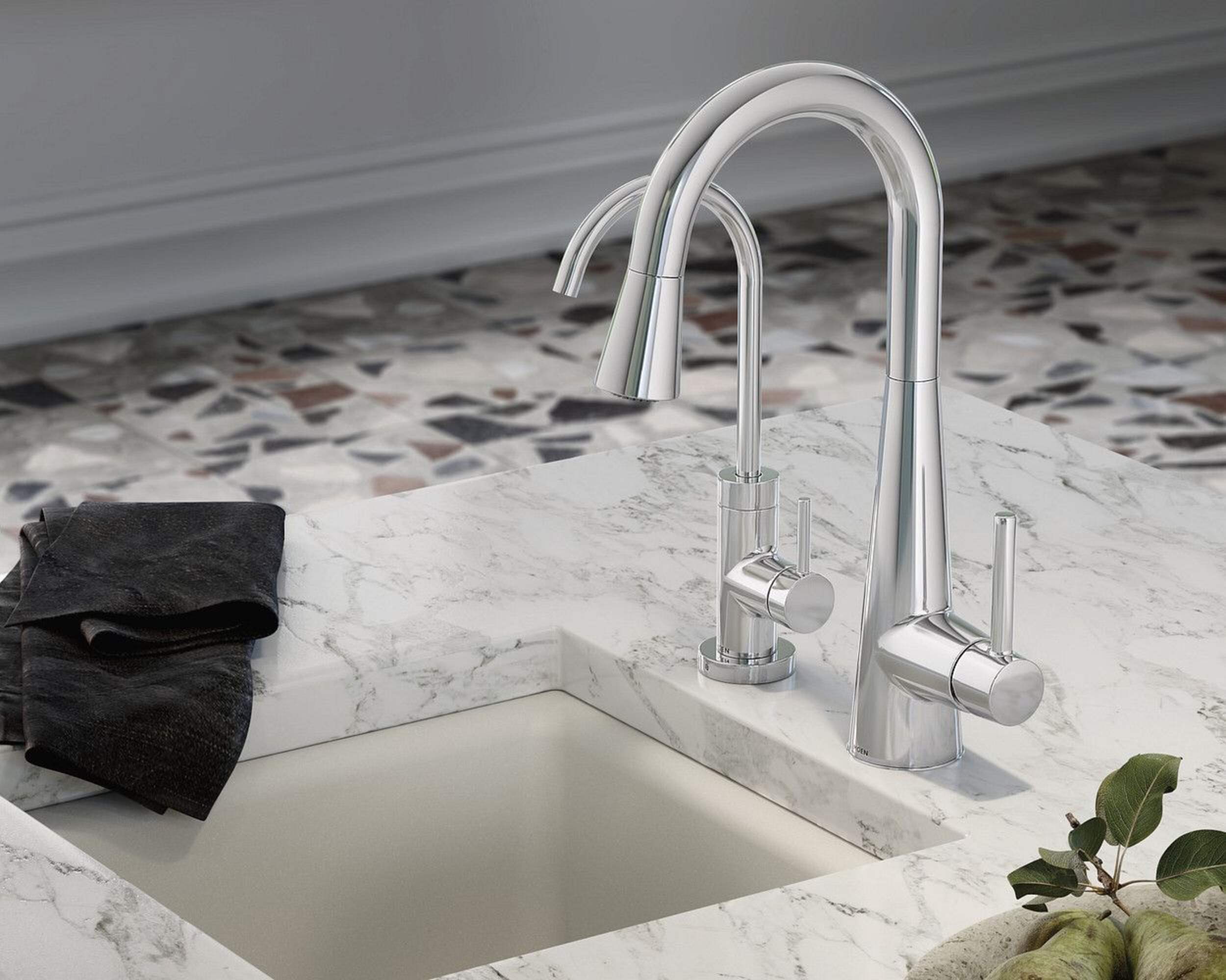 Moen Sleek 1-Handle High Arc Pulldown Bar Faucet features a chrome finish that is highly reflective for a mirror-like look to suit any decorating style