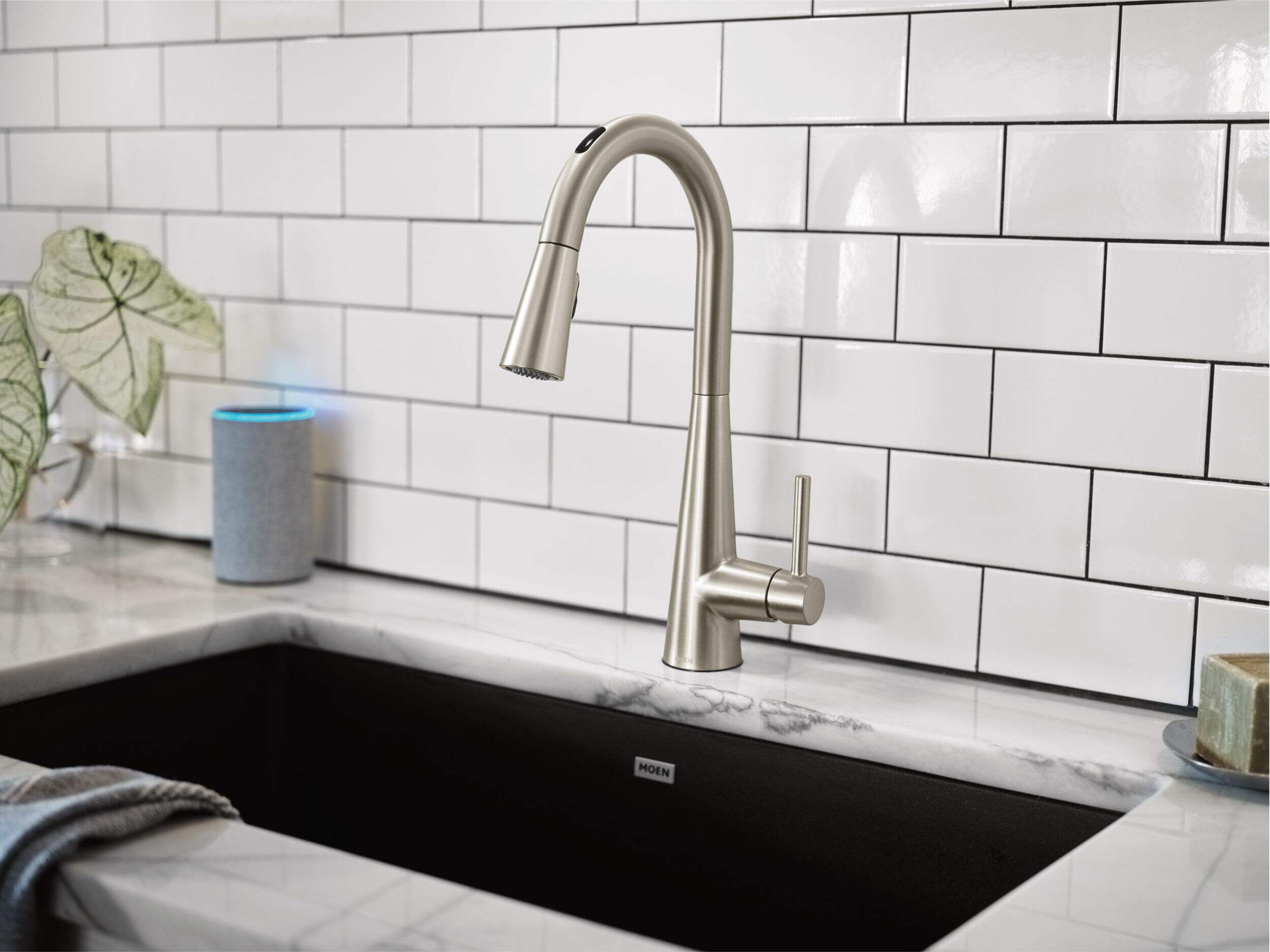 Moen Sleek U 1-Handle Pulldown Kitchen Faucet features four methods of control that you can mix and match, independent of the handle position: voice, app, hands free, and manual