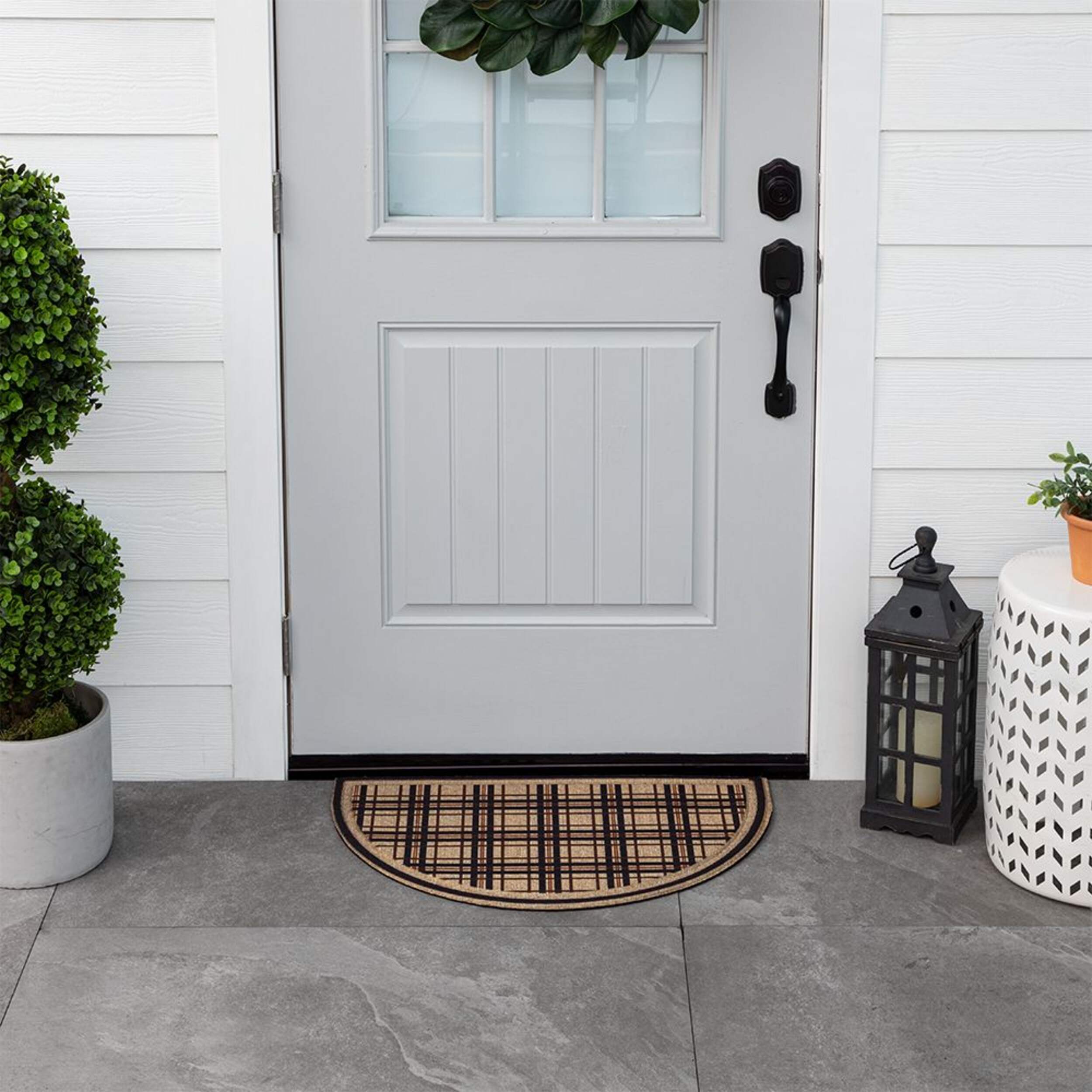 The Mohawk Home Driftwood Faux Coir Half Moon Door Mat is a stylish and durable choice for your entryway. With its elegant half-moon shape and beige color, this doormat adds a welcoming touch to your doorstep and is easy to maintain.