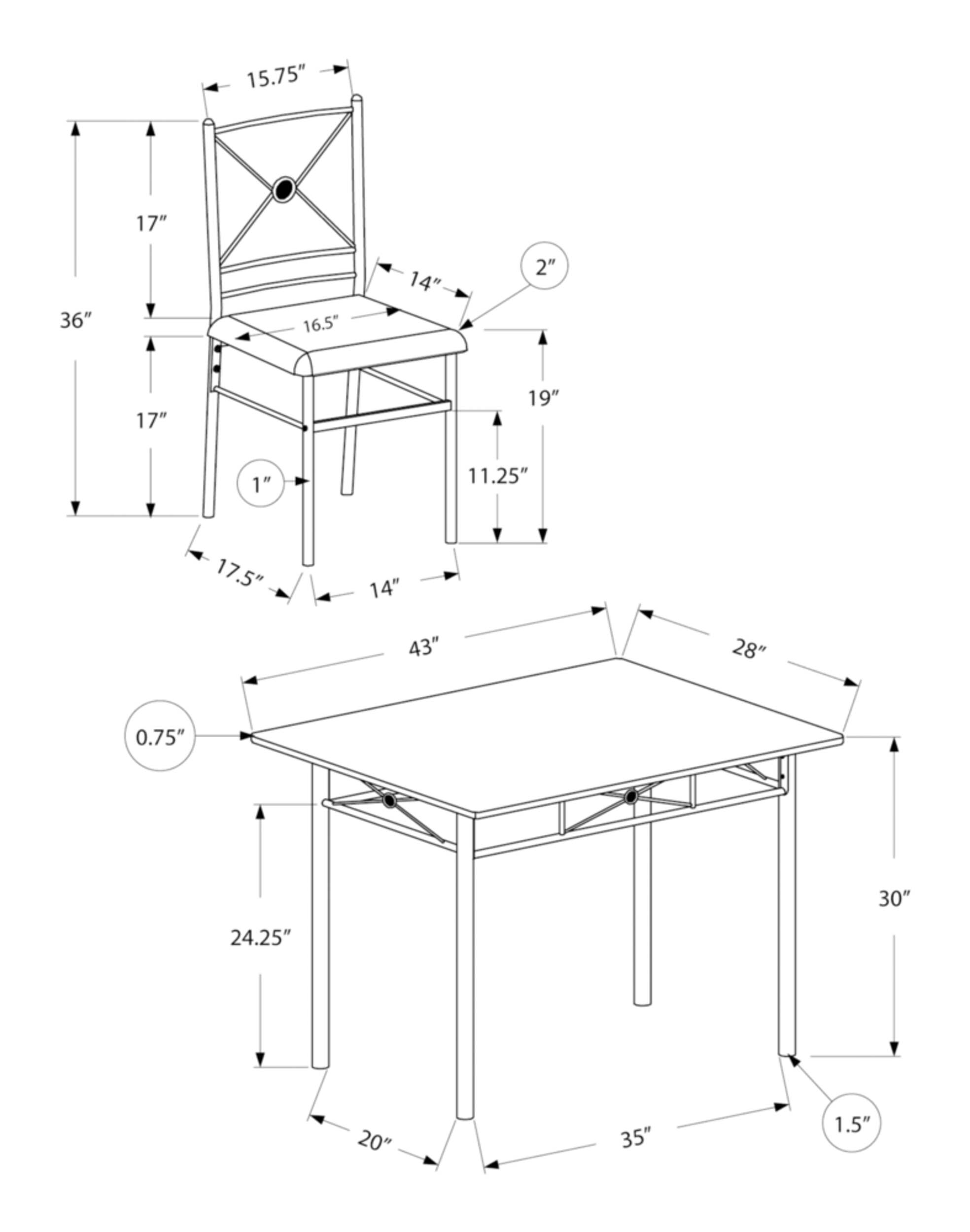 Table: 43 L x 28 D x 30" H, Chair: 16.5 L x 17.5 D x 36" H