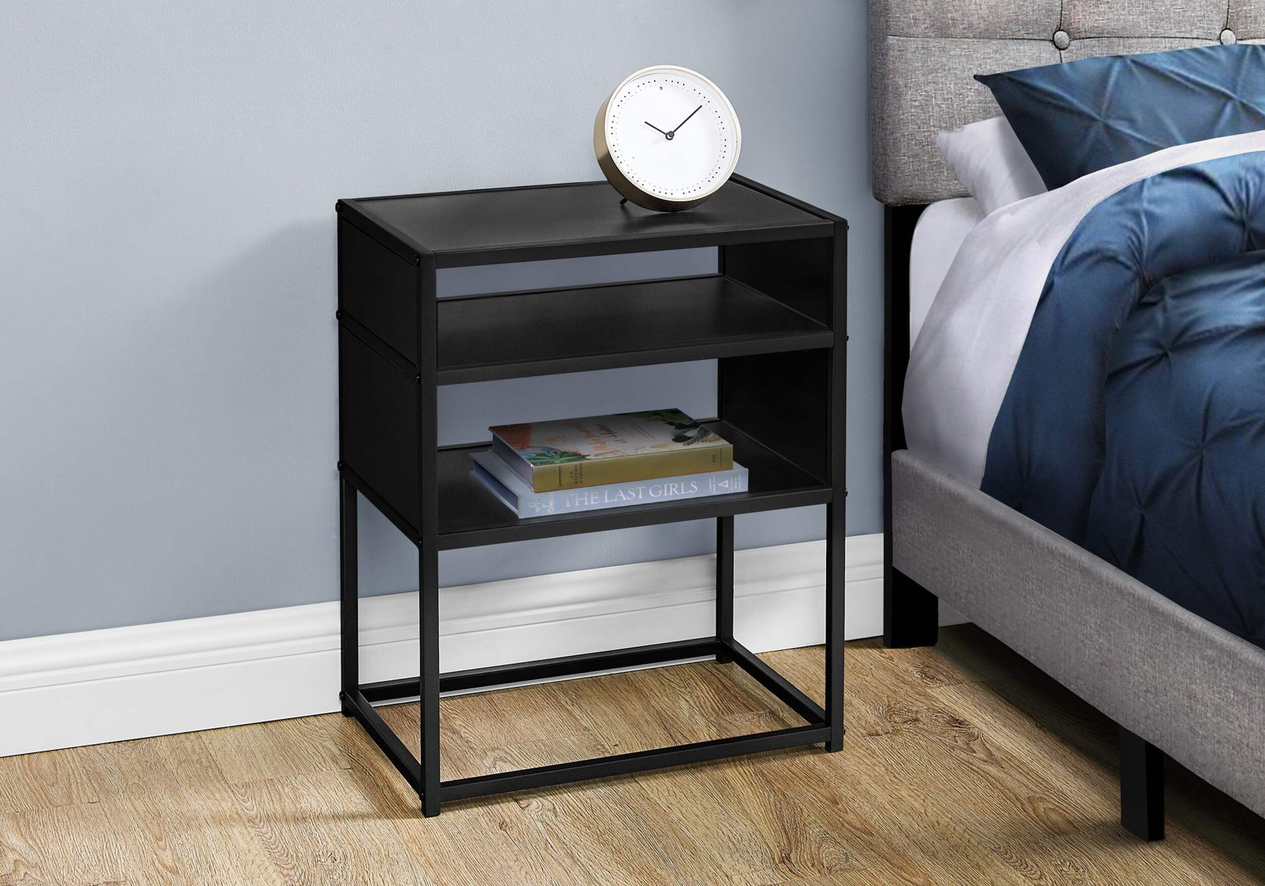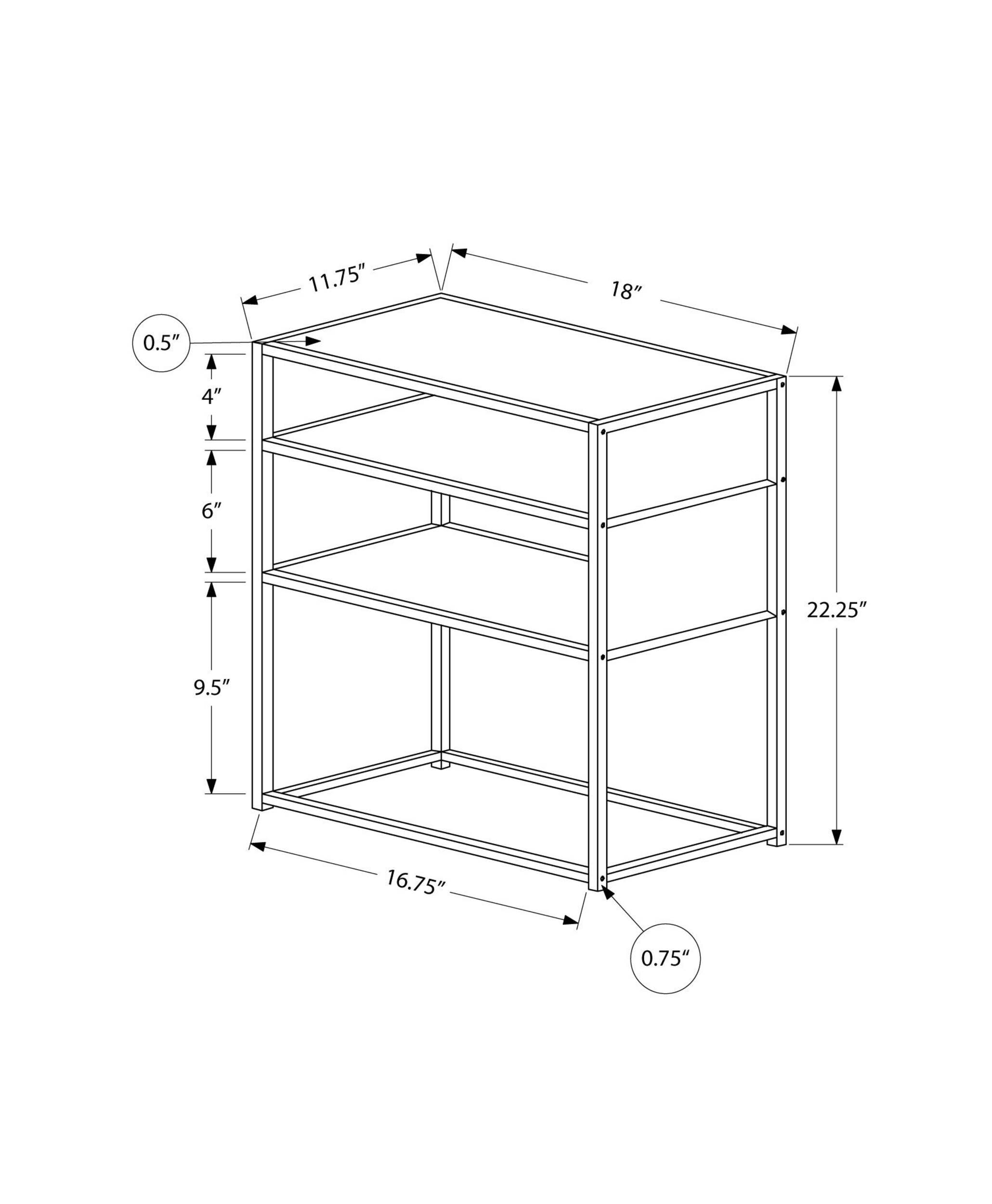 This accent table triples your storage options. The rectangular tabletop and two fixed open shelves with different heights offer flexibility for placing items you want to display or keep close by. Metal frame for a modern, trendy look. Finished on all sides, it can be positioned in any direction to conveniently fit both narrow and wide spaces in living rooms or bedrooms.