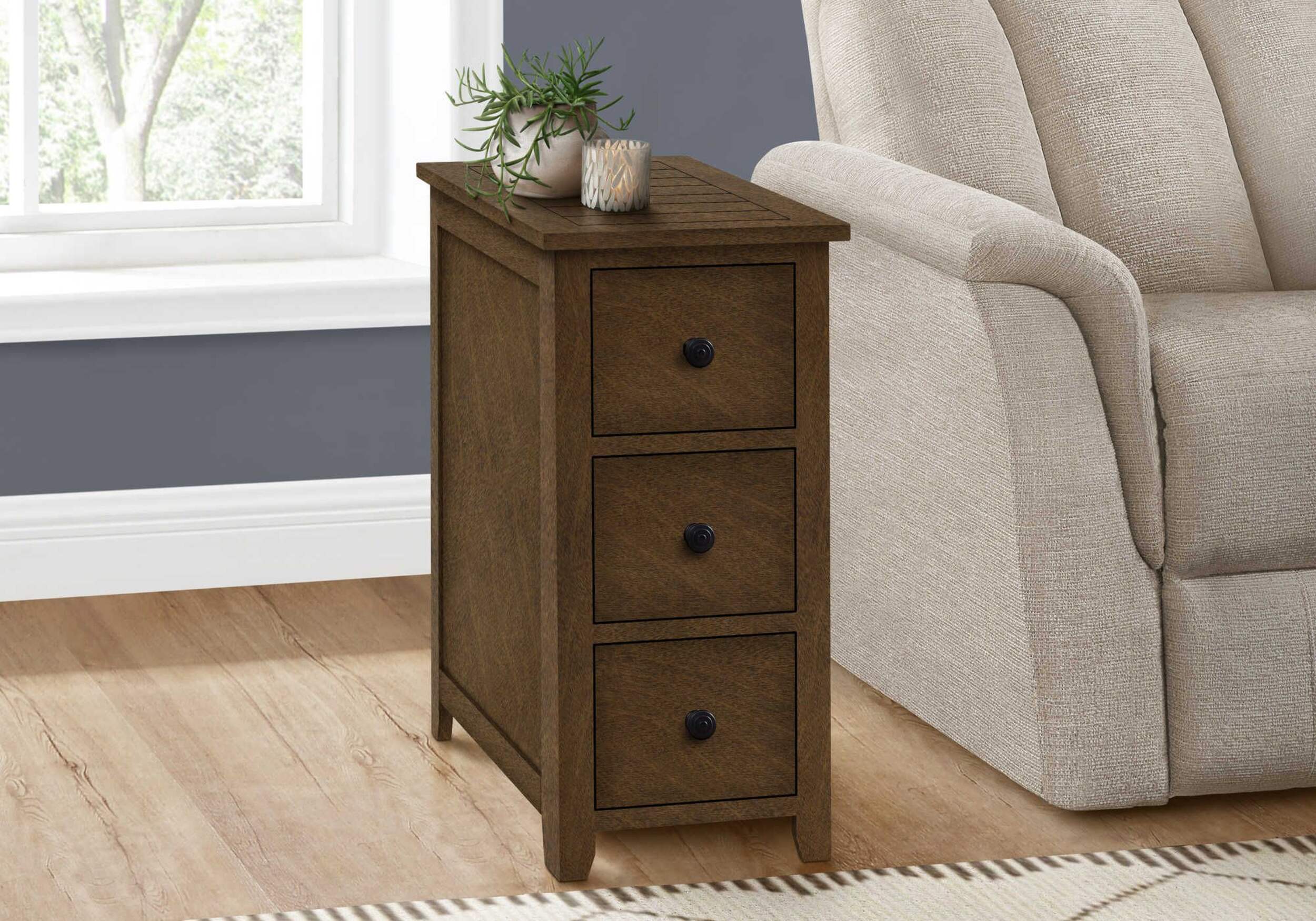Here is a practical and stylish solution for any room in your home with this 24 inch high accent table in a warm espresso brown veneer finish. With a space saving design, bring this handy table into your living room as an end or side table, or place a slim lamp on the tabletop accented with grooved lines and use it as an elegant nightstand in the bedroom. This transitional style accent table features 3 storage drawers attached with elegant black metal knobs, perfect to tuck away a book, magazine, an extra pair of glasses or remotes within reach. Crafted with durable materials, this versatile table is built for durability and long term use. Easy to assemble with illustrated instructions and all hardware with floor protectors included, this accent piece will bring that finishing touch you needed in your space.