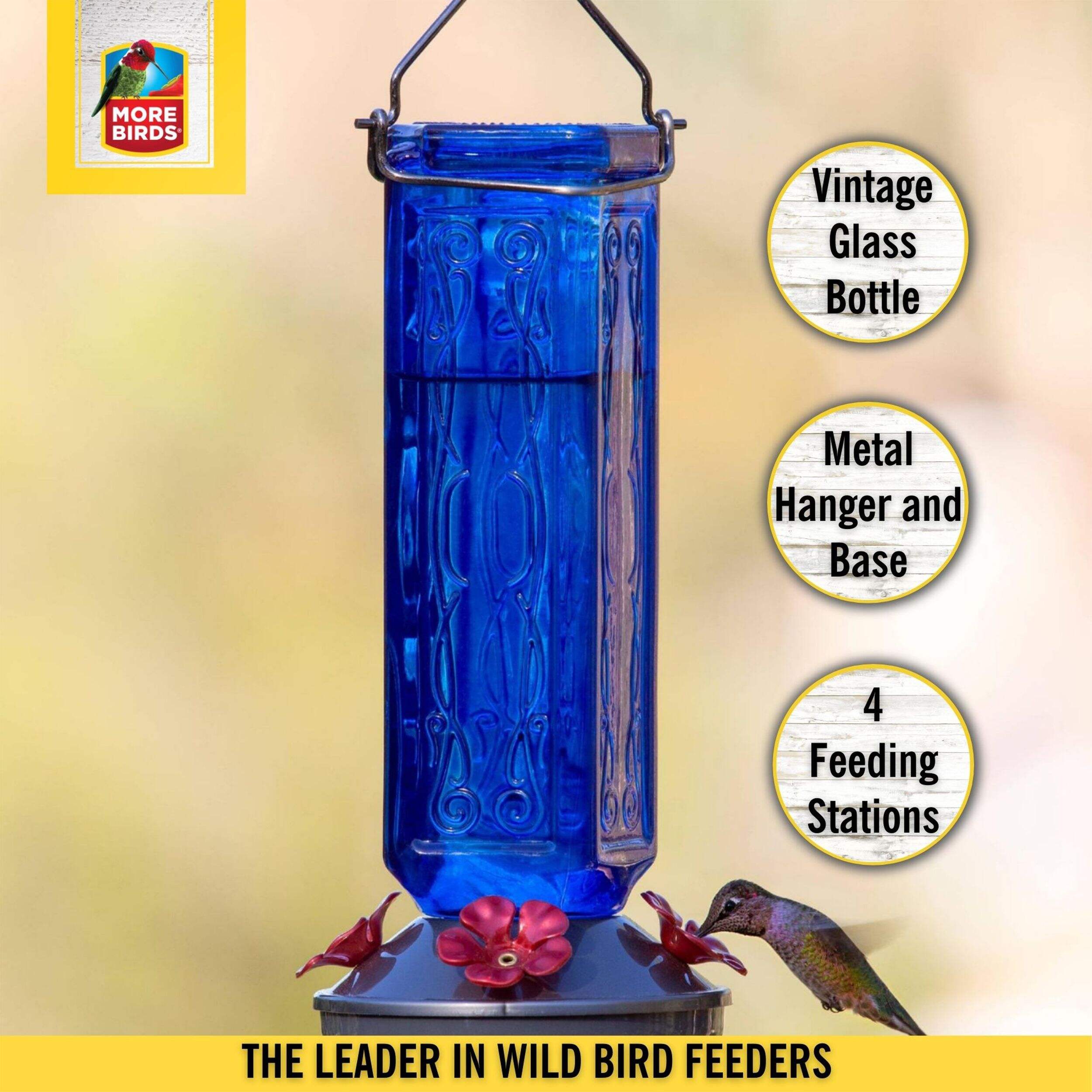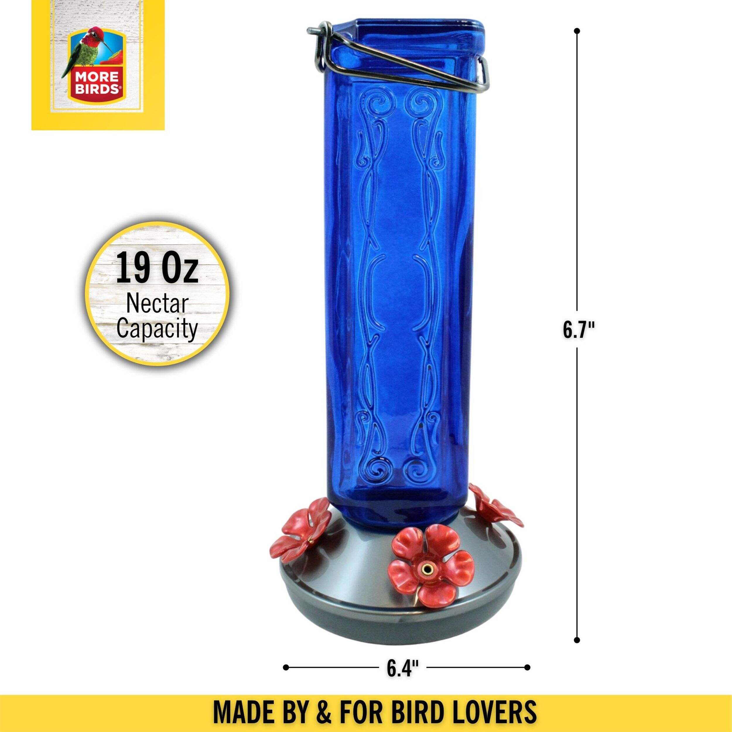 Add a splash of bygone beauty to your bird feeder collection with the More Birds® Kristina 19 ounce Hummingbird Feeder. Its wide bottle opening and detachable flat base make filling easy and cleaning a breeze. Its beautiful blue-tinted antique glass design gives it an authentic feel, while its unique 4-sided design adds an interesting touch. The feeder features a glass nectar bottle and durable plastic basin cap with 4 large, red flower feeding ports to attract more hummingbirds. With a 19-ounce nectar capacity, the Kristina provides plenty of nectar to keep hummingbirds happy and coming back for more!