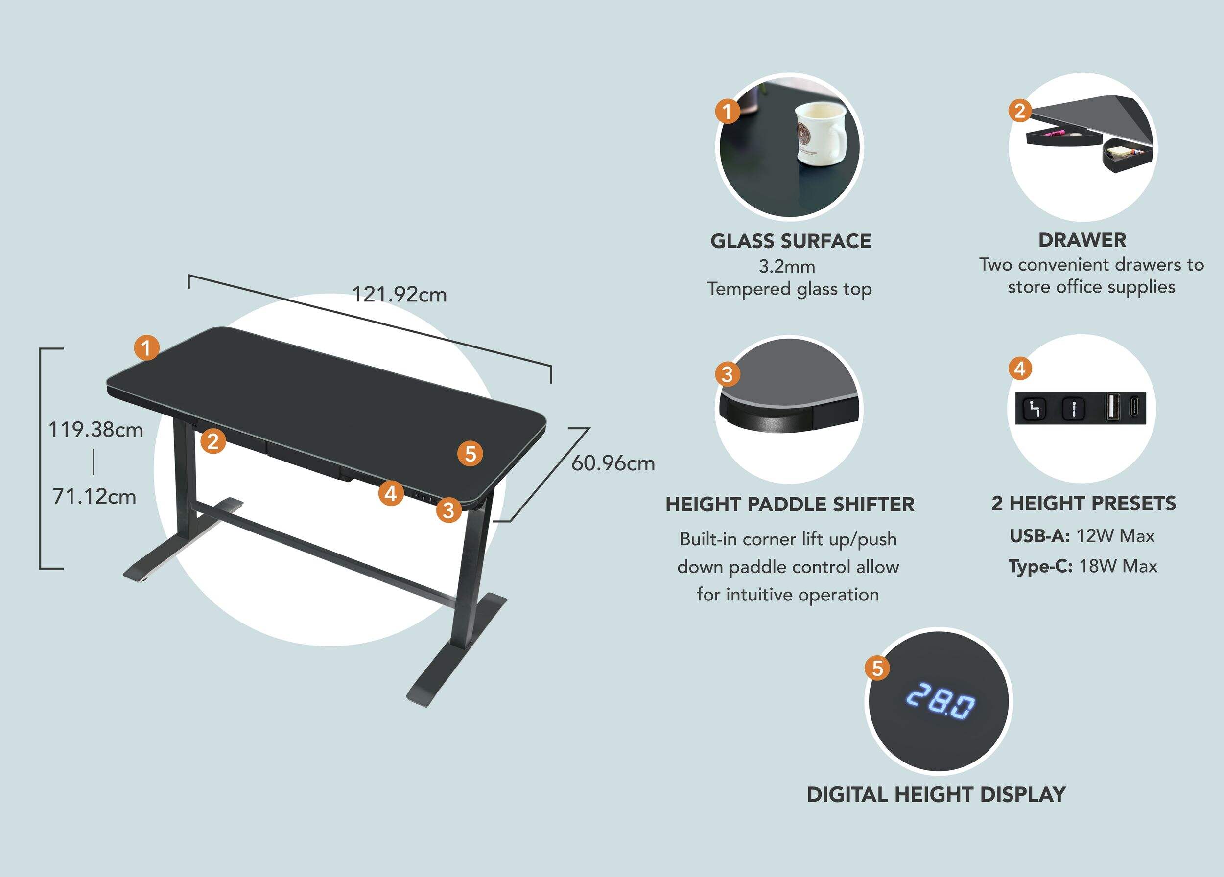 MotionWise Glass-Top Height Adjustable Standing Desk features one convenient drawer to store office supplies