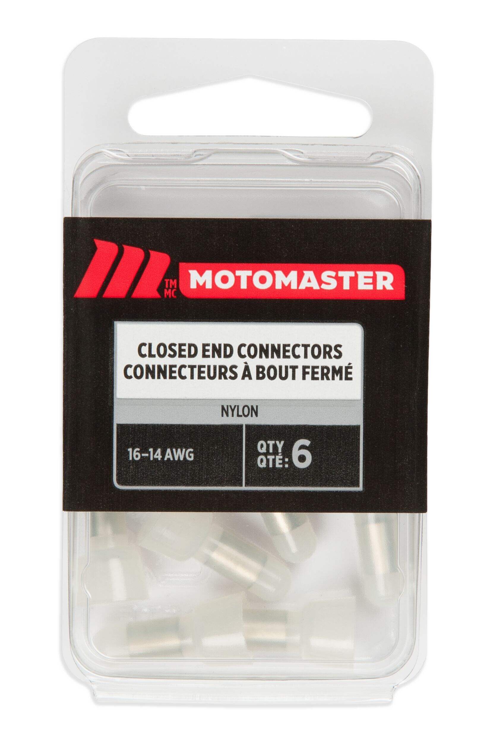 The MotoMaster 16-14 AWG Automotive Closed End Connector, 6-pk, is a must-have for any automotive electrical project. Its electro-tin plating prevents power-sapping corrosion so your stereo, lights, or winch operate at peak performance. The funnel-fed barrel makes inserting wires a cinch while multiple ‘V’ grooves grip wires tight for maximum current flow. A vinyl insulation sleeve withstands intense crimping pressure and provides dielectric strength. The locating ridge positions the wire perfectly and guides your crimping tool for a secure connection every time. Certified for quality and included in a pack of six, these 16-14 closed-end wire connectors are ideal for vehicle owners and installers alike. Whether you’re installing a trailer hitch, fog lights, or a CB radio, these connectors ensure your ride is wired for action.