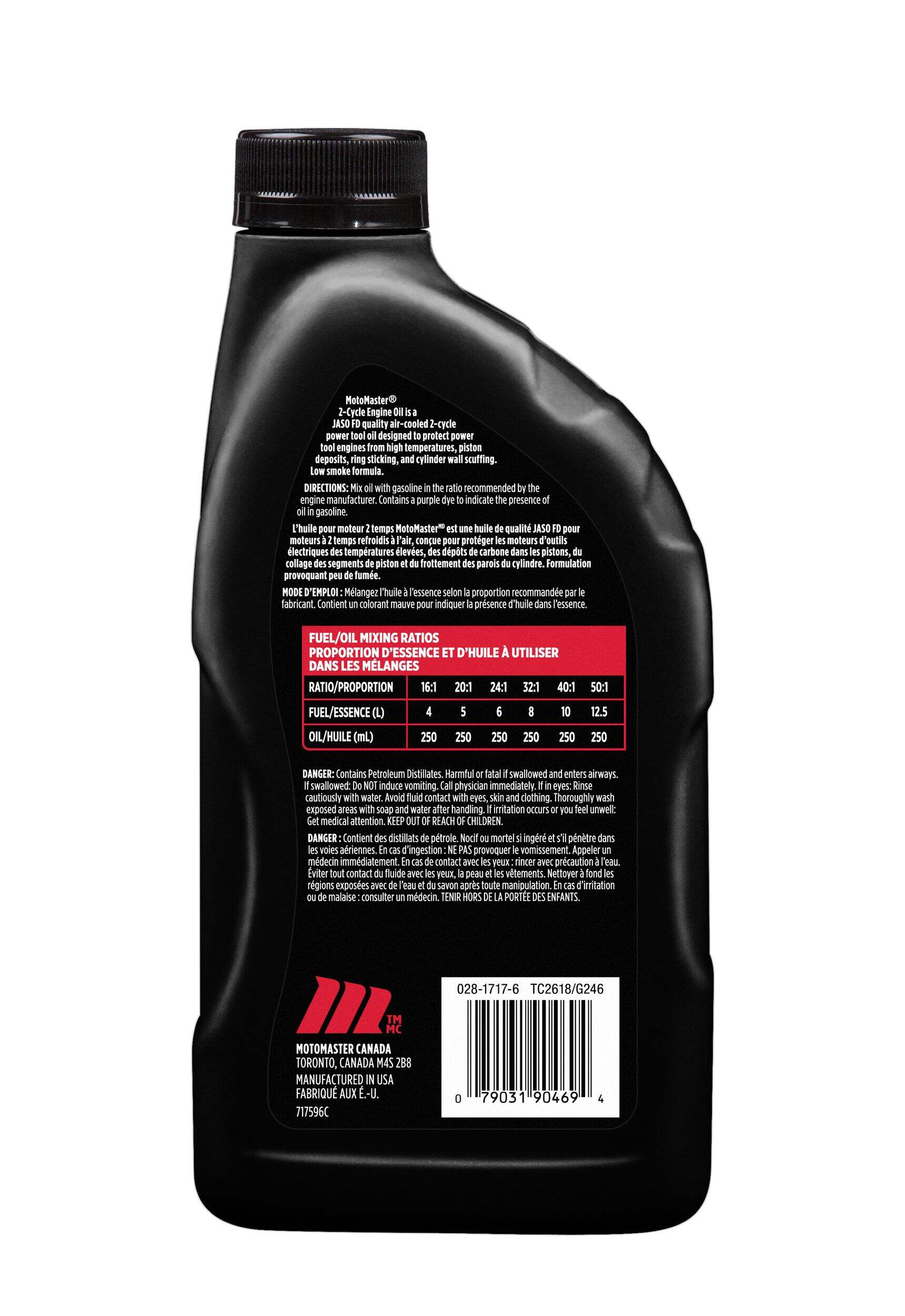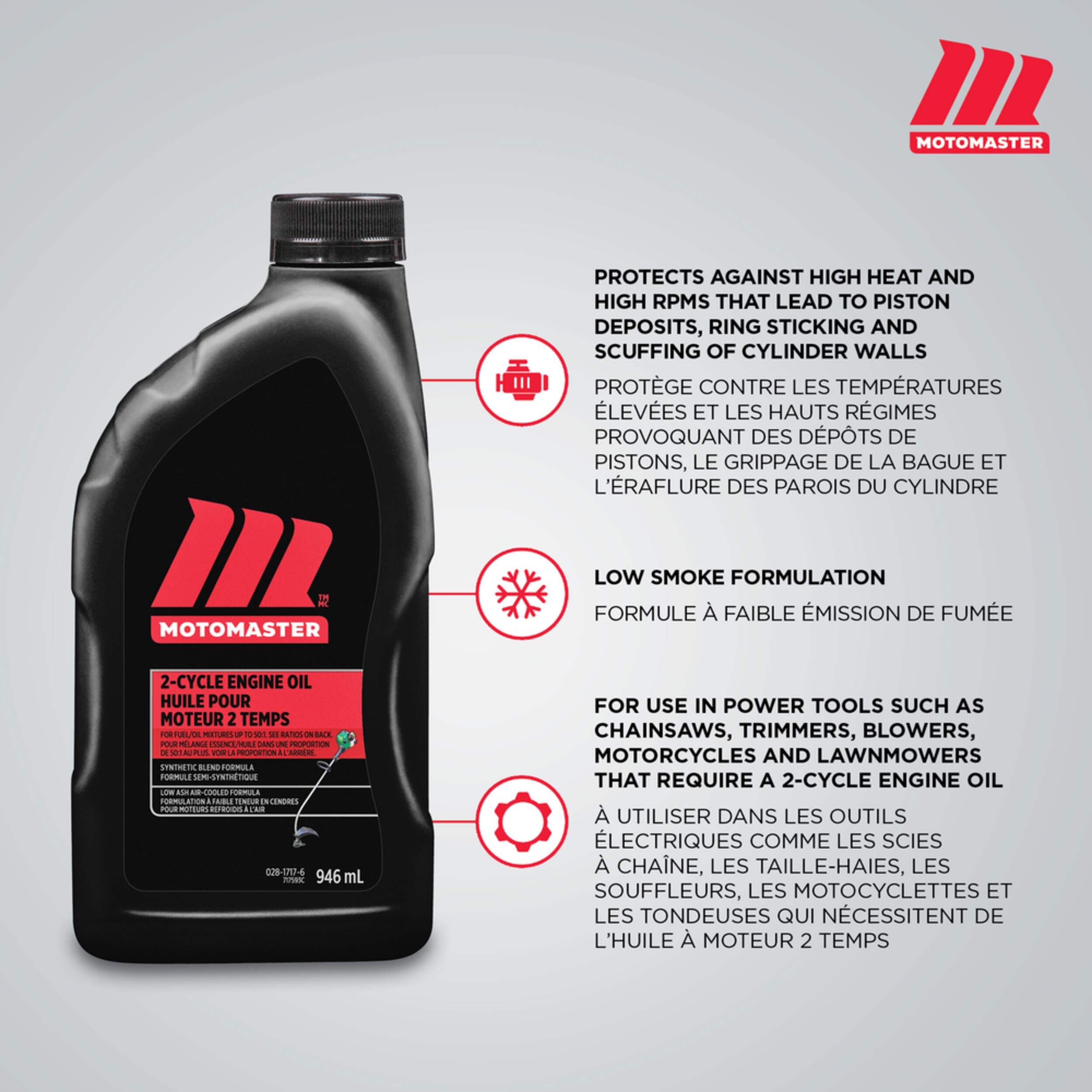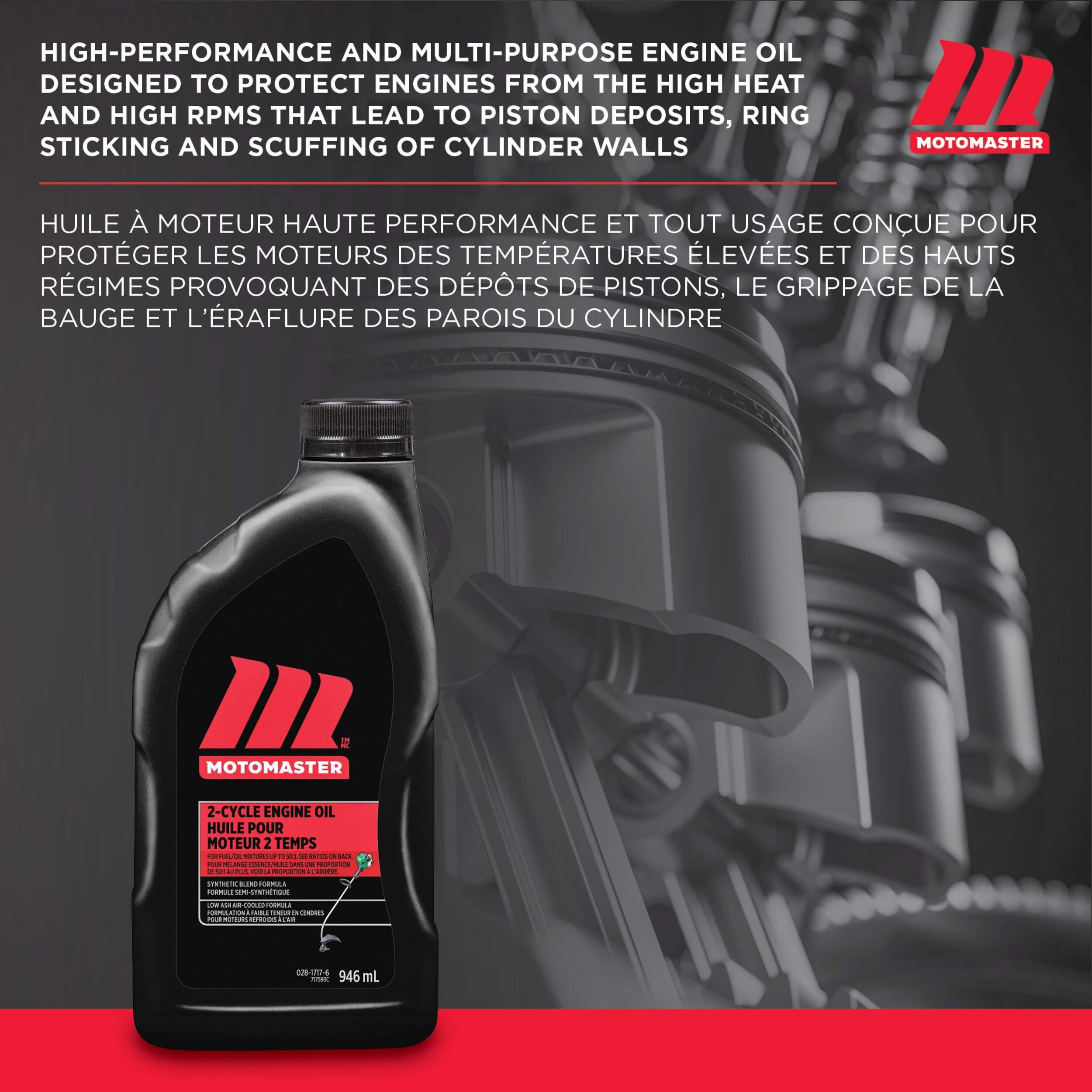 MotoMaster 2-Cycle Engine Oil, 946 mL, is a high-performance oil that protects air-cooled 2-cycle engines from heat and high RPMs. It prevents piston deposits, ring sticking, and cylinder wall scuffing. This low-smoke formula mixes easily with gasoline, even in cold weather, and works for fuel/oil ratios up to 50:1. The purple dye helps identify treated gasoline. Perfect for chainsaws, trimmers, blowers, motorcycles, and lawnmowers. Not for 4-cycle engines or TC-W3 applications.
