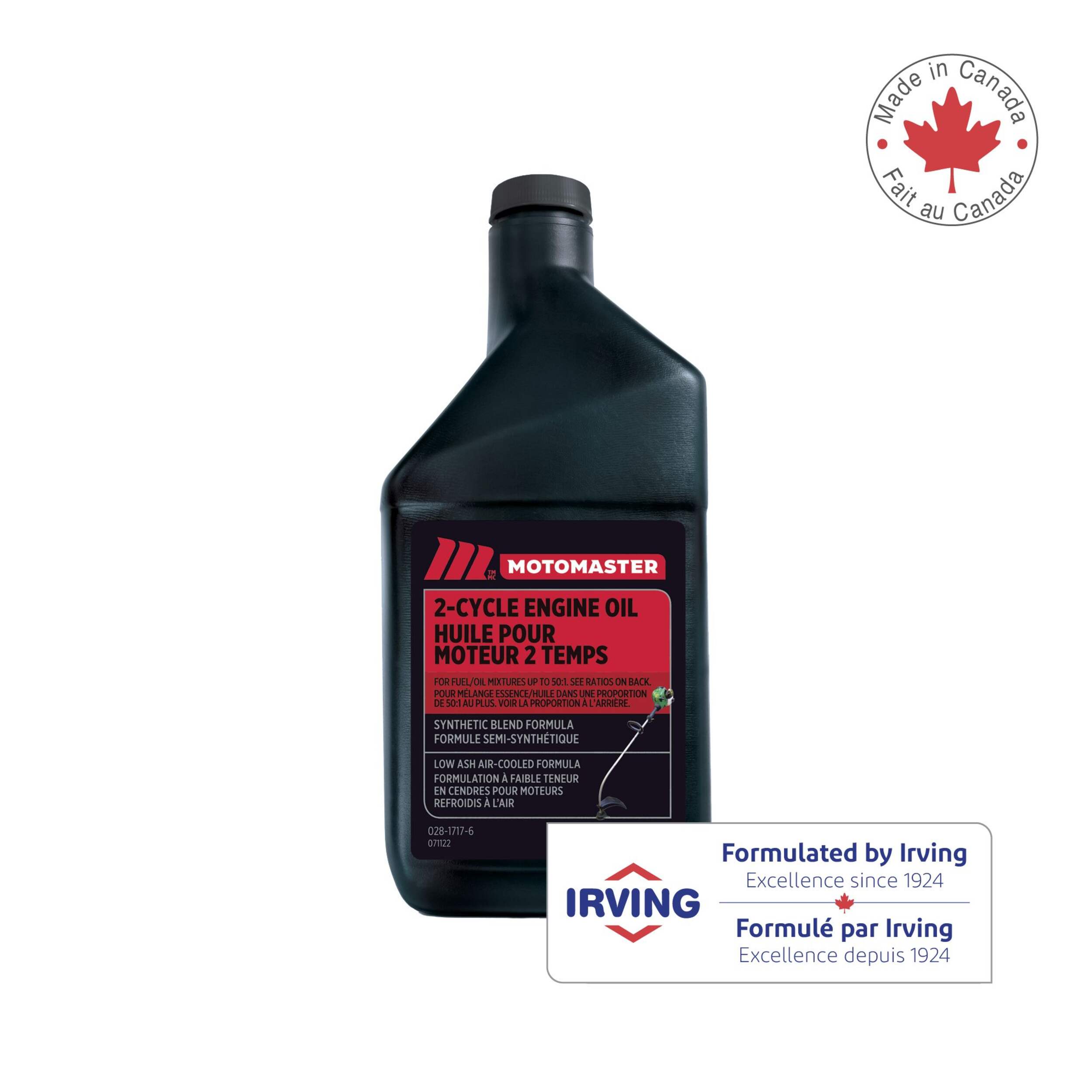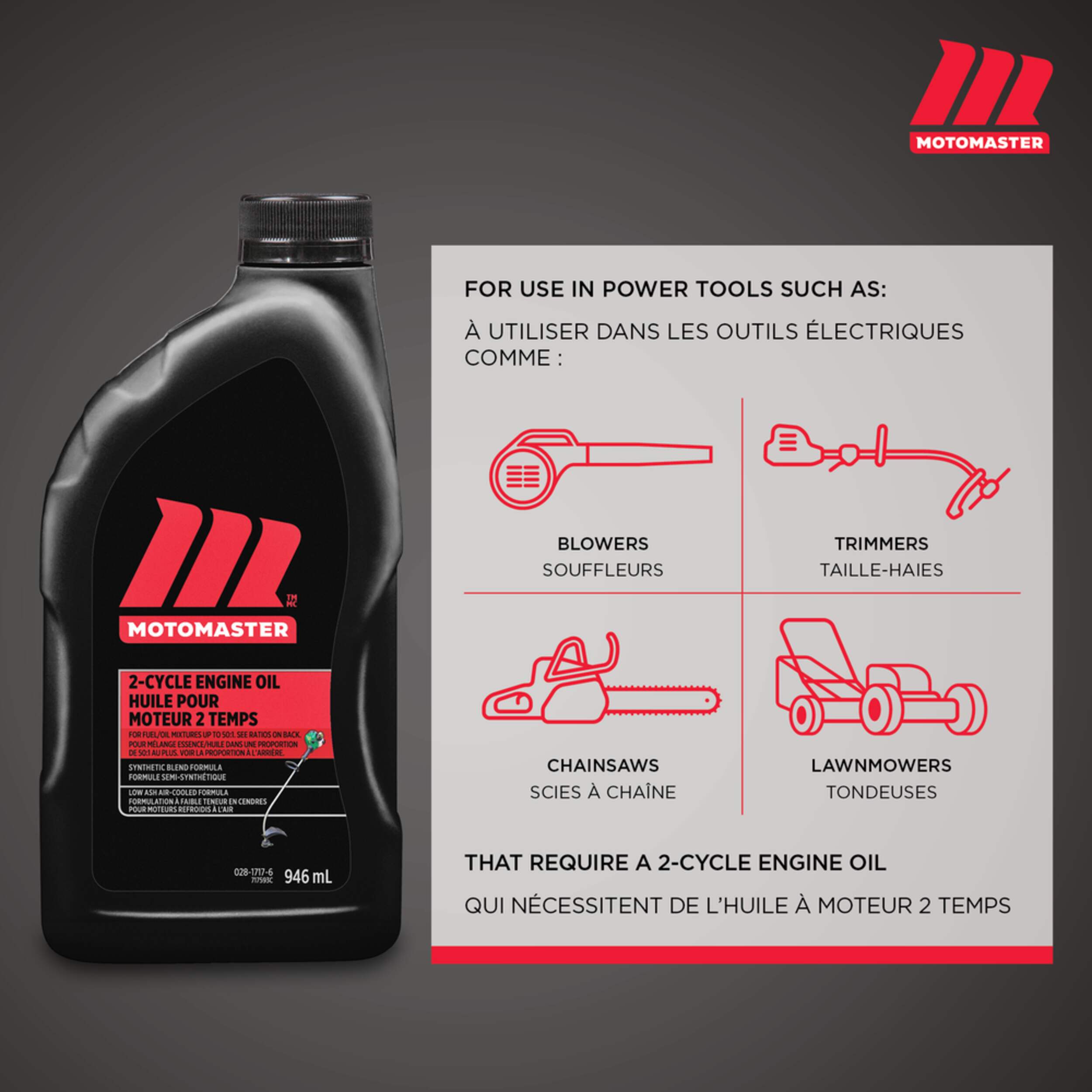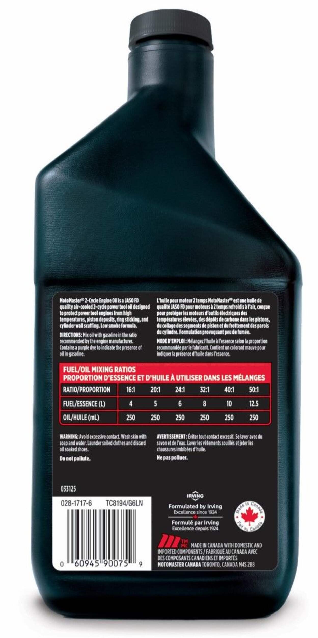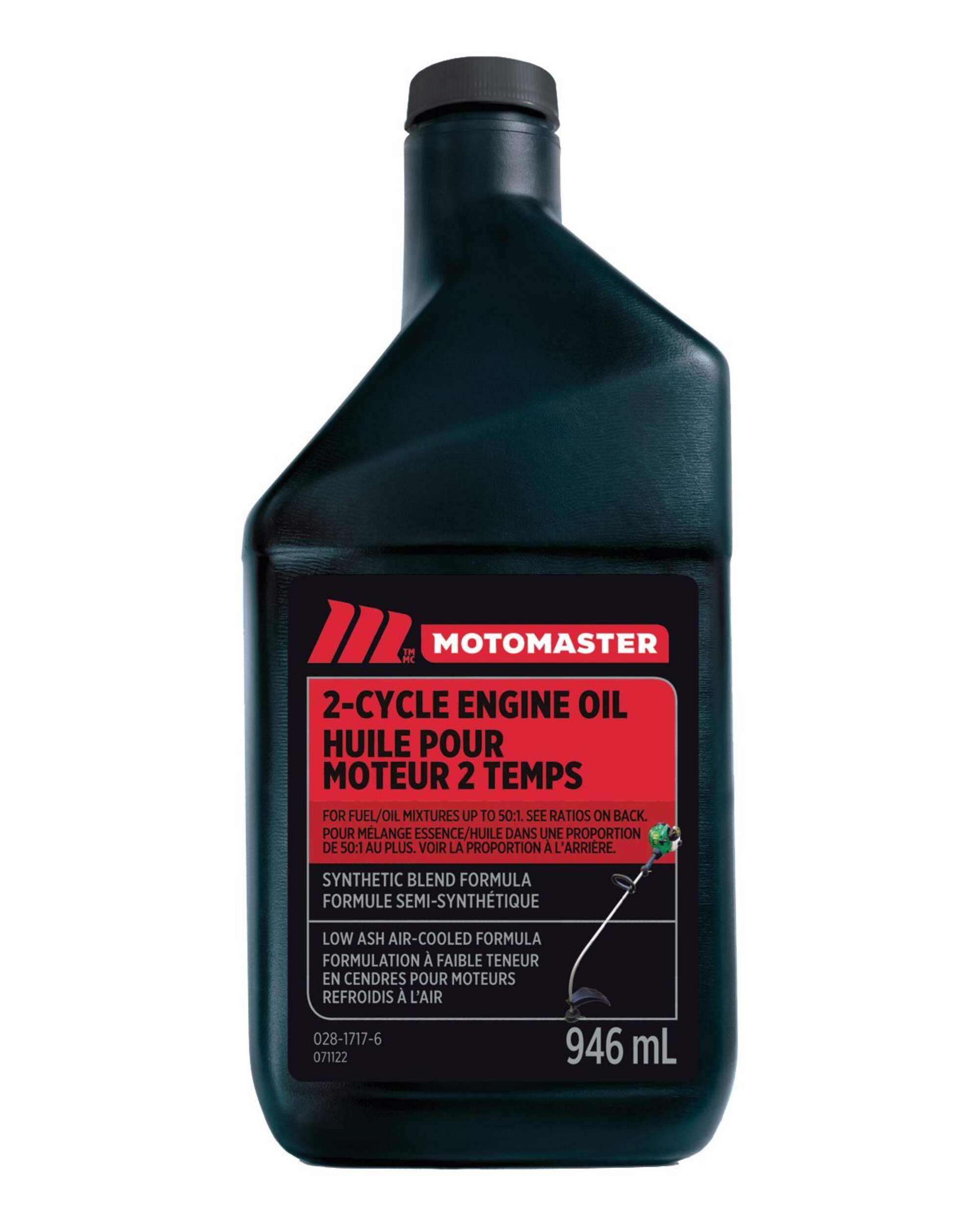 MotoMaster 2-Cycle Engine Oil, 946 mL, is a high-performance oil that protects air-cooled 2-cycle engines from heat and high RPMs. It prevents piston deposits, ring sticking, and cylinder wall scuffing. This low-smoke formula mixes easily with gasoline, even in cold weather, and works for fuel/oil ratios up to 50:1. The purple dye helps identify treated gasoline. Perfect for chainsaws, trimmers, blowers, motorcycles, and lawnmowers. Not for 4-cycle engines or TC-W3 applications.