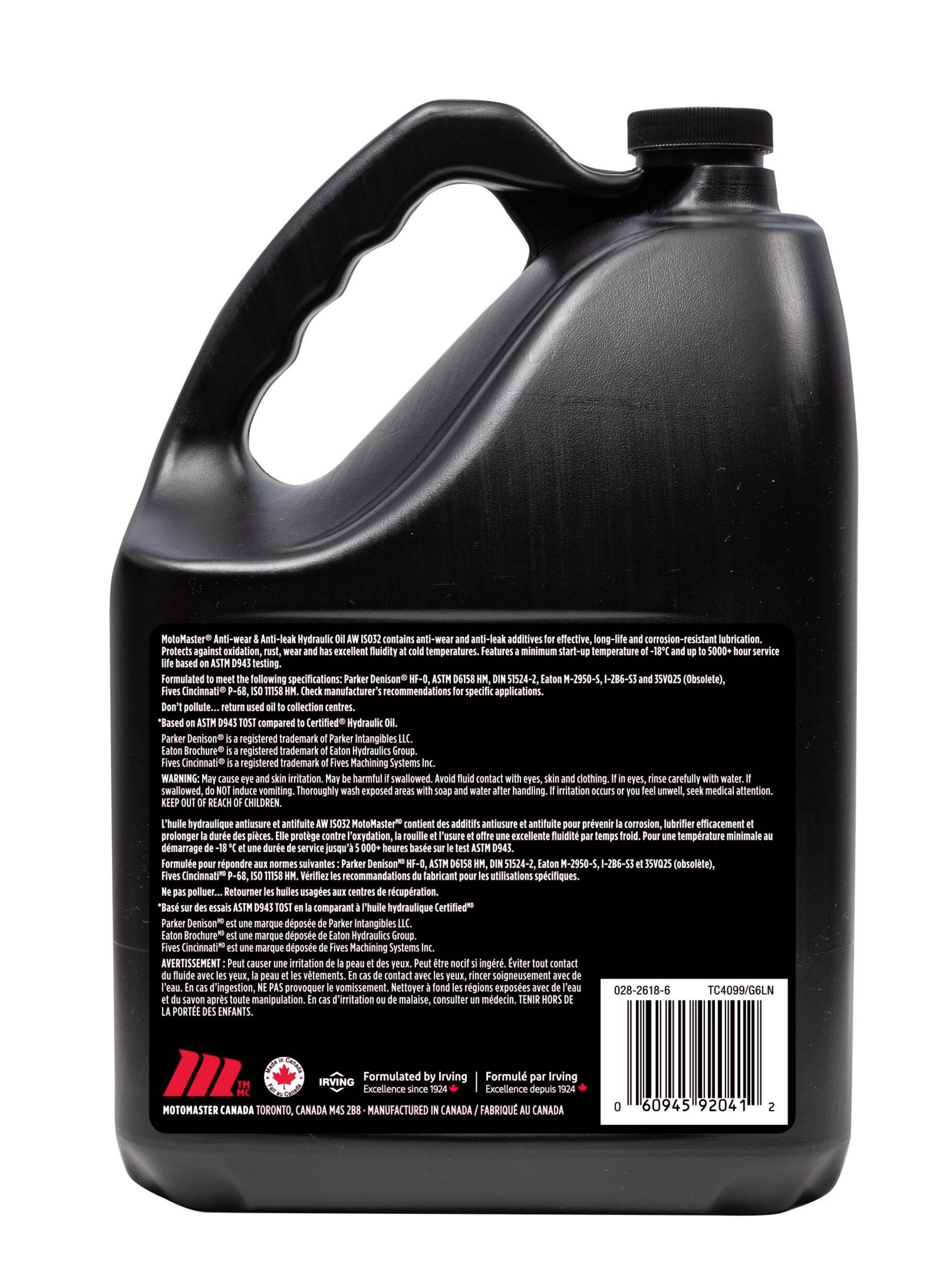 The MotoMaster AW32 Anti-Leak Hydraulic Oil is formulated with an advanced additive system to protect against oxidation, rust, and wear