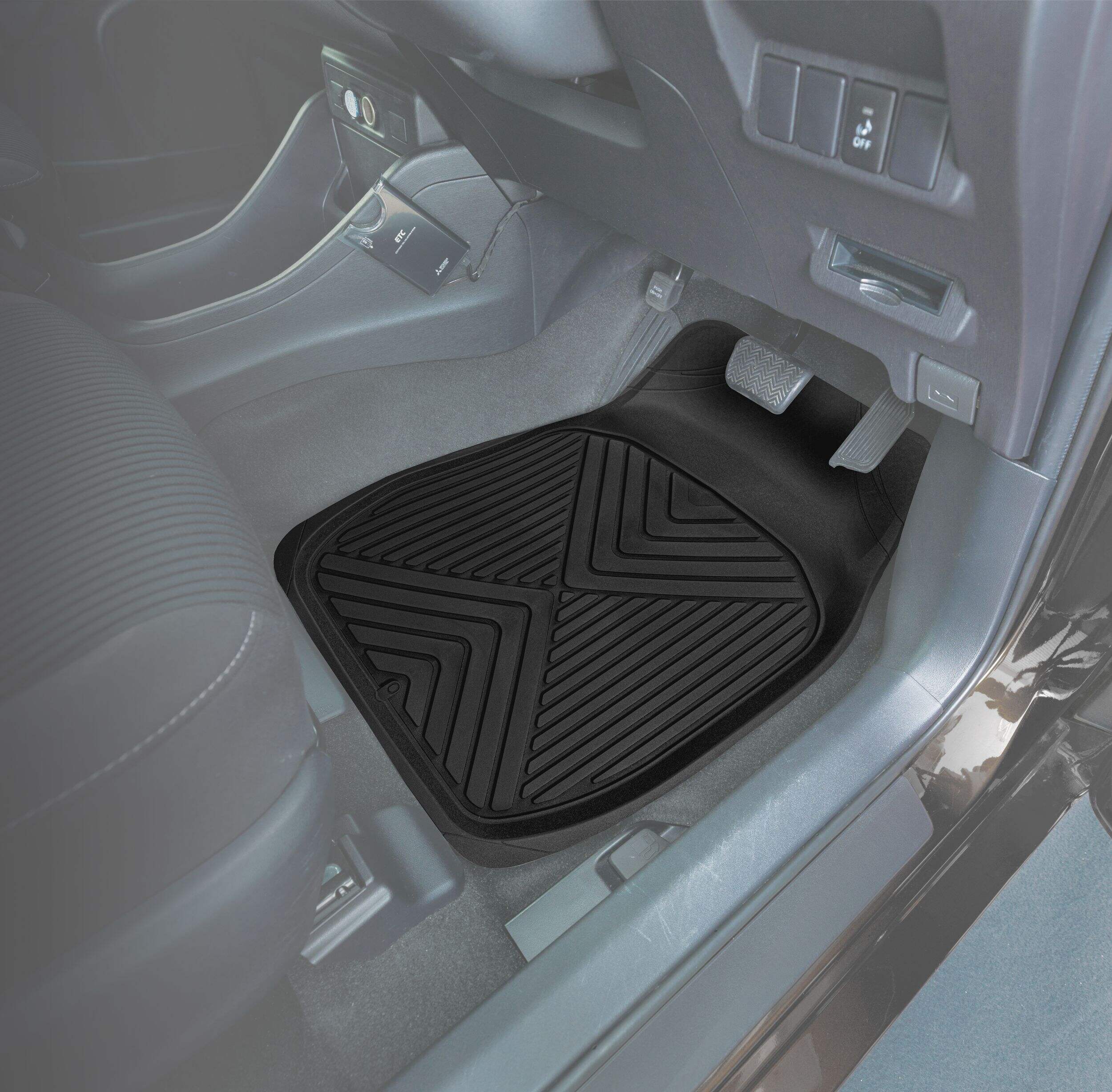 These MotoMaster Deep Tray Rubber Car Floor Mats provide superior protection for your vehicle's interior. The trim-to-fit design ensures these durable mats are customizable to suit most vehicle types. The deep tray shape is engineered to trap water, mud, snow, and ice, keeping your carpets clean and dry in any weather. Featuring an anti-slip rubber backing, these mats stay securely in place during your drive, enhancing both safety and comfort.