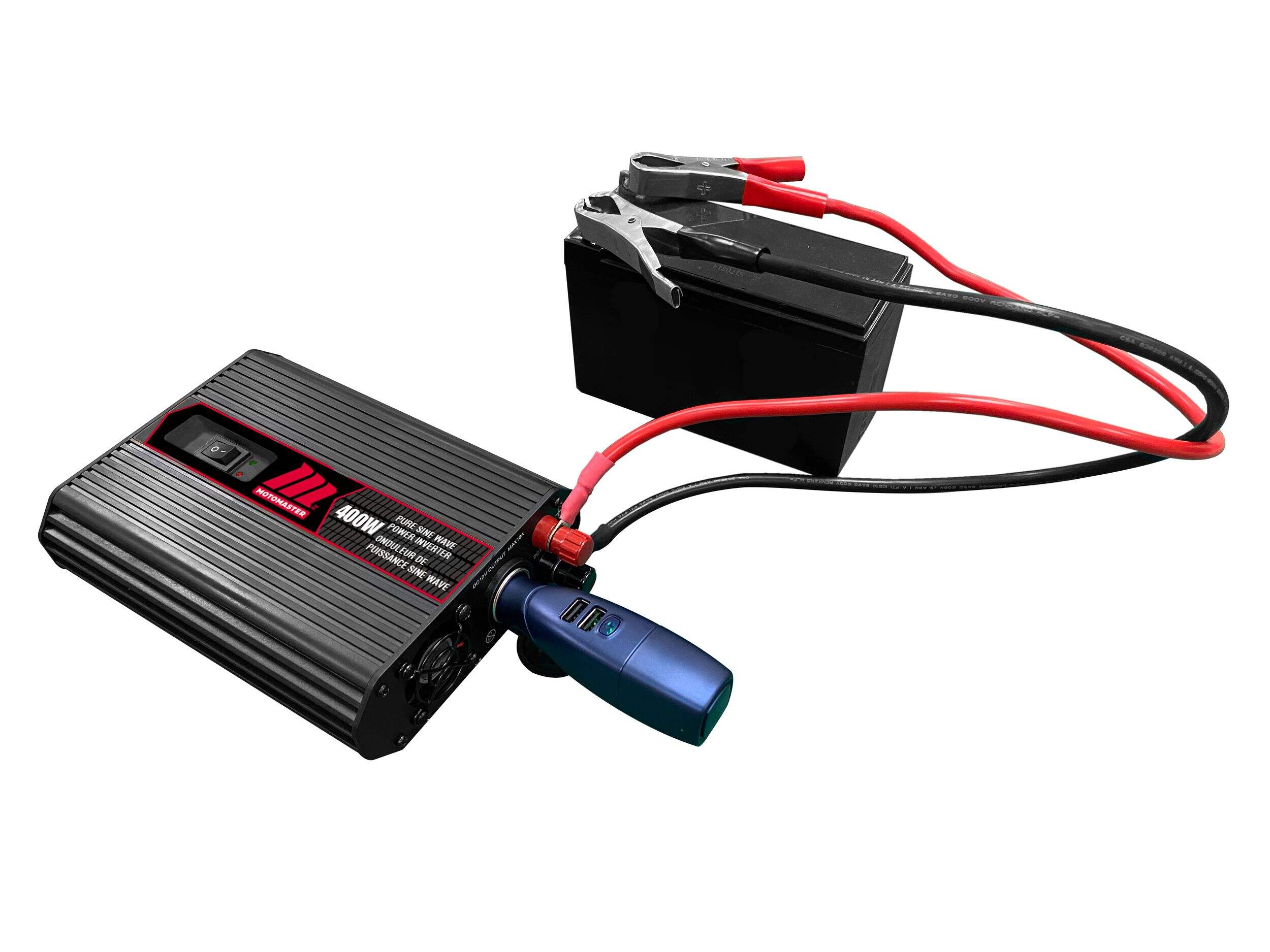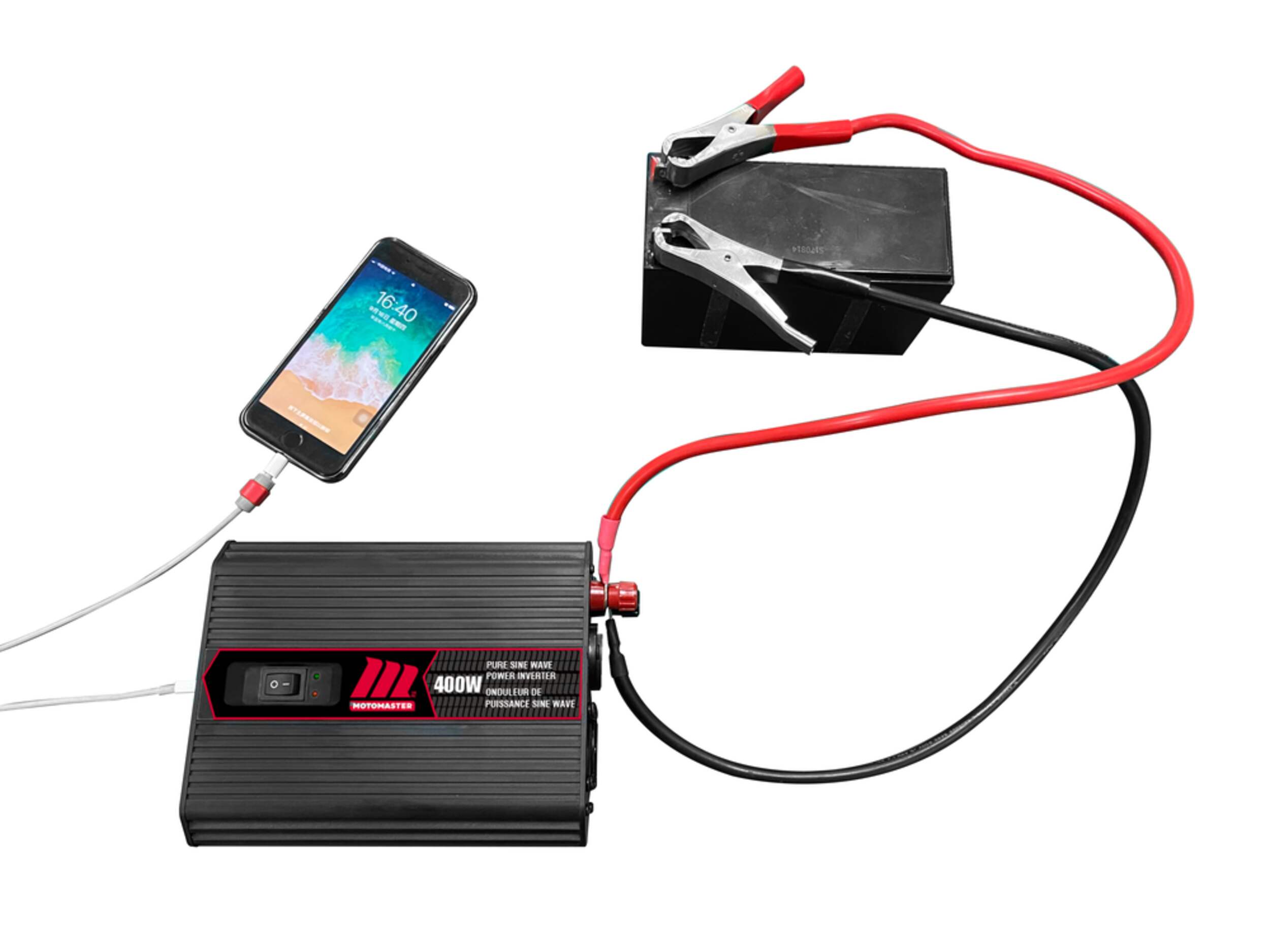The MotoMaster Eliminator 400W Pure Sine Power Inverter delivers 400 watts of continuous power and 800 watts of peak power, enough for running power tools, portable electronics or other devices on the go. It features two AC outlets and two 3.1A USB ports to charge everything from laptops and tablets to phones. With its pure sine wave output, the Eliminator 400W Inverter provides clean power for your applications.