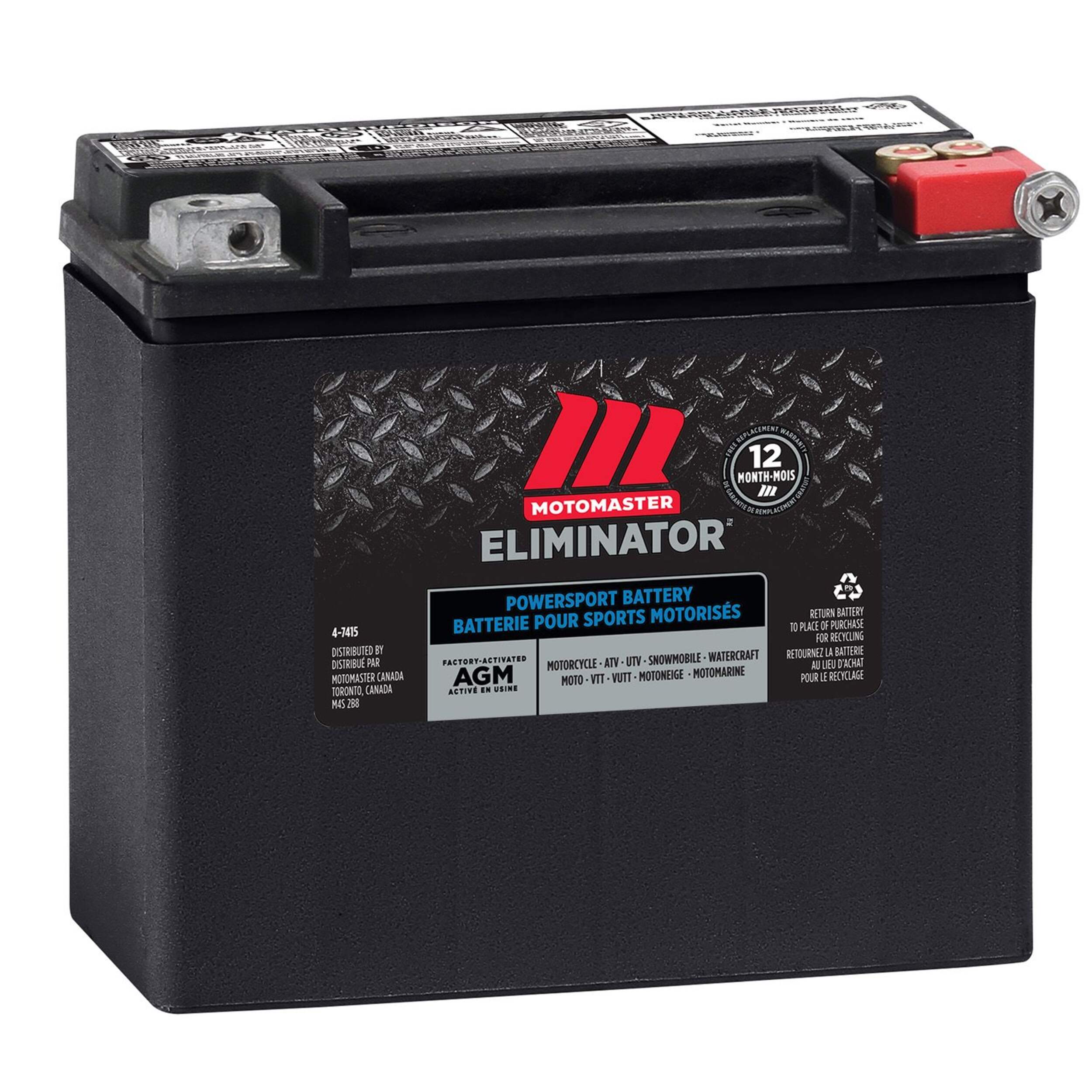The MotoMaster Eliminator AGM Factory-Activated Powersports Battery, ETX20L, is a maintenance-free option providing high cranking power and durability. Factory-filled, sealed, and charged, this battery is ready to install for immediate use with motorcycles, ATVs, UTVs, snowmobiles, and personal watercraft. Compared to conventional flooded batteries, it offers a longer lifespan, faster recharge time, and a low self-discharge rate, ideal for seasonal use. The spill-proof design eliminates the need for fluid top-ups or the risk of acid spills. It's also vibration resistant, a common cause of battery failure. This 12-volt battery weighs 15 pounds and measures 175 x 88 x 156 mm.