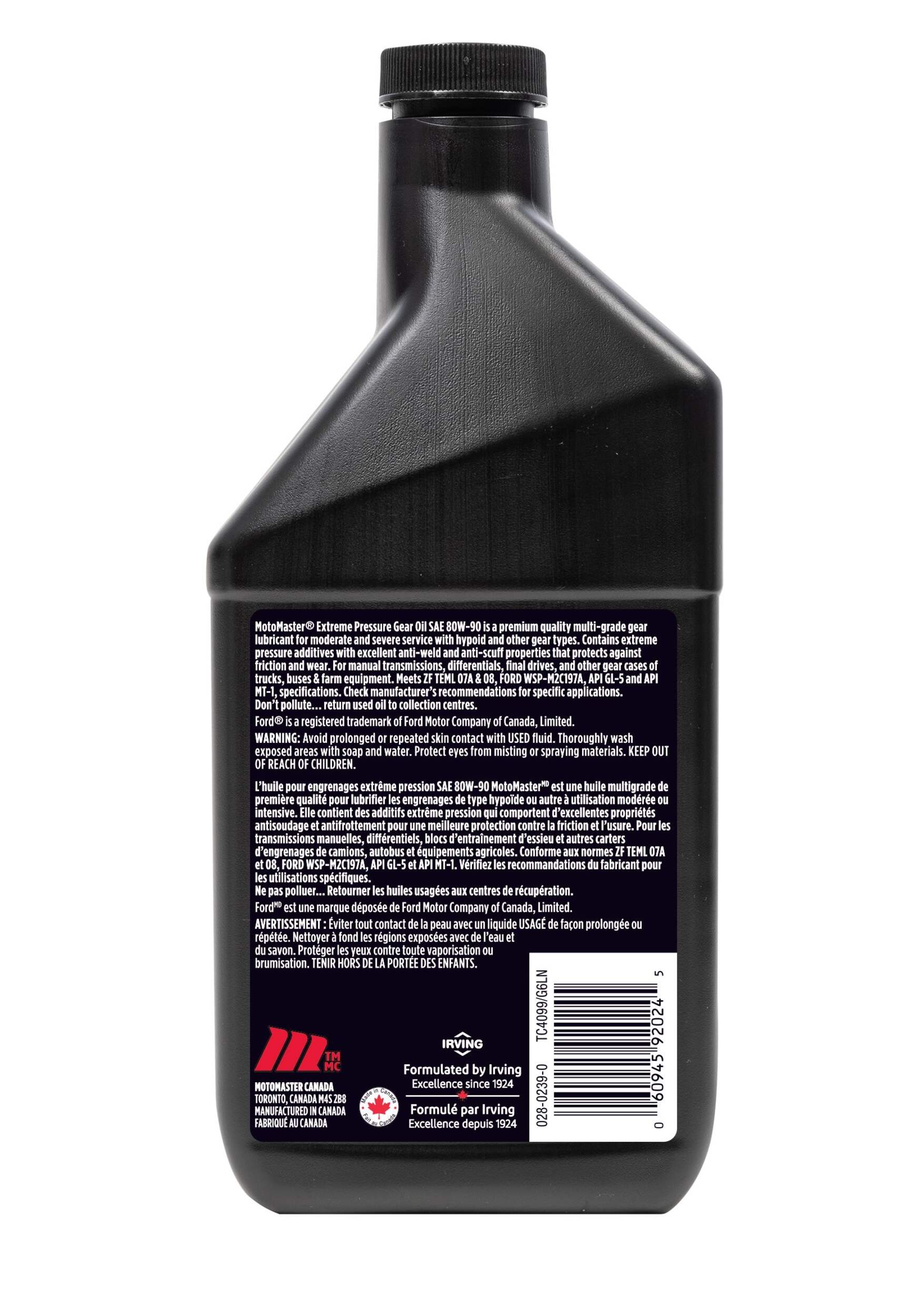 The MotoMaster Extreme Pressure Gear Oil 80W90, 946 mL, is designed to endure the extreme pressures faced by commercial vehicles and heavy equipment. It provides essential anti-weld, anti-scuff, and anti-wear protection for critical components, ensuring peak performance. This heavy-duty gear oil has a 80W90 viscosity that offers maximum protection across a wide range of temperatures. Whether in scorching heat or freezing cold, this oil flows smoothly to protect gears from damage.