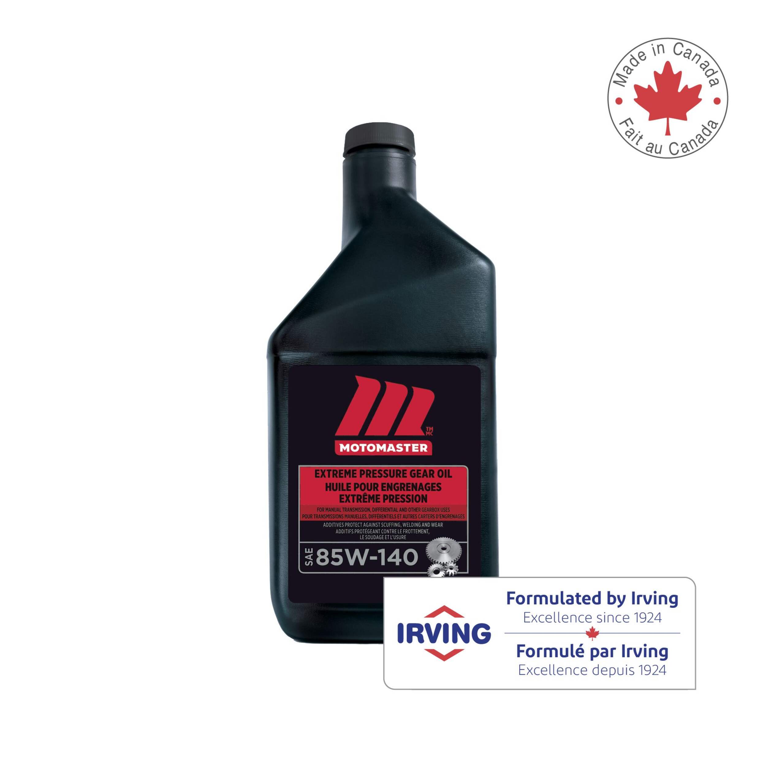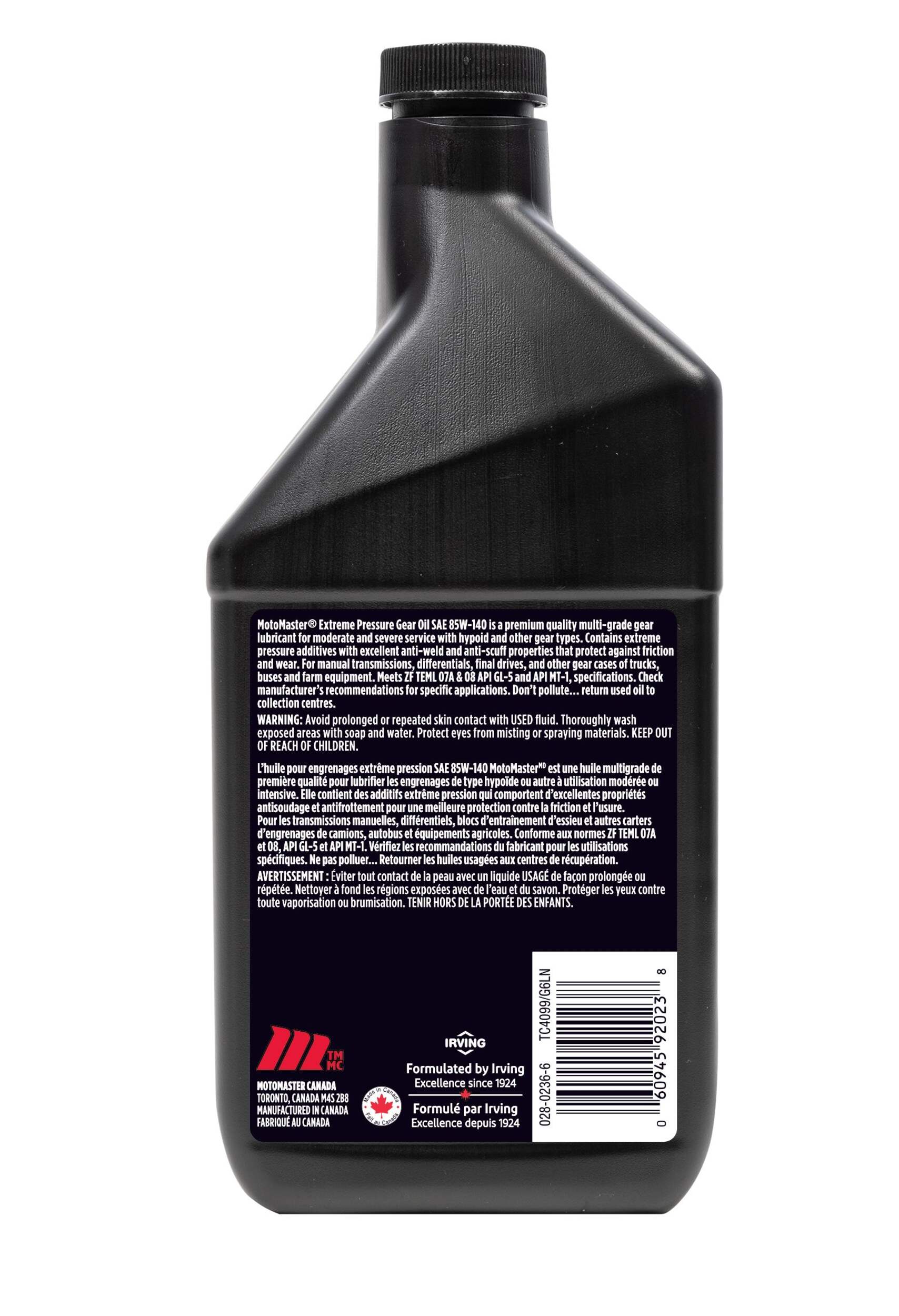 The MotoMaster Extreme Pressure Gear Oil 85W140, 946-mL, is built to withstand the extreme pressures of commercial vehicles and heavy equipment. Formulated with a sulfur-phosphorus additive system, it delivers anti-weld, anti-scuff, and anti-wear protection so critical components like transmissions, differentials, and final drives can operate at peak performance. The heavy-duty gear oil has an 85W140 viscosity that ensures maximum protection across a wide range of temperatures. Whether in blistering heat or frigid cold, this oil flows freely to shield gears from damage. It also resists viscosity loss from shear stress, maintaining its protective barrier in even the most demanding applications. This 85W140 gear oil meets API GL-5 and MT-1 standards, making it a trusted choice for manual transmissions, axles, and final drives in trucks, buses, and farm equipment. Its extreme pressure additives prevent the scuffing, welding, and premature wear that lead to costly repairs and downtime. With nearly a litre of premium protection, this gear oil is perfect for refilling or replacing the factory fill in most standard and heavy-duty differentials.