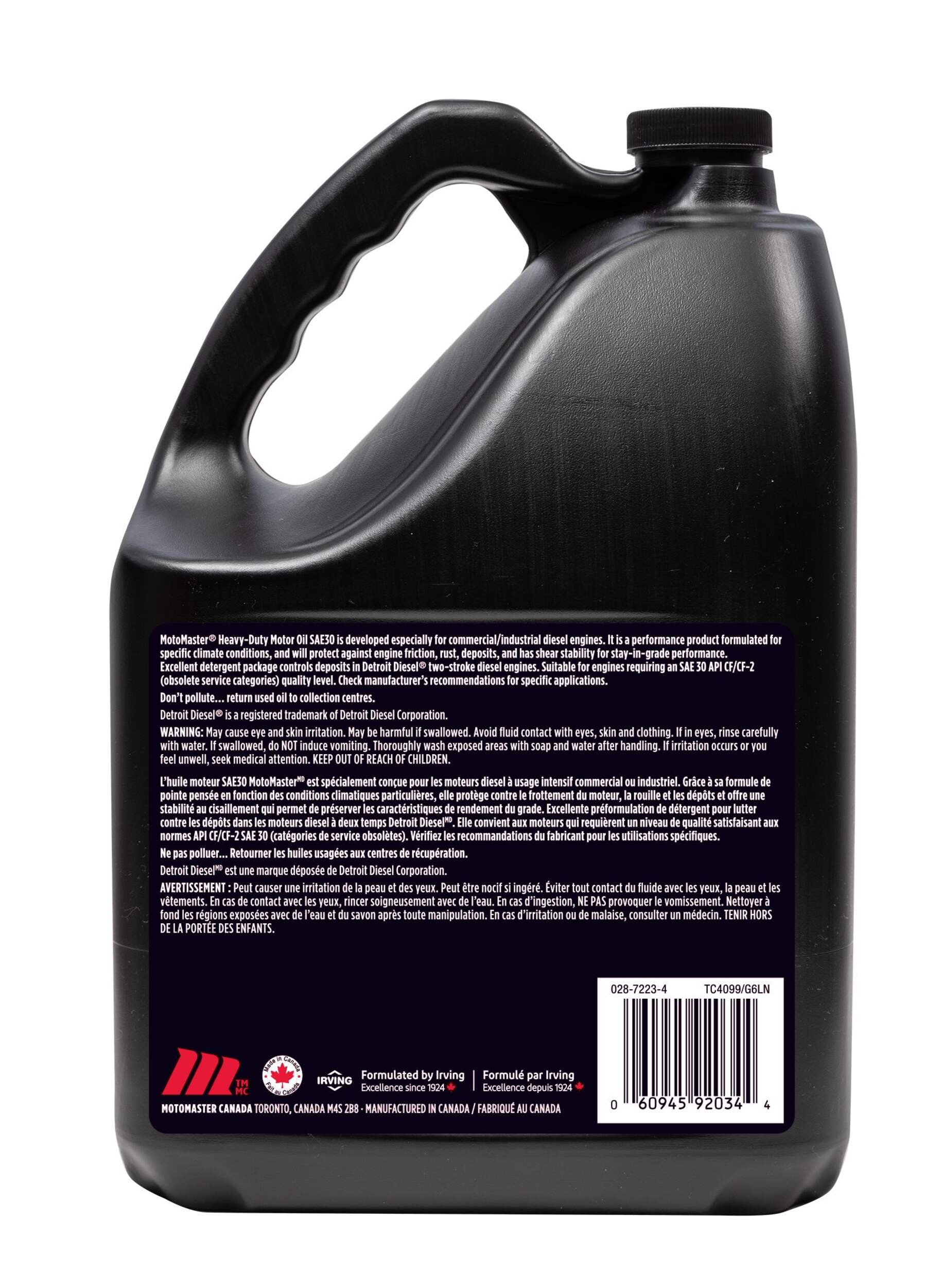 MotoMaster Heavy-Duty SAE 30 Engine Oil is designed for high-mileage diesel engines that call for an API CF, SAE 30 viscosity. Formulated from high-quality base stocks and additives, this SAE 30 oil delivers outstanding protection, performance and value for older diesel vehicles and equipment. Its high-viscosity and detergent formulation helps prevent the buildup of sludge and other harmful deposits, allowing your engine to run clean and extend its service life.
