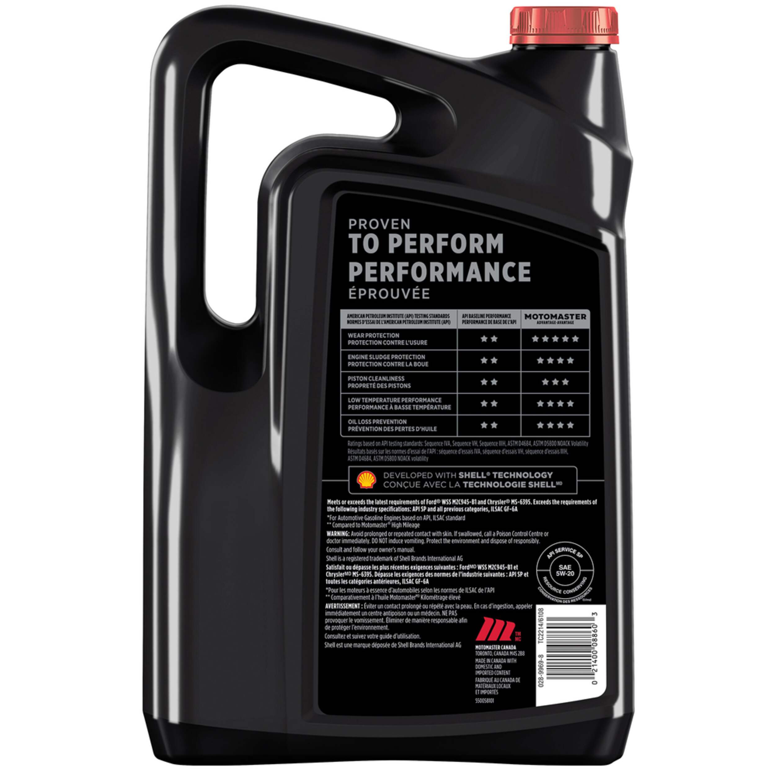 MotoMaster High Mileage 5W20 Synthetic Engine/Motor Oil is engineered specifically for engines with over 120,000 km on the odometer. This powerful synthetic oil is formulated to rejuvenate high-mileage engines by reducing oil leaks and burn-off in worn or damaged seals. It meets or exceeds the industry's standards for wear protection, sludge and varnish prevention, low-temperature performance, and oil consumption reduction. The engine oil's weight and synthetic base provide an advanced level of protection for high-mileage engines in extreme temperatures. This oil flows readily in cold temperatures for quick starts and protection within seconds of a startup - yet maintains its protective viscosity in high heat.