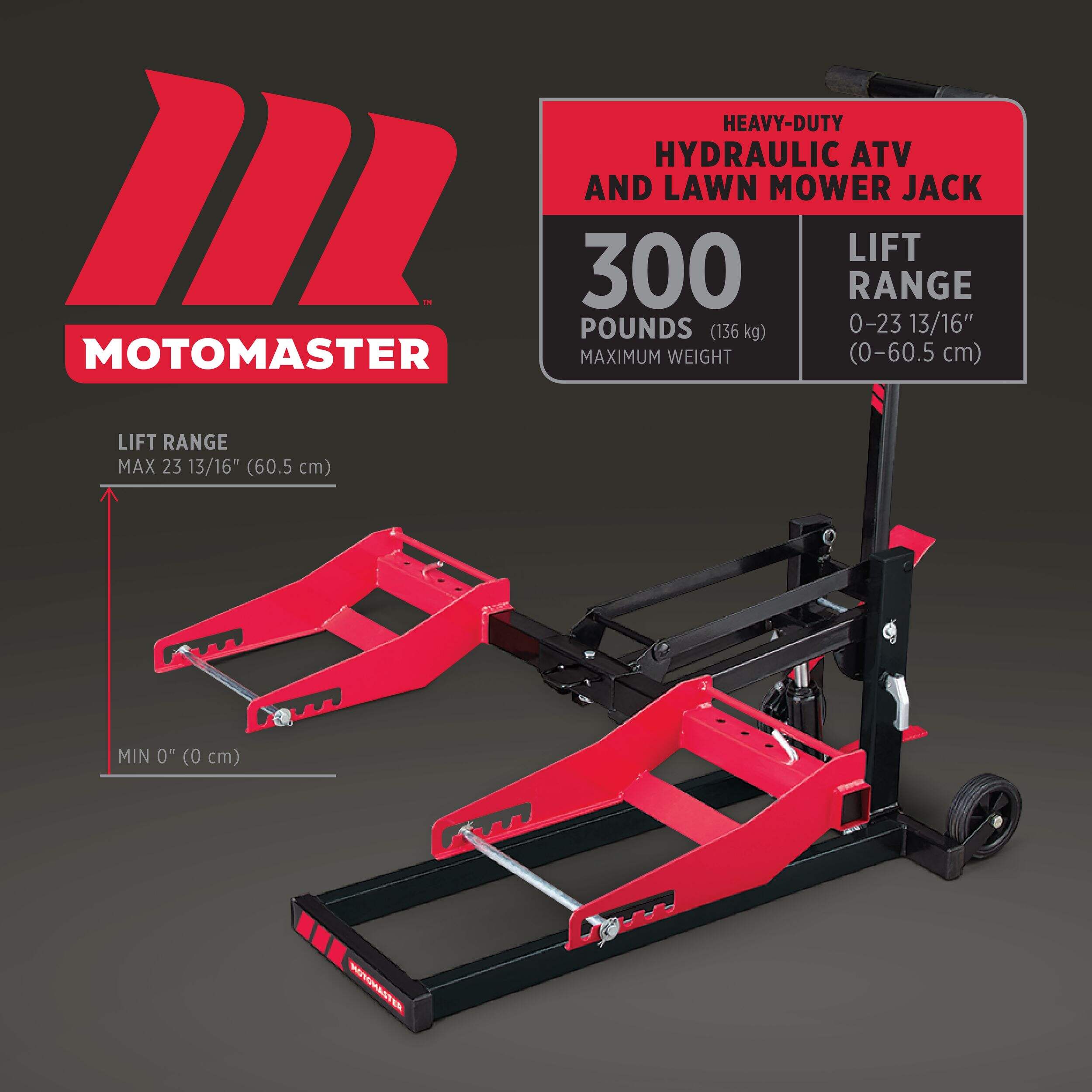 The MotoMaster Lawn Mower Jack with Hydraulic Pump is designed for effortless lifting and maintenance of lawn mowers and small equipment. Featuring a powerful hydraulic pump, it smoothly raises up to 300 lbs, allowing easy access for cleaning and repairs. Its sturdy construction and secure locking mechanism ensure stability and safety while in use. Ideal for DIYers and professionals, this lawn mower jack provides a reliable, convenient solution for maintaining your equipment.
