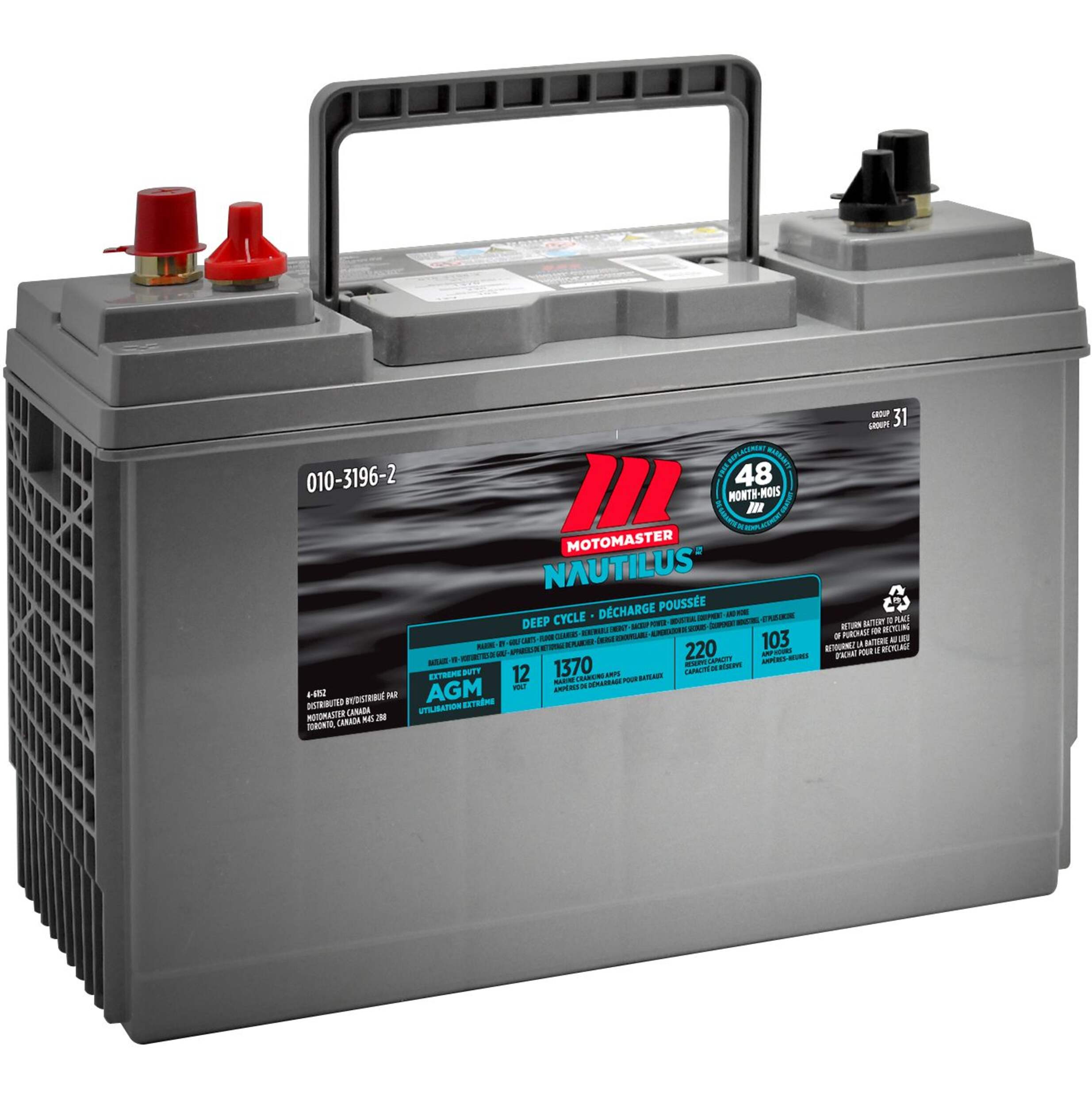 MOTOMASTER NAUTILUS EXTREME AGM Group 31 High Performance AGM Deep Cycle Battery features 99.99% pure lead AGM (absorbed glass mat) technology and precision robotic assembly to deliver extreme power, endurance and reliability