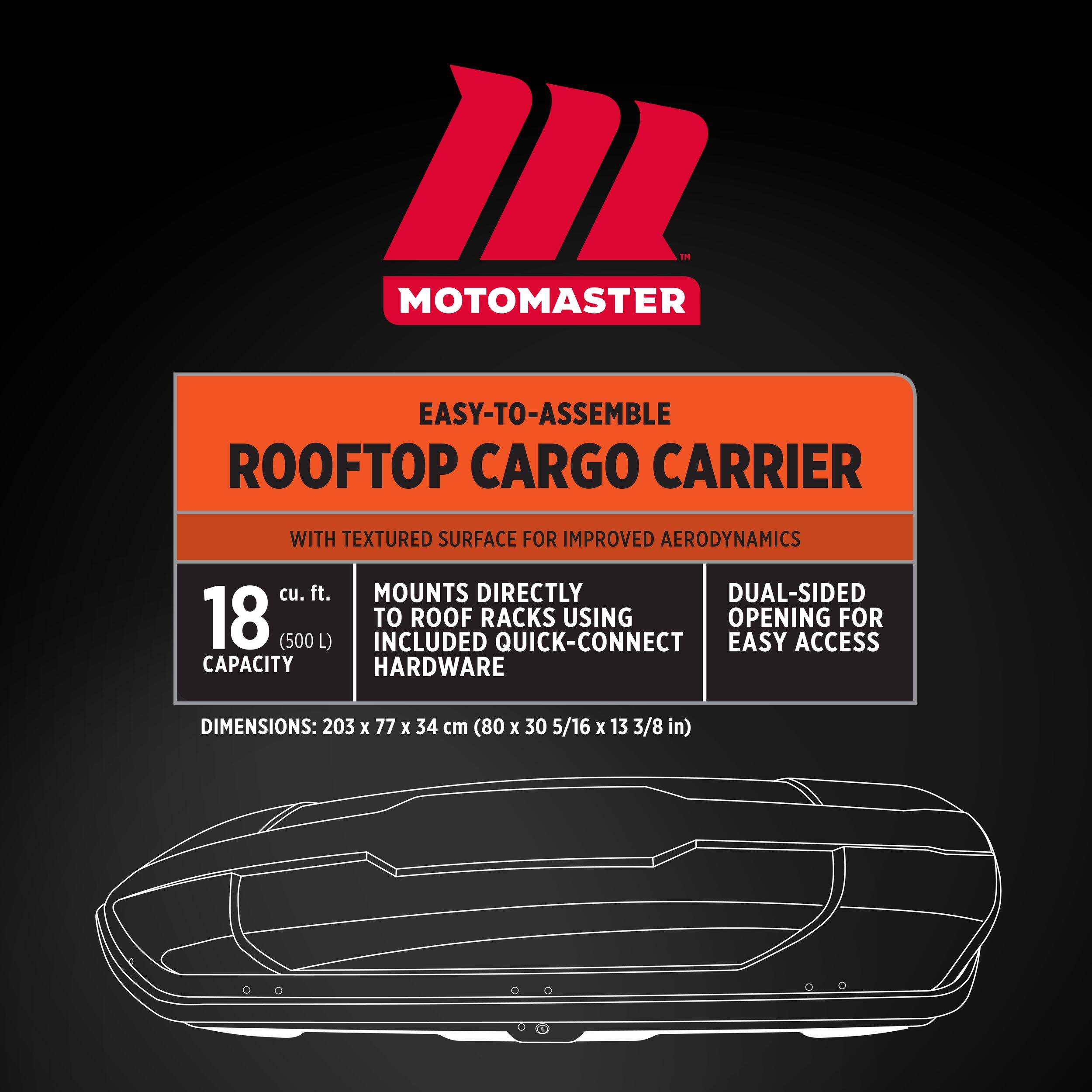Get ready for your next adventure with the MotoMaster Roof Cargo Box, with enough storage space to fit all your essentials. This cargo box features a dual-sided opening for easy loading and unloading to ensure hassle-free use. Quick-connect locking anchors keep your gear secure, and the scratch-free design protects your vehicle. The durable MotoMaster Roof Cargo Box ensures your items are safely stored, making every road trip stress-free.