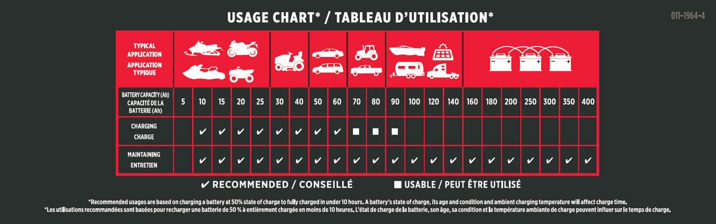 Recommended for charging batteries rated 10 to 60 Ah and maintaining batteries rated 10 to 400 Ah