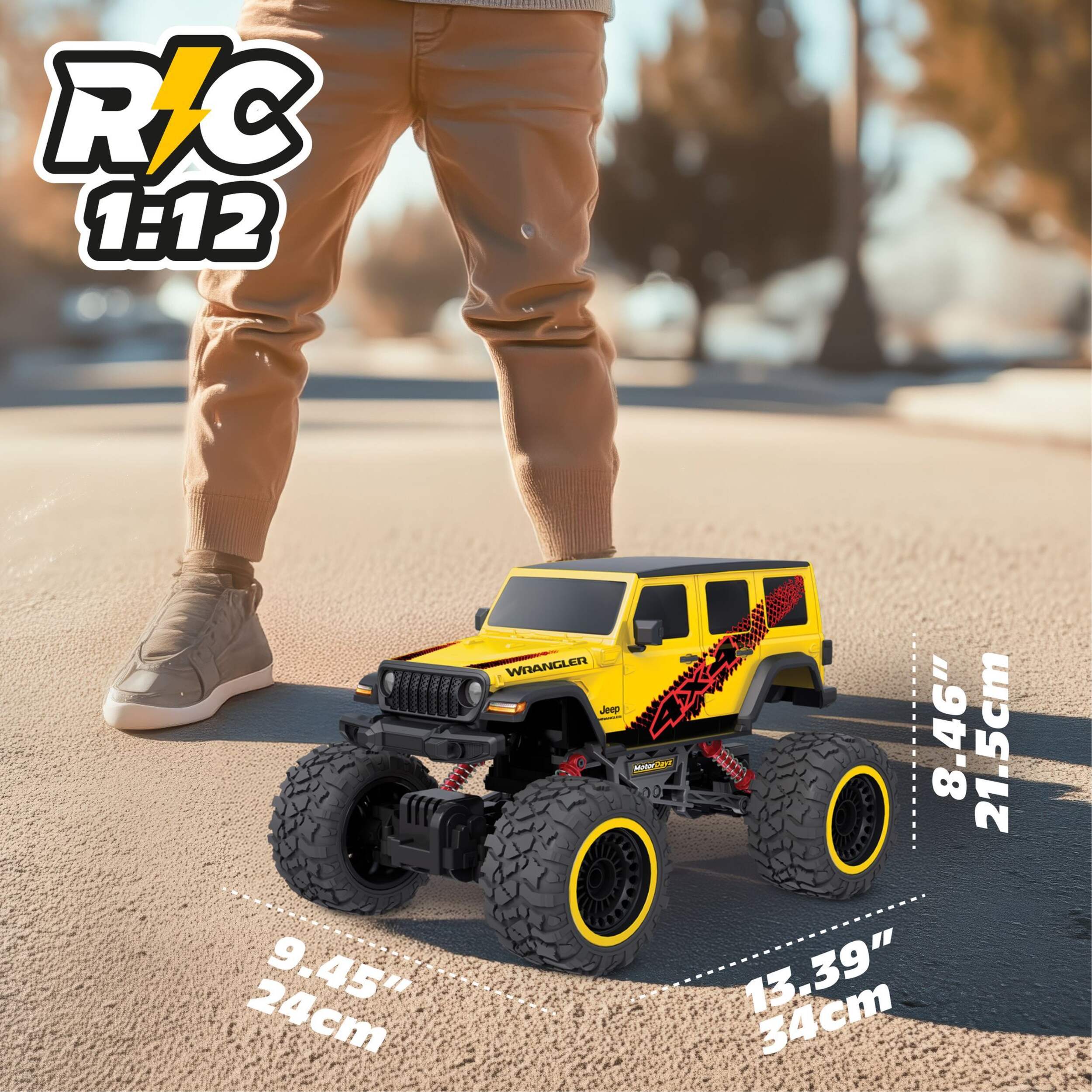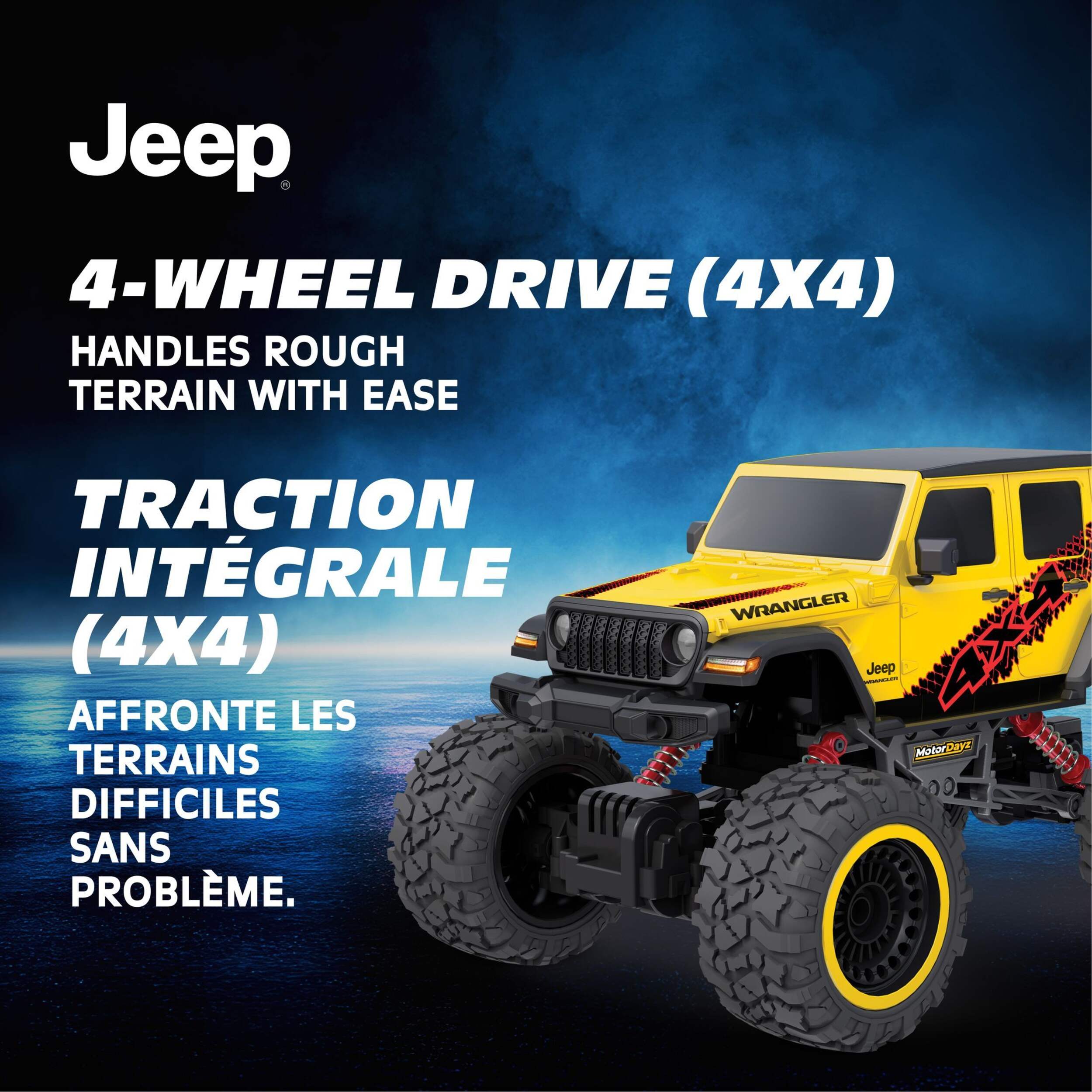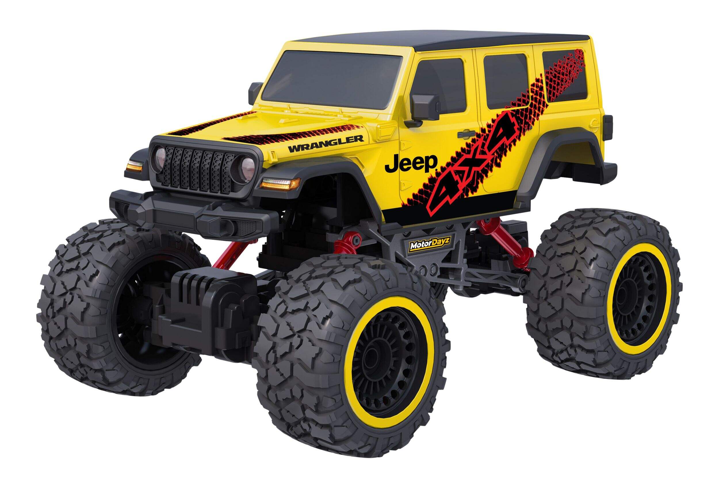 1:12 4x4 4-Door Jeep- Full Function Radio Control. Left, Right, Forward, and Reverse Steering. MotorDayz 1:12 scale full function 4-Door Jeep SUV has the features of a authentic JEEP SUV. Features include grippy non-marking tires, working flex suspension, and rechargeable battery by an attached USB cable. You will never have you to look for a missing charger again. This rugged remote controlled truck is built for all types adventures. Connect up to six vehicles with 2.4 GHz technology and race interference free. Ready to Run. Package includes 1:12 4x4 4 Door Jeep SUV, transmitter, usb charging cable, and 2 "AA" alkaline batteries. All batteries required