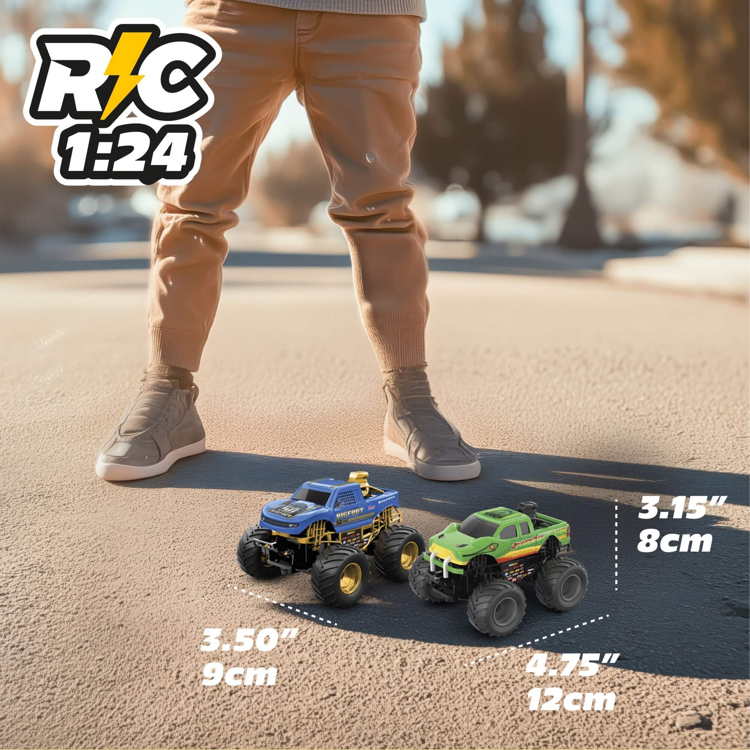1:24 Bigfoot Monster Truck Twin Pack - Full Function Radio Control. Left, Right, Forward, and Reverse Steering. MotorDayz 1:24 scale full function monster truck twin pack has the features of 2 officially licensed Bigfoot Monster Trucks, The Original Bigfoot and Snake Bite. Features include grippy non-marking tires, 2 speed turbo control, and monster truck arena accessories. This twin pack is built for all types of chidlren play and is great for indoor and outdoor locations. The game-grip style transmitter fits in all hands and has a built in turbo button for accelerating on the straight aways. Connect up to six vehicles with 2.4GHz technology and race interference free. Batteries not included. Requires AA x 6 (Vehicle); 4 x 1.5V AAA (Transmitter). Includes 2 Bigfoot Monster Trucks, 2 Transmitters, and Monster Truck Arena accessories.