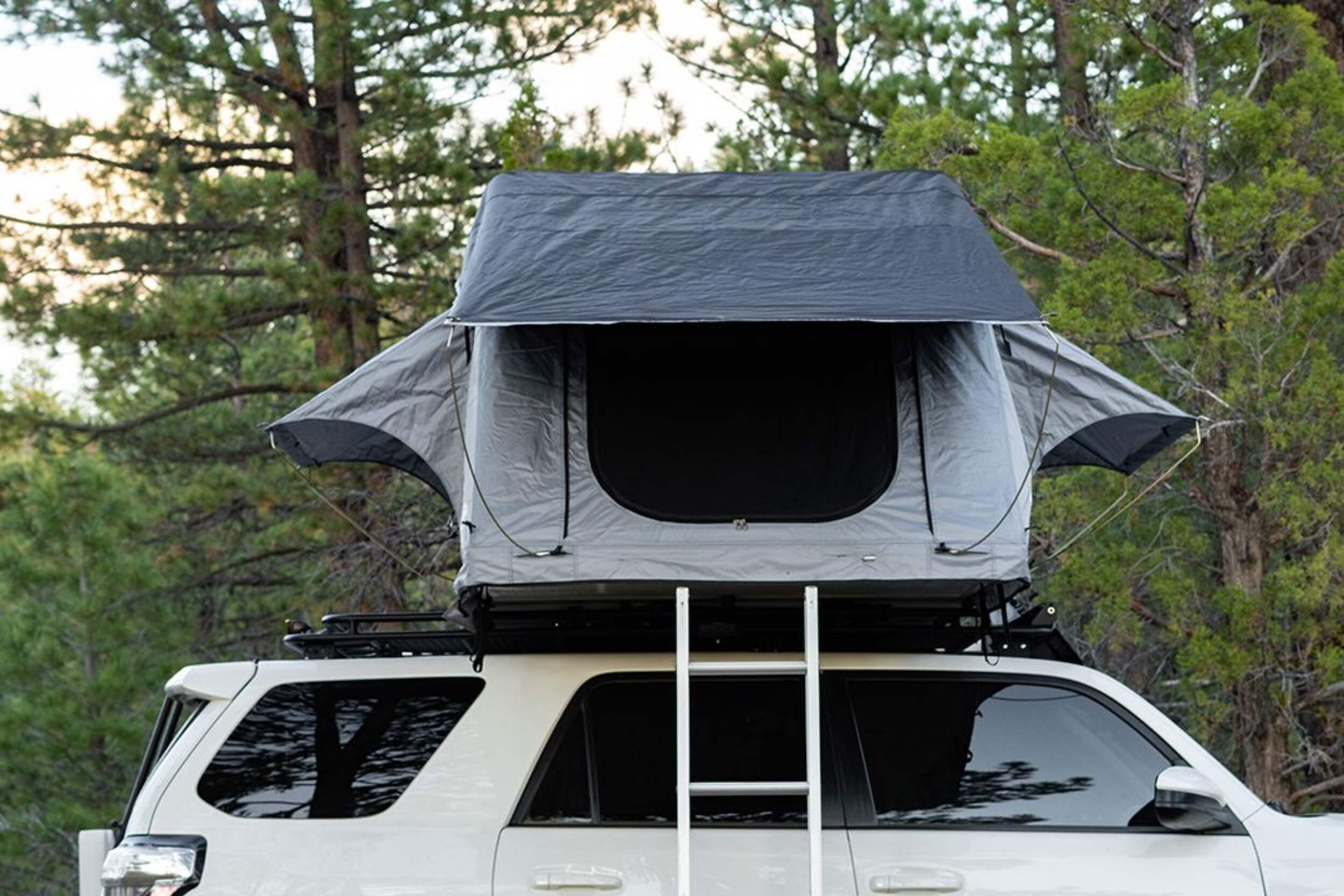 Get off the ground and stay dry with the Napier 2-Person Car Rooftop Pop-up Camping Tent w/ Rain Fly, Full Foam Mattress & Adjustable Ladder. This durable, weather-resistant tent features ripstop polyester canvas and mesh panels for ventilation. Cross bars are required for hassle-free installation on your roof. Three windows and one door allow breathtaking views and airflow. The included rainfly provides extra protection from the elements. Sleep comfortably on the thick wall-to-wall foam mattress with a washable cover. The adjustable 6.9' aluminum ladder provides safe and easy access. When not in use, the collapsible tent packs neatly into the included travel cover. With a 165 lb dynamic and 600 lb static weight capacity, this rooftop tent is an ideal camping companion for your outdoor adventures.