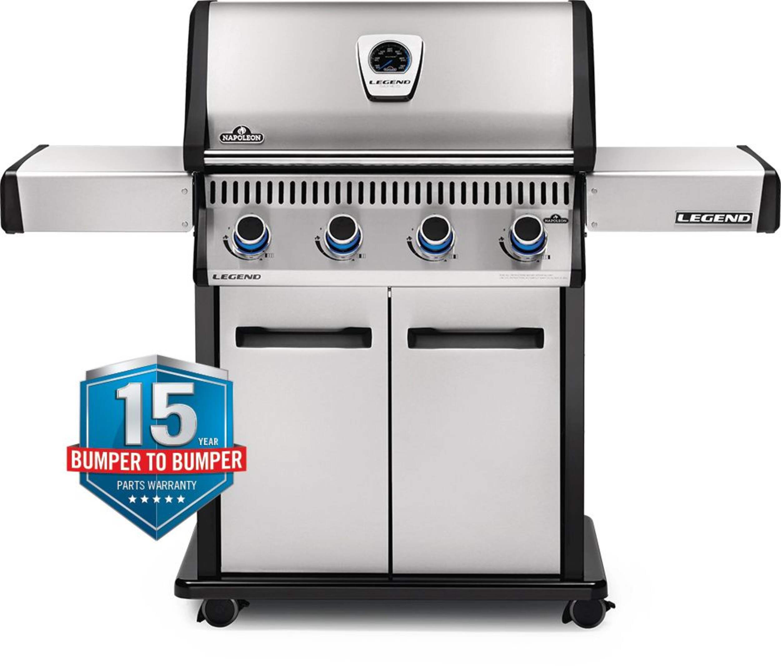 The Grill. The Myth. The Napoleon Legend LD4. This stainless steel, 4 burner propane grill is built to last. Inside, porcelianized cast iron cooking grids provide the ideal sear with their Iconic WAVE™ pattern that lets you know it's a Napoleon. Stainless steel sear plates are staggered to prevent flare-ups, creating flavor, not flames. Enjoy easy lighting using the JETFIRE™ ignition system and ergonomic knobs. Control temperature within the grill for multiple cooking styles and options thanks to the ACCU-PROBE™ temperature gauge. Save space by folding down the generous side shelves, making this grill the perfect option for outdoor areas where space is at a premium.