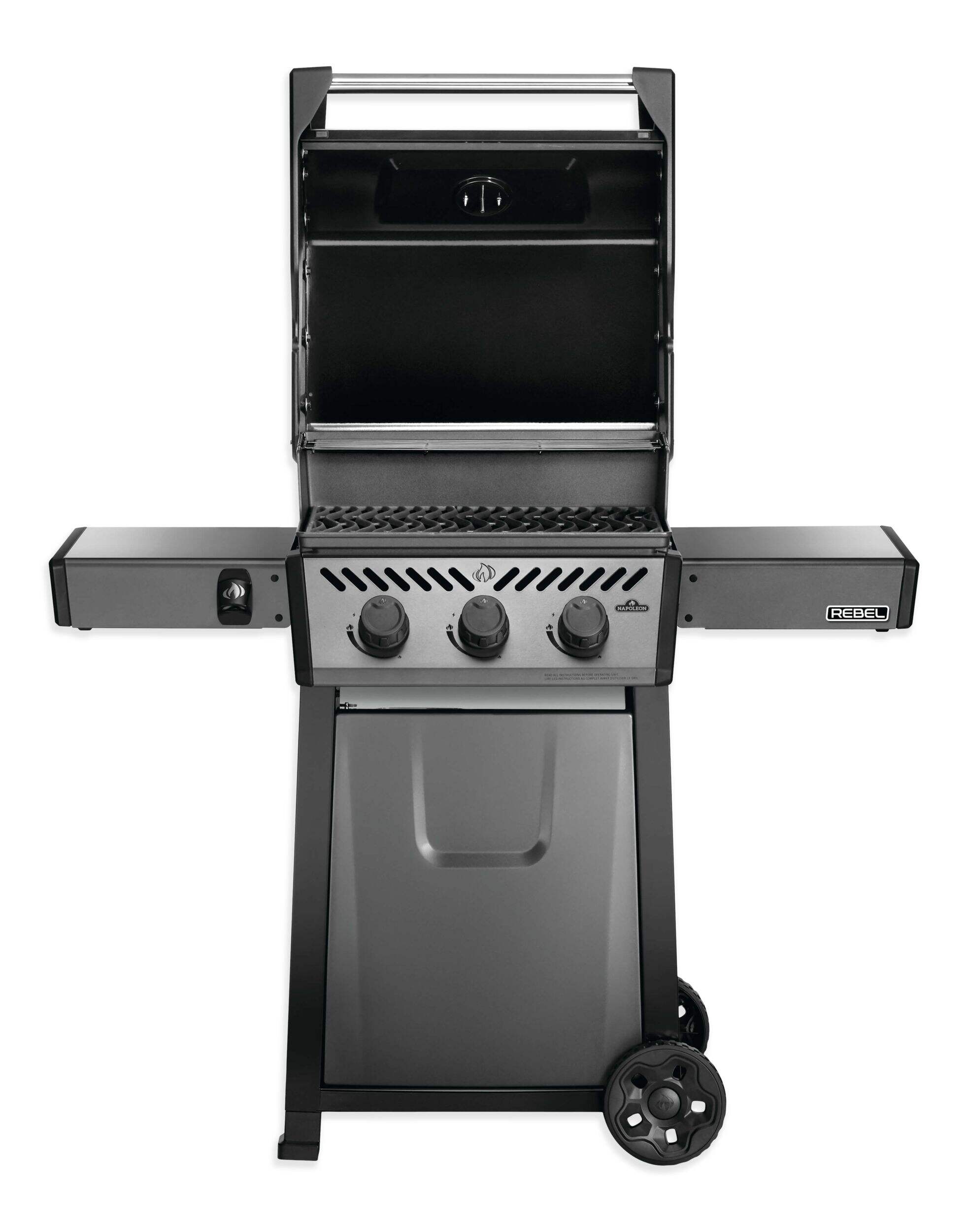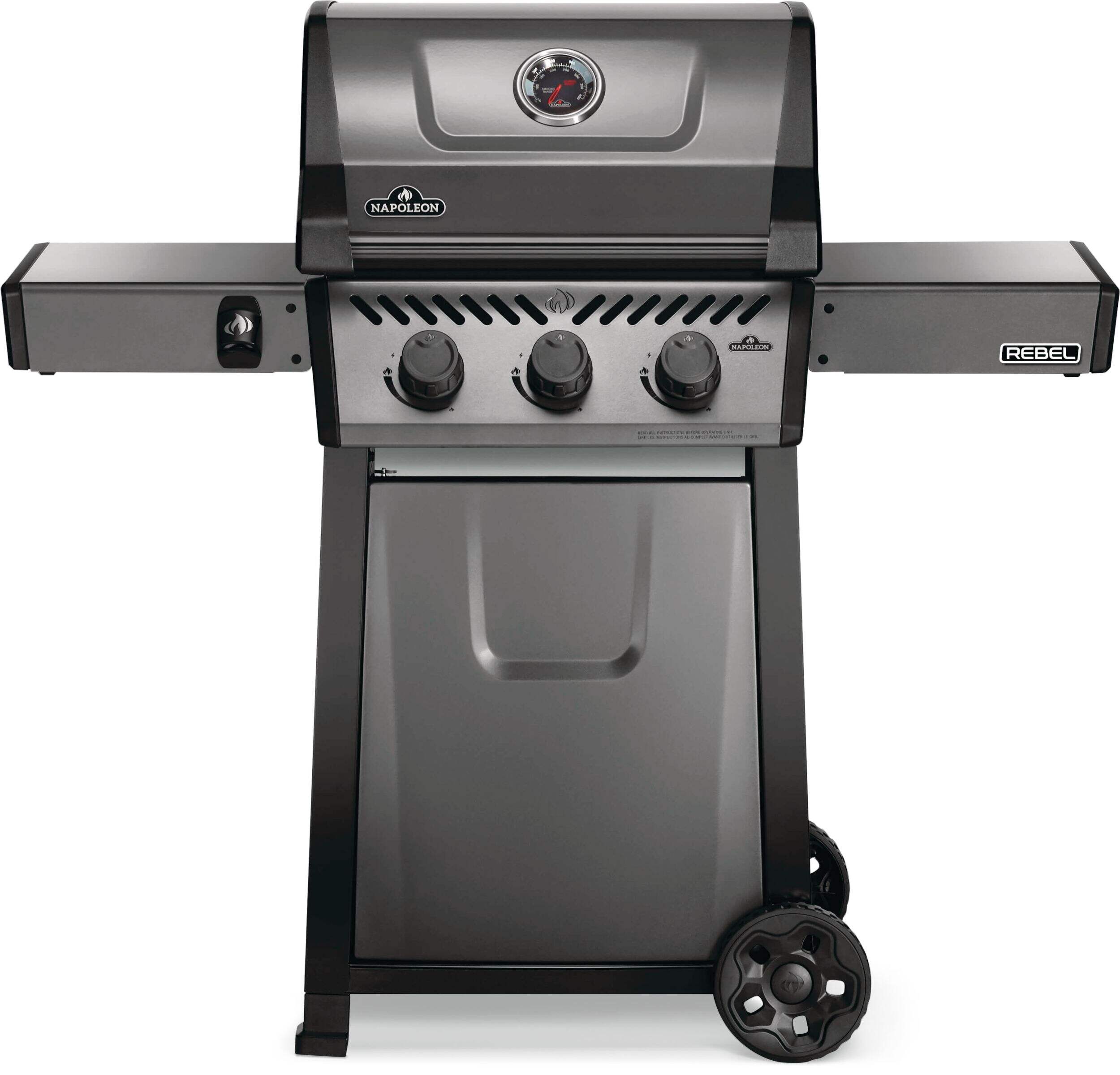 The Napoleon Rebel 3 Natural Gas Barbecue packs premium features into a compact, value-driven design. With the instant JETFIRE ignition system, lighting the main burners is effortless. Achieve perfect searing on the durable cast iron porcelain-clad enamel cooking grids. Three stainless steel burners provide powerful, adjustable heat monitored by the built-in temperature gauge and controlled by ergonomic knobs. Rugged wheels make it easy to move this grill around the yard. Convenient foldable side shelves, complete with tool hangers and a bottle opener, add even more useful features to the BBQ.