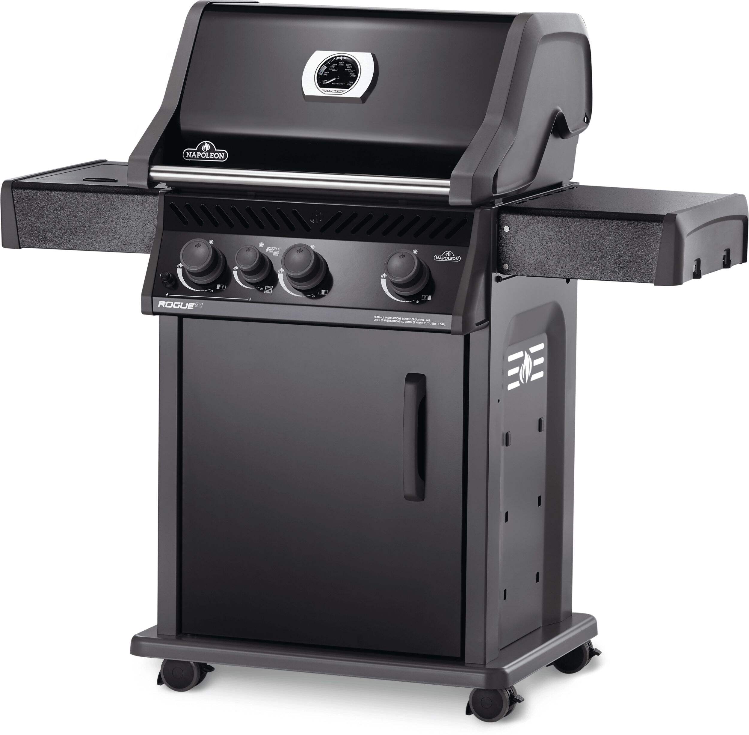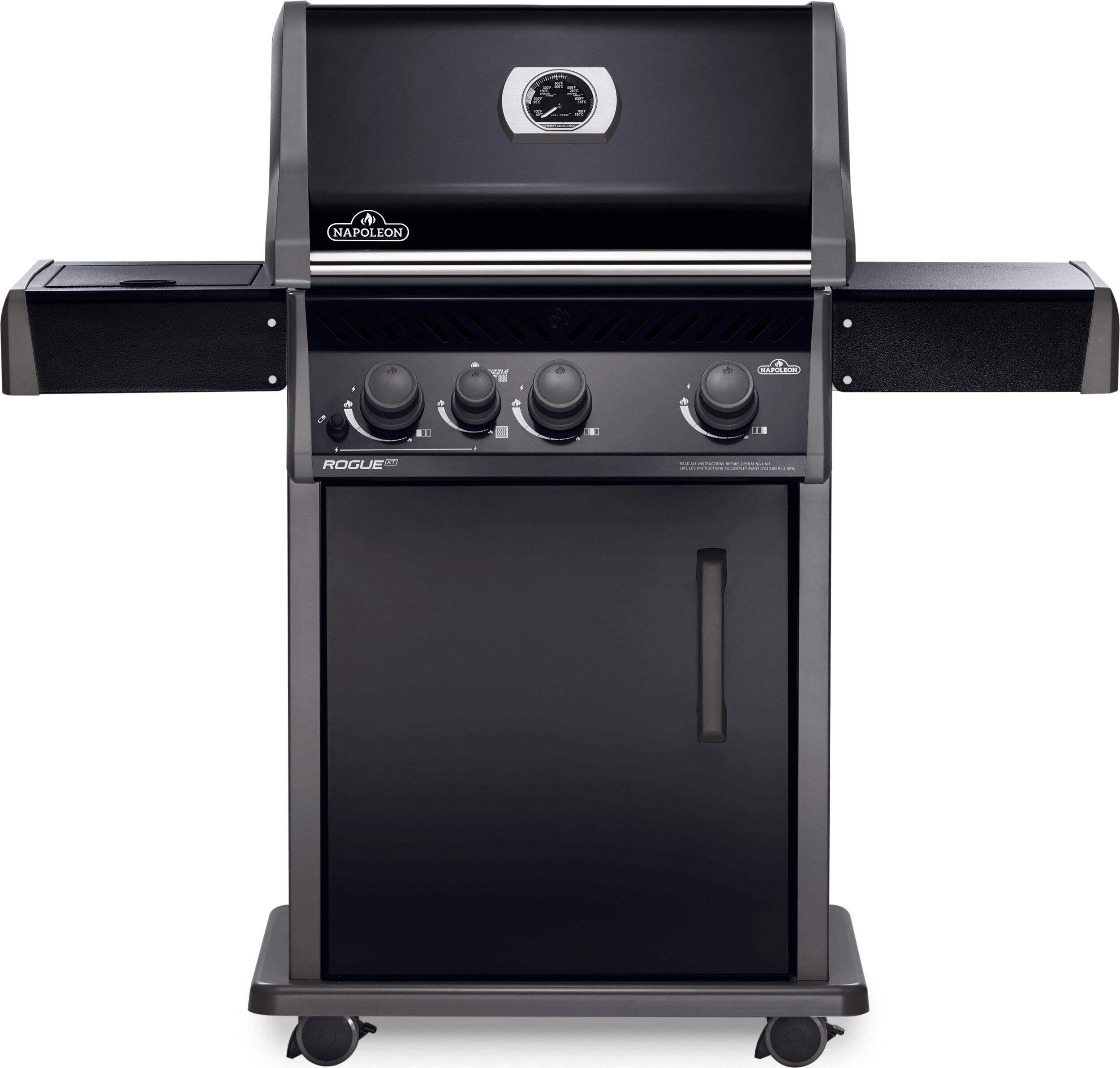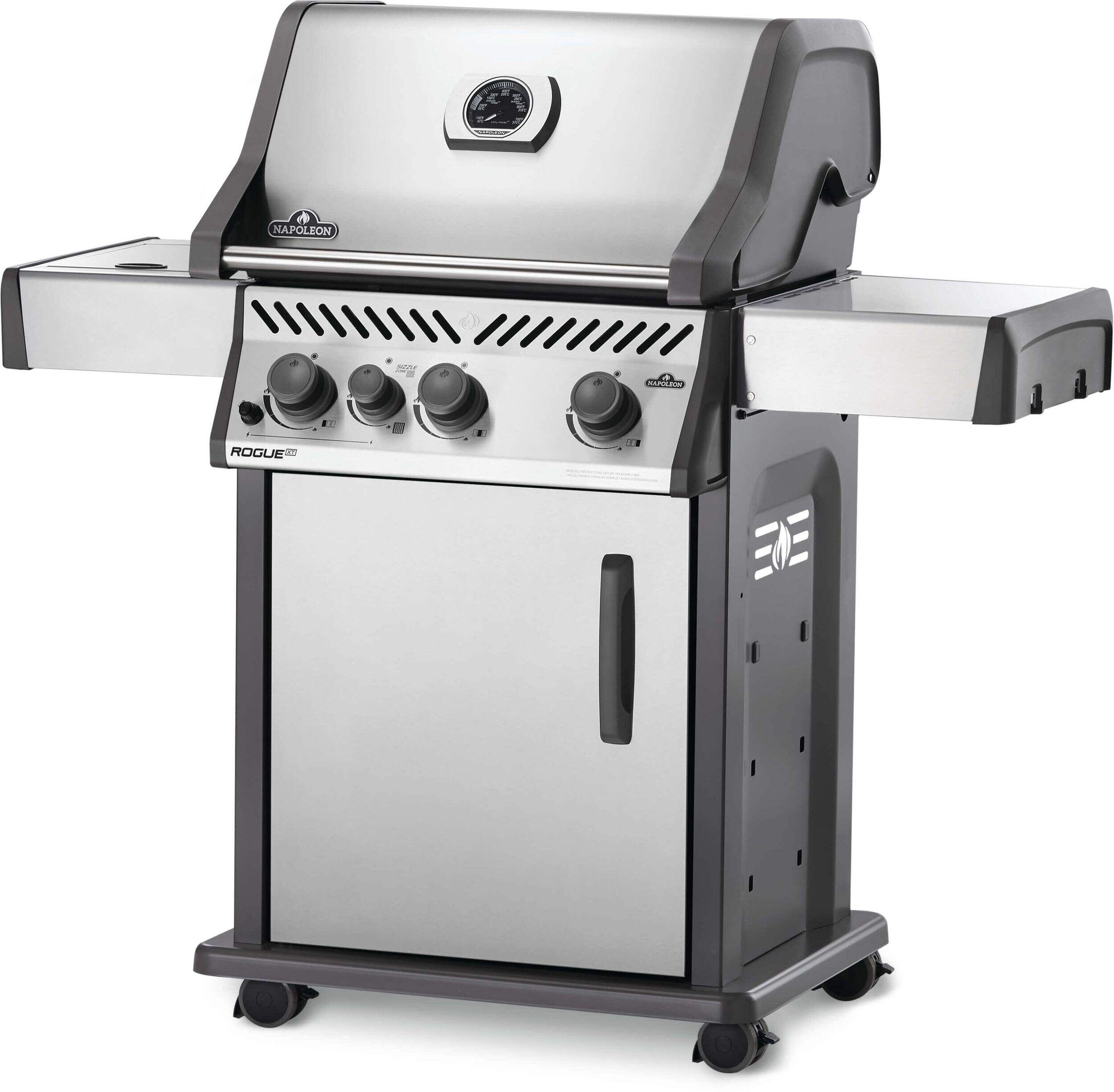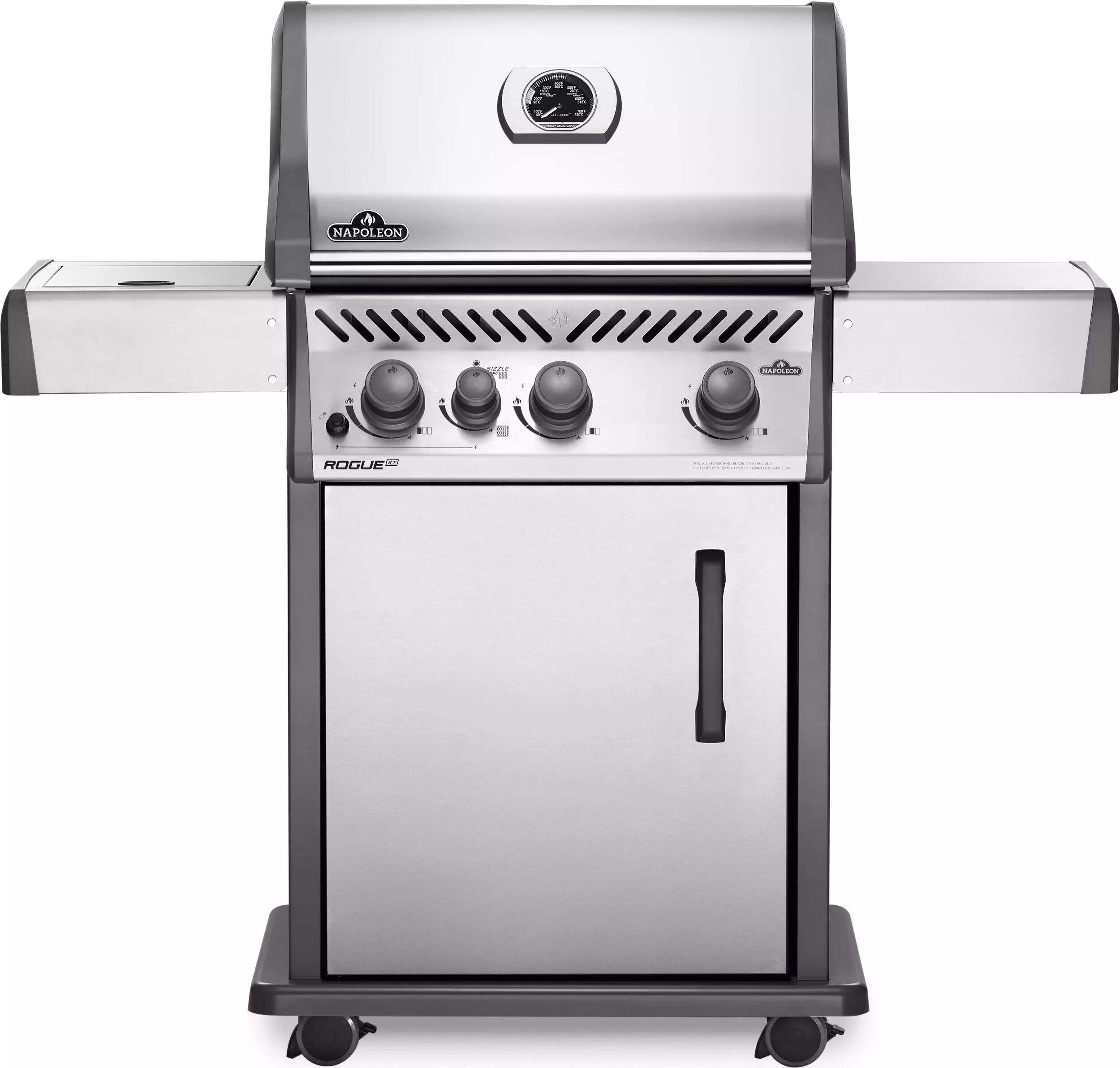 Napoleon's Rogue XT 425 Stainless Steel Propane Gas Grill with Infrared Side Burner has three burners, cast iron grids and a high top lid. This grill lights easily, every time, with a battery-free ignition. Grill the perfect steak using the integrated sizzle zone side burner or use it to make sauces and sides while grilling, and searing on the main area. The durable materials are both stylish and easy to maintain.